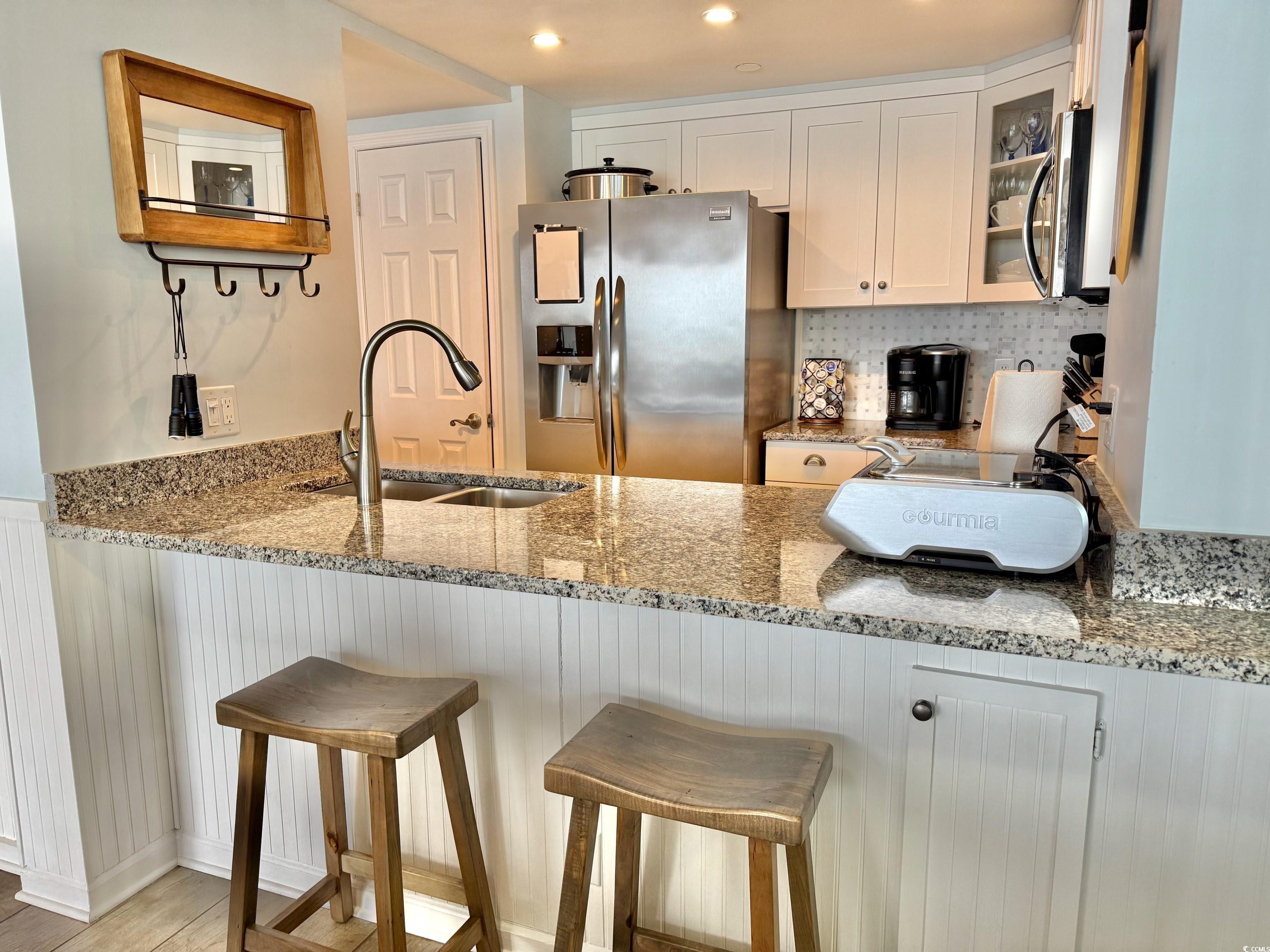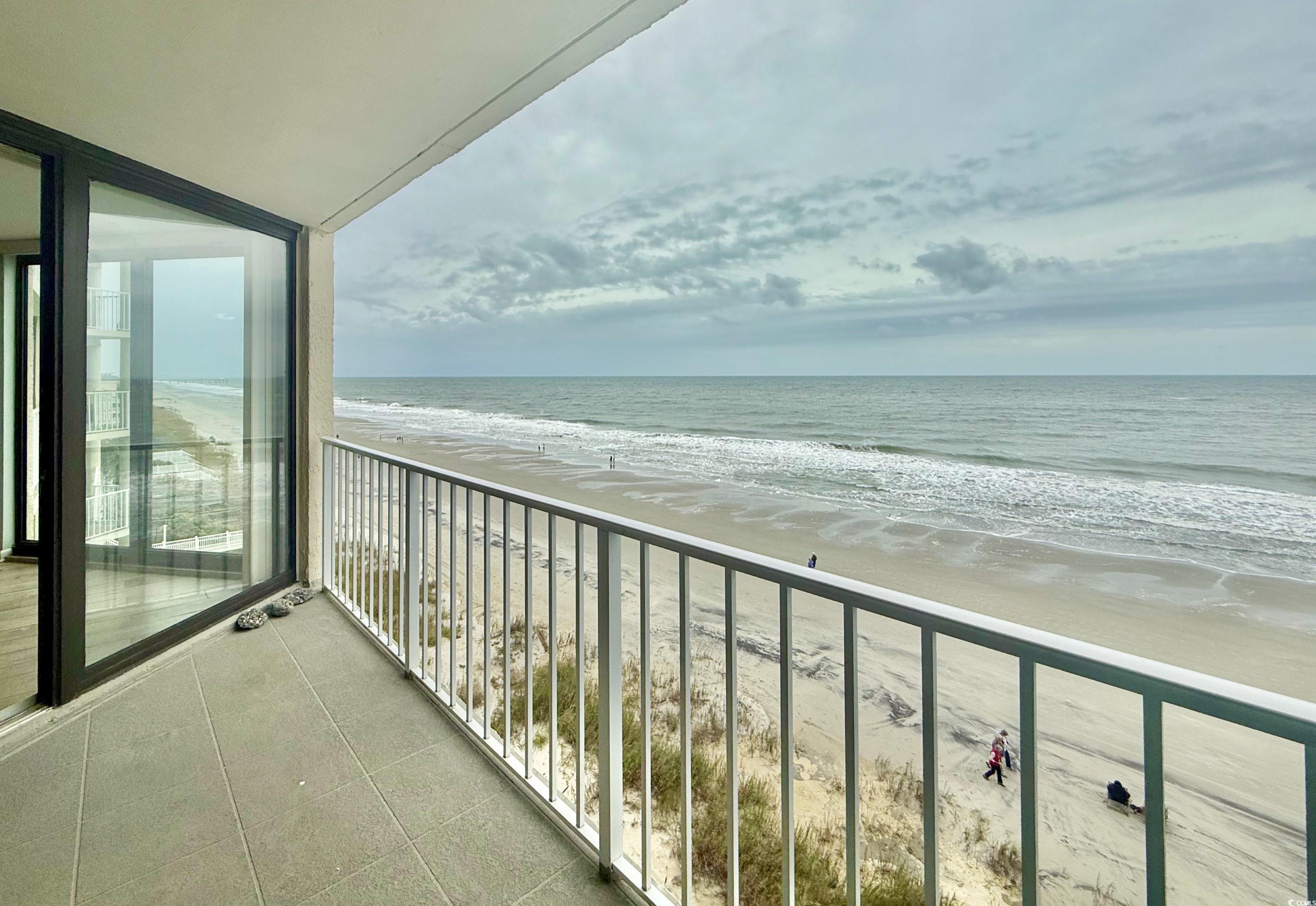 Beautifully renovated direct oceanfront two-bedroom, two-bathroom condo in One Ocean Place in Garden City. Enjoy stunning panoramic ocean views the moment you walk in. Open floor plan with V-shaped glass wall, wood-look tile throughout, smooth ceilings and updated kitchen with white shaker cabinets, granite counters, island, and stainless steel appliances. The living room and primary bedroom have remote controlled electric blinds. The primary oceanfront suite has a balcony access, a walk-in tiled shower, and ocean views from the bathroom. The second bedroom can hold two double beds and has access to the hall bath with a large tiled walk-in shower. One Ocean Place offers two elevated pools, hot tubs, an owner's lounge, and a fitness center. Well-managed building in the desirable "family beach" area - perfect for primary residence, second home, or investment.
