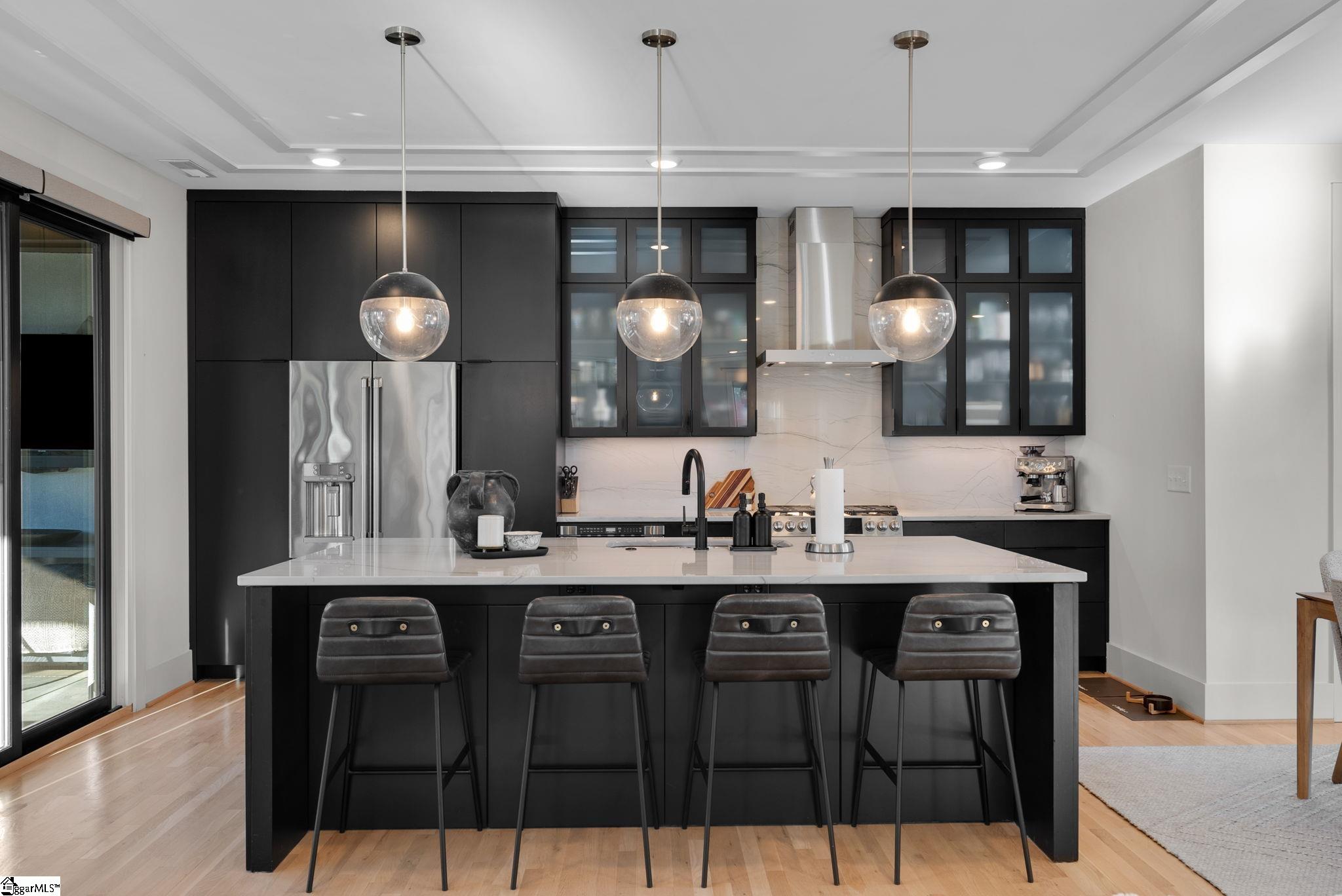 Join us for coffee and light bites at our mid-day open house from noon to 2:00 PM on Saturday, October 18. 2 Calhoun Hill Way is a premier urban residence that seamlessly blends 1920s-inspired metropolitan architecture with modern, sustainable utility. This home is situated in the City Homes at Calhoun, a Cole Properties innovative townhome community in the heart of the Historic West End, providing convenient, walkable proximity to the City of Greenville's exceptional amenities. This elevator-equipped, three-story, three-bedroom, three-and-a-half-bathroom end-unit features nine-foot ceilings, a two-car garage, and dual terraces, making it a rare find, ready for its subsequent owners. Through floor-to-ceiling casement windows and sliding doors, natural light welcomes you on each level. The ground floor showcases stained concrete floors, a flex room for a study or guest bedroom, a full bathroom with a walk-in tile shower, and access to the epoxy-coated garage and the fenced-in, turfed backyard. Head to level two via the hardwood-enveloped elevator or the brightly lit stairwell. Take in the second-story finishes throughout the living area, kitchen, half bath, and dining room—featuring white oak hardwoods, a gas fireplace with a large-format slate tile surround, sleek coffered ceiling moldings, custom window treatments, a chic ceiling fan and pendants, and recessed LED lighting. The kitchen's quartz covers the massive island, countertops, and range wall to the ceiling. The stained, slab-style cabinetry extends floor to ceiling, featuring opaque glass and custom lighting that accentuates the ceiling height. Conveniently access the two spacious covered terraces with slate-style flooring through the kitchen or dining area—ideal for indoor-outdoor entertaining or unwinding. Brilliantly designed, the third floor grants residents and guests a respite and a chance to recharge before returning to the city's liveliness. The primary bedroom, situated on the corner of the unit, presents a scenic view of the neighborhood and is complete with a full bathroom and walk-in closet. The suite's generous bathroom has a dual, floating vanity, quartz countertops, large-format tile flooring, and a tile walk-in shower. The stackable laundry closet sits between the primary and guest bedrooms. Enjoy privacy in the guest suite, which has ample closet space and a full bathroom. Encompassing +/- 2,050 square feet of meticulously designed living space, this residence is a perfect blend of high-end finishes and urban convenience, including three bedrooms and four baths (three full and one half). The West End is a vibrant, charming district known for its pedestrian-friendly streets, stunning architecture, and lively, modern lifestyle. You are perfectly positioned to walk to high-class dining like Halls Chophouse and Jianna, catch a game at Fluor Field, or enjoy the green spaces of Falls Park and the diverse food and activities at Gather GVL. A short distance to the expansive new Unity Park further enhances your outdoor options. Enjoy breathtaking views of the fireworks from the ballfield at Fluor Field and the spectacular Fourth of July display at Unity Park. This premier townhome at 2 Calhoun Hill Way represents a rare opportunity to own a piece of Greenville's most desirable lifestyle, with luxury, sustainability, and unparalleled access to the city's best.