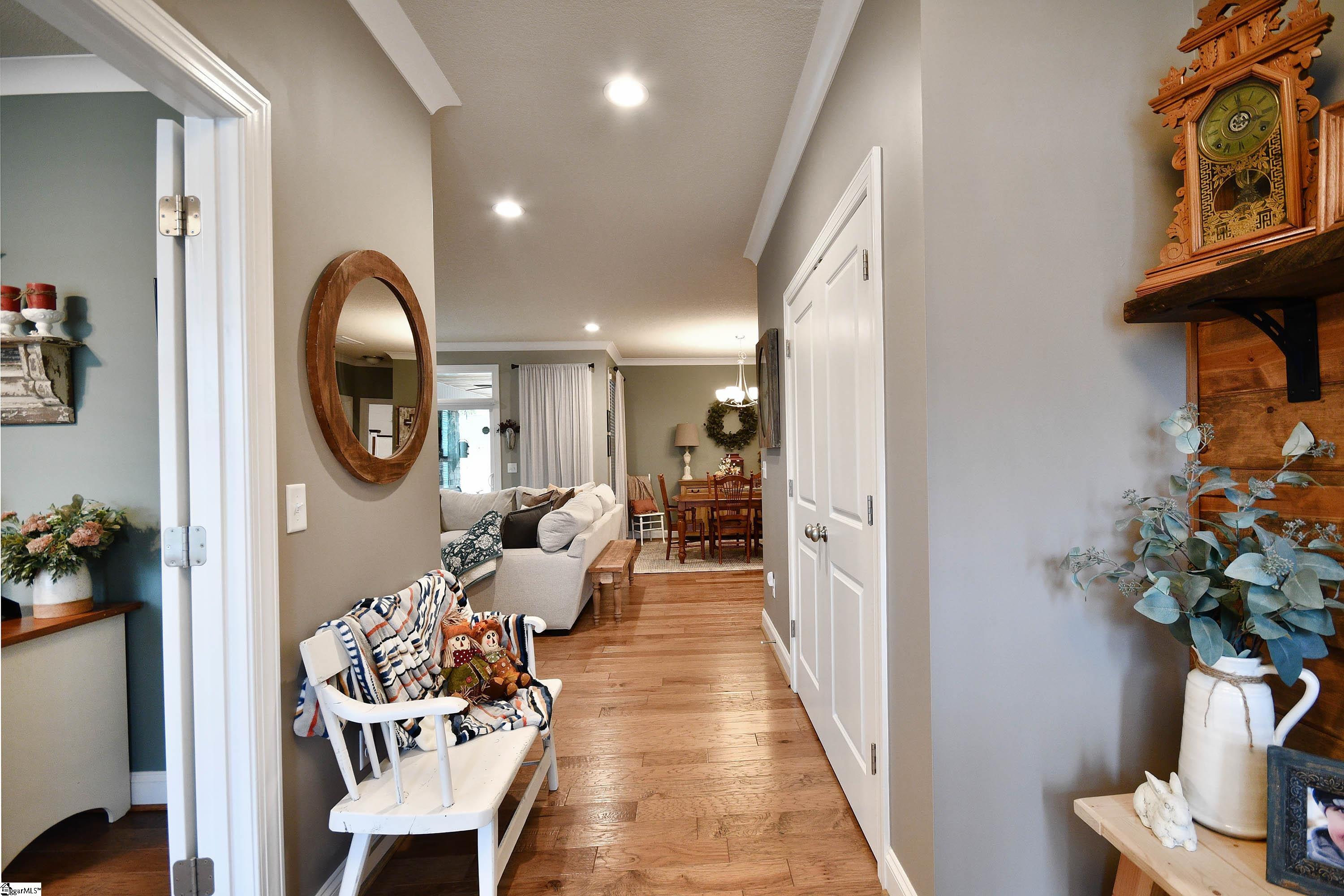 Welcome to your beautiful HOME SWEET HOME!! From the moment you walk into this home, you will feel the warmth and coziness as the colors in this home are gorgeous! The front entrance has a rocking chair front porch and a beautiful stain glass door sure to impress before even entering the home. Once entered you'll love the custom shiplap in the foyer. Its beautiful wood adding warmth right as you walk in. There is crown molding throughout the entire downstairs, you'll also have plantation shutters on the front windows in both down stairs and upstairs. The open floor plan is so inviting with the beautiful wood cabinets in the kitchen, custom travertine tile back splash, granite counter tops, French door refrigerator (only 2 years old), large kitchen sink window, small sink in the island, double ovens, etc. You'll be able to host for the holidays and family gatherings in this custom kitchen overlooking the Great room with a warm and welcoming rock fire place. This home also has 10' ceilings, upgraded ceiling fans in all bedrooms and loft, custom coordinated shiplap in the bedroom and owners bathroom suite, gorgeous engineered hardwoods throughout the downstairs, etc. In the loft upstairs you'll find upgraded carpet both there and on the stairs (2023). You also notice the home has been freshly painted throughout. You'll be sure to enjoy the covered back patio with a beautiful rock fireplace and high-end gas logs. It has a swing and two ceiling fans and the outdoor furniture with blue cushions will remain with the home. Some additional features include ring system, gutter guards, bar stools, HOA covers lawn care, landscaping, and sprinkler maintenance. You DO NOT want to miss out on this Craftsman style home with a cottage feel!! Make your appointment to see this home now as it will not be on the market long! Its located in a prime location and it is so beautiful that anyone who sees it will be sure to fall in love with it!!