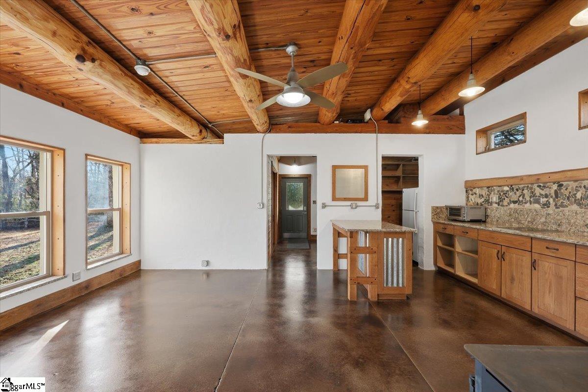 Uniquely designed and crafted 20 Hudson Road is nestled in the suburban area of Travelers Rest. The real wood beams, stained concrete floors, and vintage style pocket doors add charm & character to this home. The interior cabinet doors and oak trim were crafted using trees from the property. The kitchen offers Cambria quartz counter-tops, and a vintage sink. Enjoy your view from the living room while basking in the beauty of the natural light coming through the windows. The fenced backyard has room to roam and provides a shed improved with insulation, flooring, and wired for electricity. Make your appointment today to see everything 20 Hudson Road offers you!! **Home is being offered below appraisal**