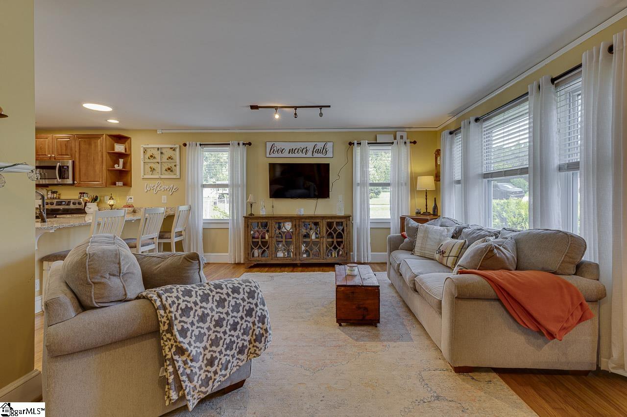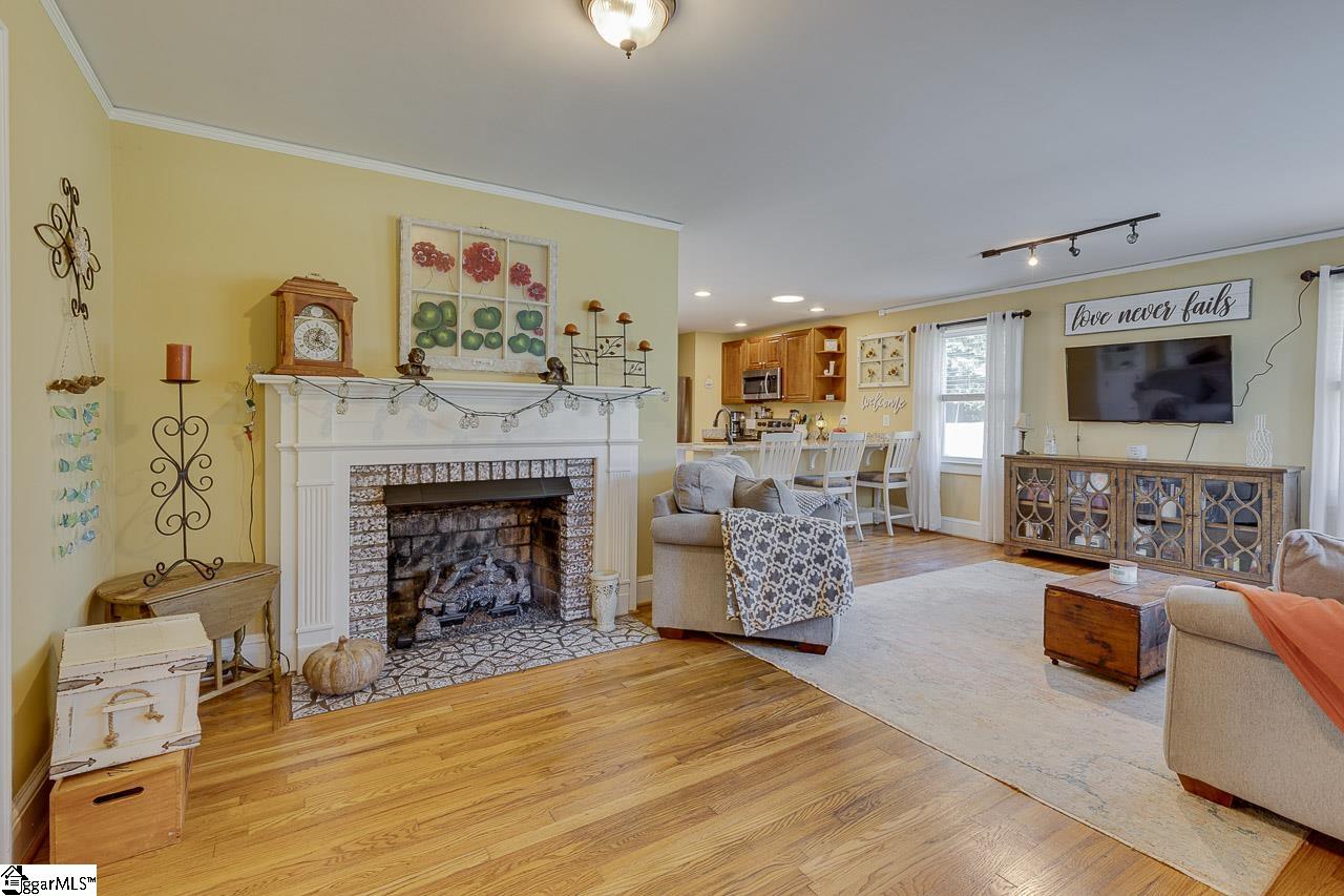 Bask in the charm of a classic 1960’s bungalow in this home that beautifully balances vintage character with modern updates. With three bedrooms, two full baths, and plenty of personality, it’s the kind of place that feels both stylish and welcoming the moment you arrive. Step inside to the foyer with coat closet which leads into a bright and open living room. Hardwood floors stretch throughout the home, paired with traditional style moldings and an airy layout. The gas log fireplace, with its brick surround and handsome wooden mantle, creates a timeless focal point that is just right for cozy evenings or gathering with friends. The kitchen is a real standout, combining modern finishes with nostalgic charm. Granite countertops, stainless steel appliances, a breakfast bar, and a pantry provide everyday convenience, while a built-in china cabinet trimmed with gingerbread detail adds a whimsical vintage touch that is perfect for displaying colorful dishes, heirloom pieces, or your favorite mid-century finds. The Primary Suite is cheerful and inviting, with sunlight streaming through the windows, two closets for storage, and a private ensuite bathroom with a linen closet and an updated sink vanity. Two additional bedrooms and a full hall bath with tub/shower combo offer flexibility for guests, hobbies, or working from home. Out back, the seller added a new deck in 2022 which features TREX material, making it virtually maintenance free. This area provides plenty of space for dining, entertaining, or simply enjoying a quiet evening under the trees. The large backyard is dotted with mature shade trees, and the detached one-car garage, which was designed to complement the home's exterior style, adds convenience and extra storage. Tucked into a prime location near all of the shopping and dining amenities on Wade Hampton Blvd, and just minutes from downtown Greenville, Taylors, and Greer, this home offers the best of both worlds: vintage character and modern comfort, wrapped up in one delightful package. Don't miss out on your chance to tour this move-in ready home. Schedule your showing today!