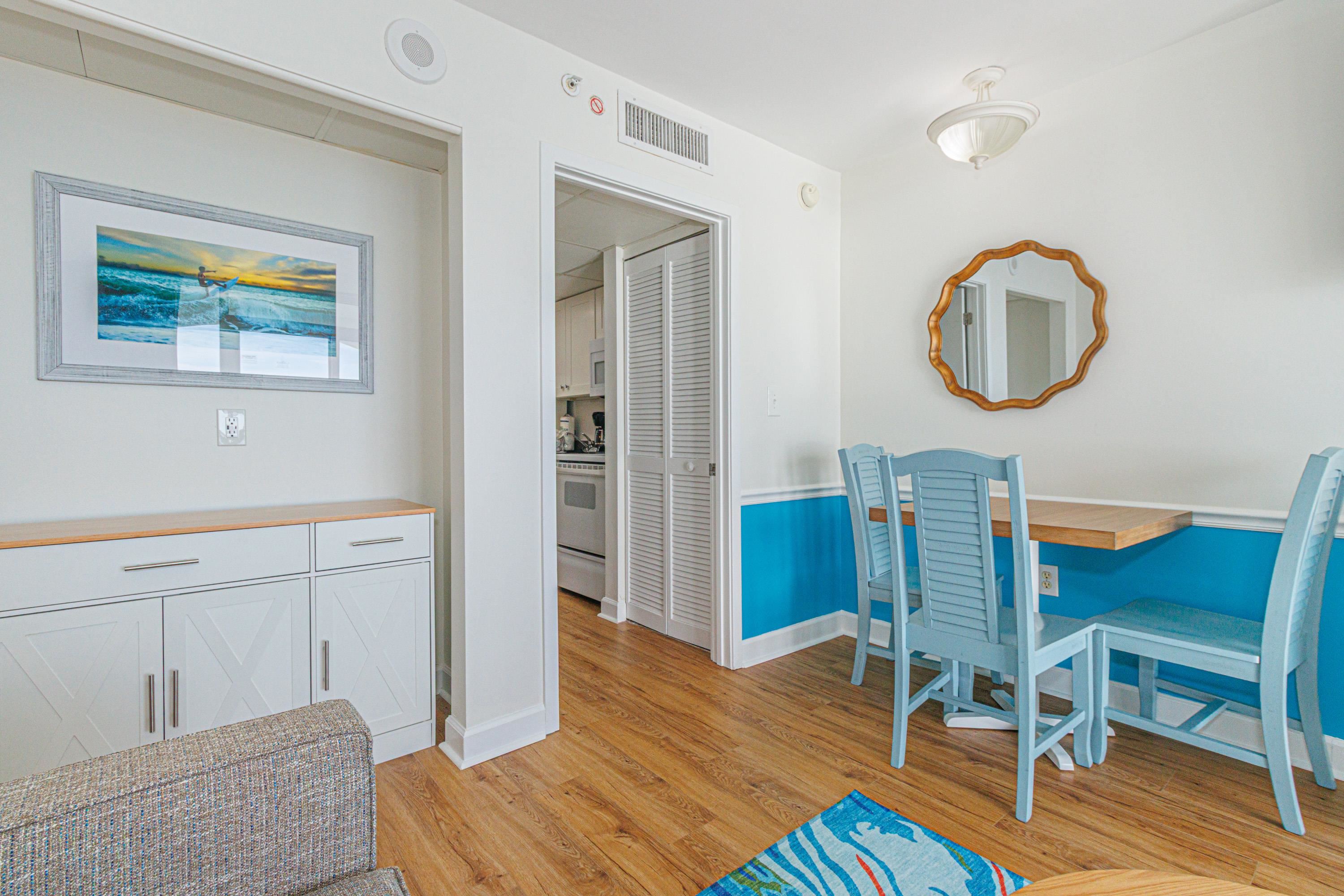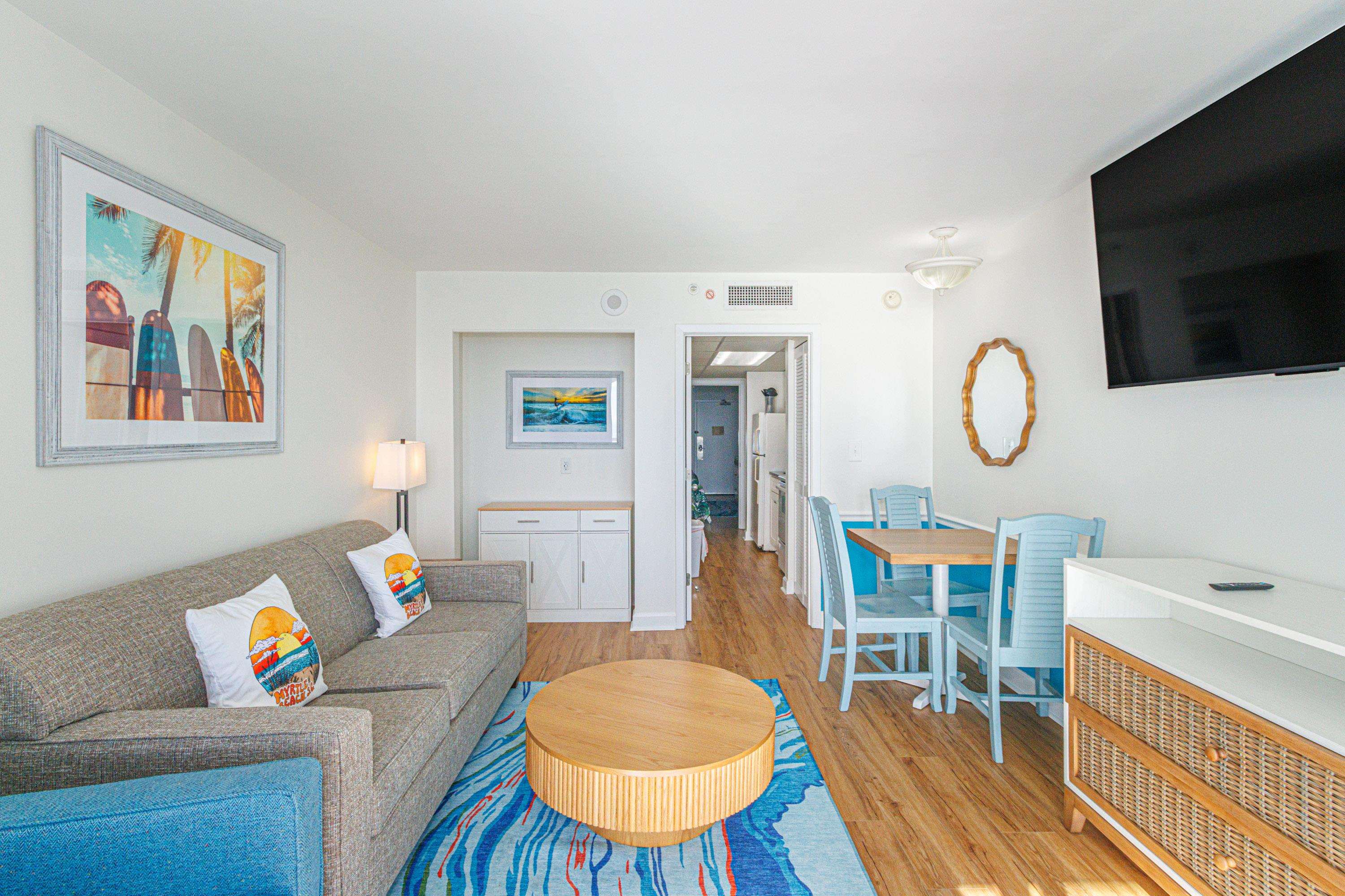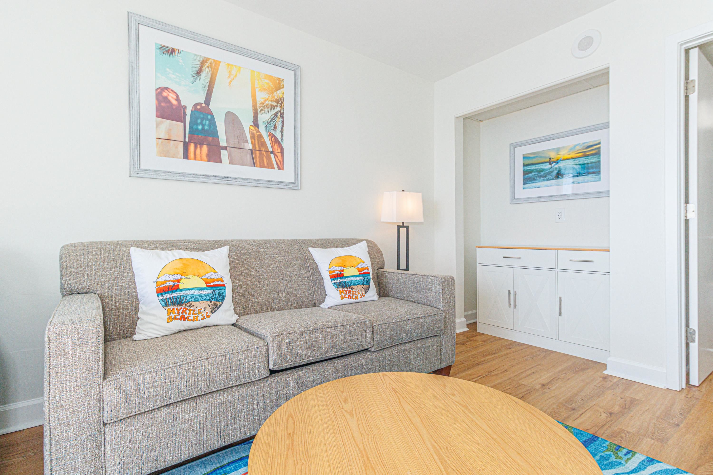 Completely renovated premium oceanfront penthouse 1BR condo at the popular Camelot Resort. Step into what feels like a brand-new residence featuring a fully updated kitchen with new cabinetry and countertops, new flooring throughout, and all-new furnishings, TVs, lighting, artwork, and décor. The popcorn ceiling has been removed, and the closet has been thoughtfully redesigned into a stylish and functional coffee bar—adding both convenience and rental appeal. Every upgrade was intentionally selected to maximize rental performance and investment returns. Offered fully furnished and truly turnkey, this is the ideal time to secure an oceanfront penthouse in the heart of Myrtle Beach. Camelot Resort is perfectly located within walking distance to the Boardwalk, SkyWheel, and an abundance of dining, shopping, and entertainment options.