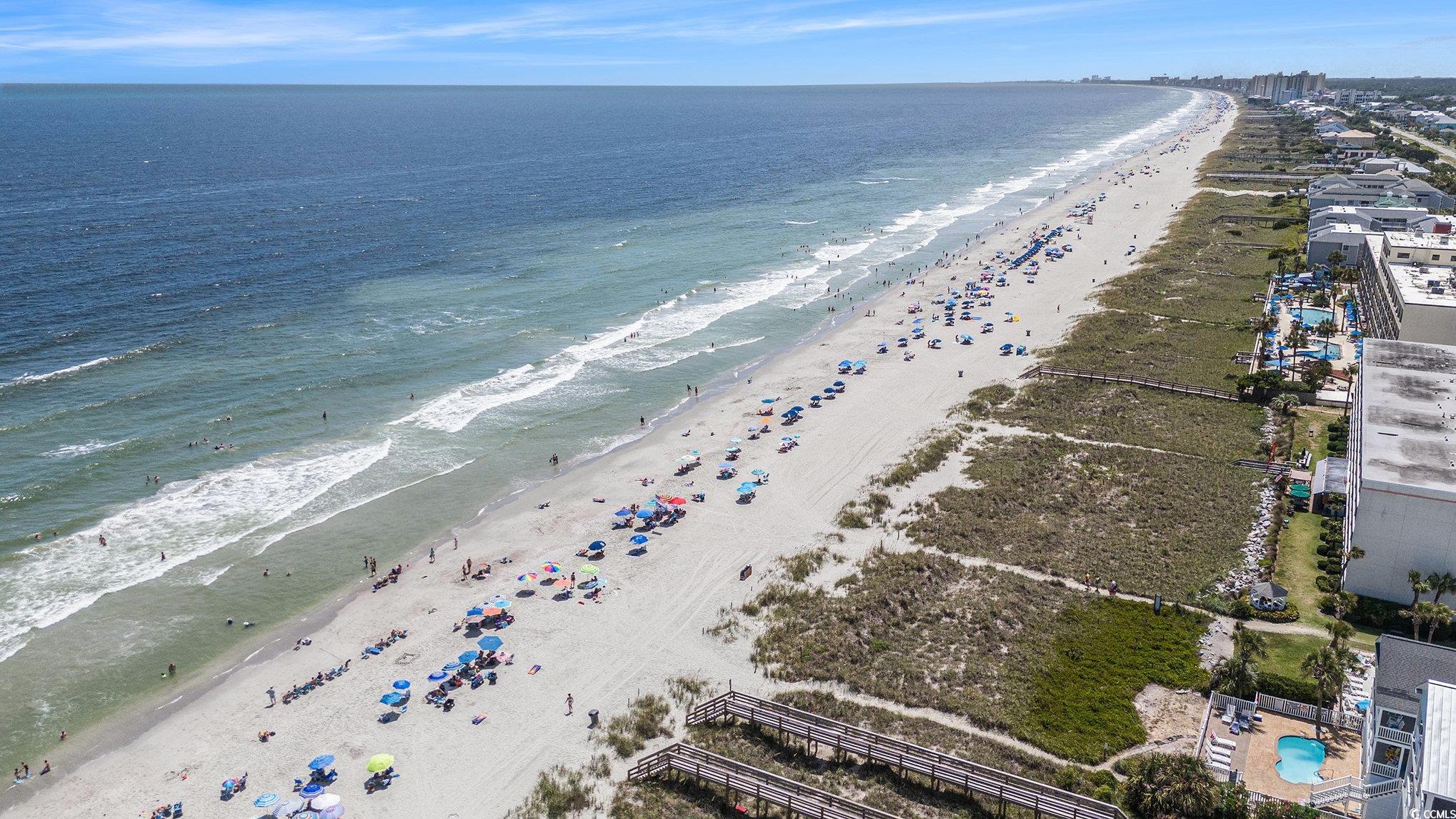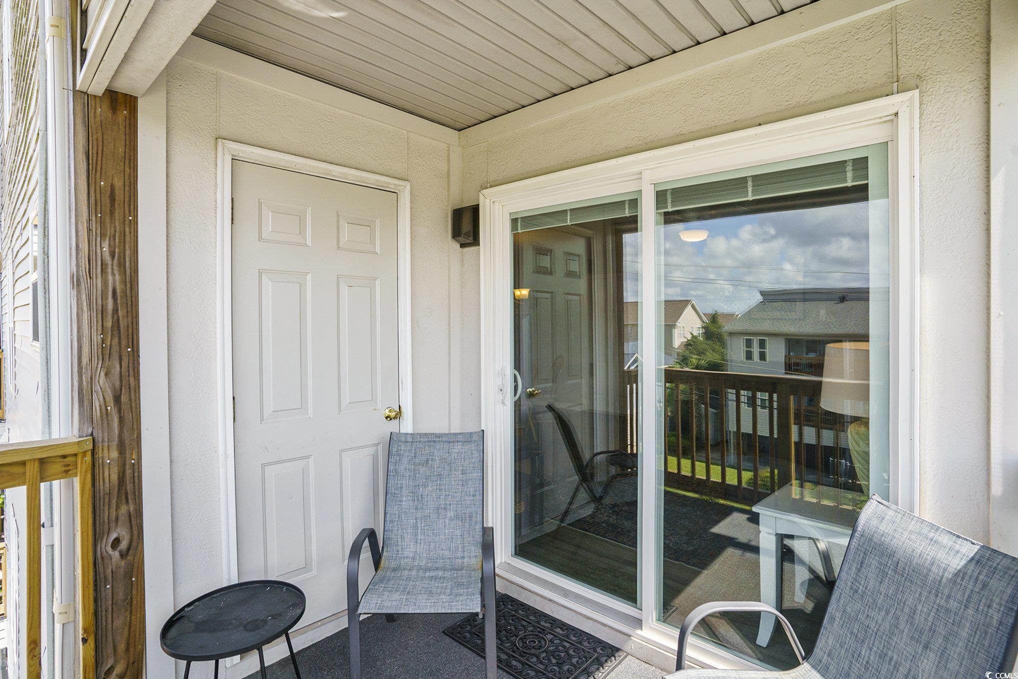 This charming 2 bed 2 bath second row condo located at Ocean Terrace in Cherry Grove is a must see! Beautifully furnished and tastefully decorated, this unit has been freshly painted and updated with smooth ceilings, a new stack washer and dryer, new rug, new vertical blinds in the master, new light fixtures and new corner bench seating with storage in the dining area, custom shelving in the owner's closet, and three new TVs. Wonderful open floor plan features LVP flooring throughout, a nice sized living room with access to the first balcony and a queen sofa bed, dining area with plenty of seating options and a fully equipped kitchen that boasts updated cabinets with ample storage space, granite counters, double sink and a new garbage disposal. The spacious master suite has a king bed, bath with vanity and tub/shower and its own private balcony where you can relax with your morning coffee or favorite book. A second bedroom with a queen and twin bed is perfect for guests and there is an additional full bath off the hallway with vanity and tub/shower that has a new exhaust/fan light. In addition, there are ceiling fans in the living room and both bedrooms and washer and dryer conveniently located in the hallway. The balcony off the living room overlooks the pool and is the ideal spot to gather with cocktails and savor the ocean breezes. There is also a storage closet off this balcony for your beach toys and chairs. Amenities include an outdoor pool, elevator and covered parking under the building. Steps from the ocean on the beach walkway across from the building and only minutes from the Cherry Grove Pier, Main Street, the Intracoastal Waterway, Barefoot Landing, golf courses, shopping, dining options galore, and activities and entertainment for the whole family. Whether you are looking for the perfect beach retreat, an investment property, or primary residence, don't miss this fantastic opportunity! Schedule your showing today!