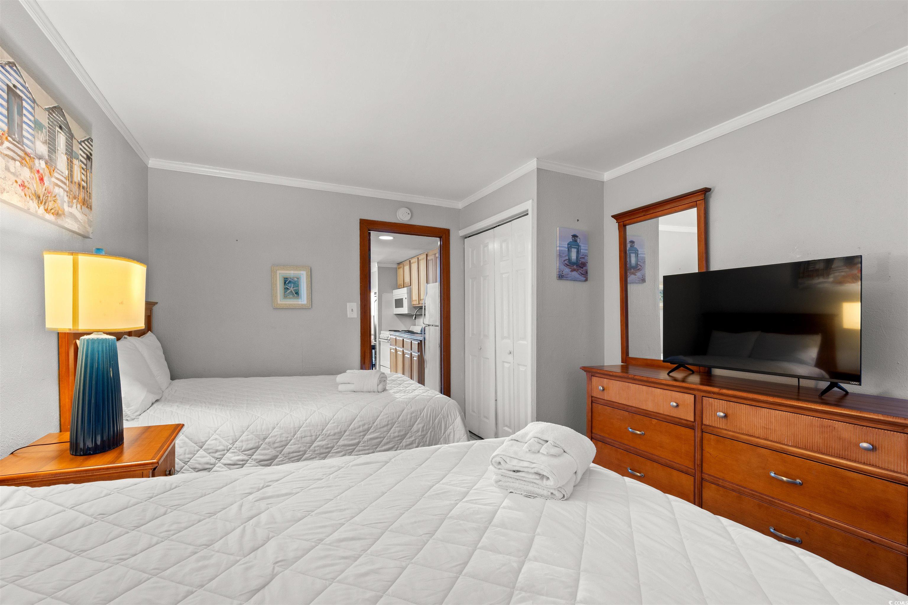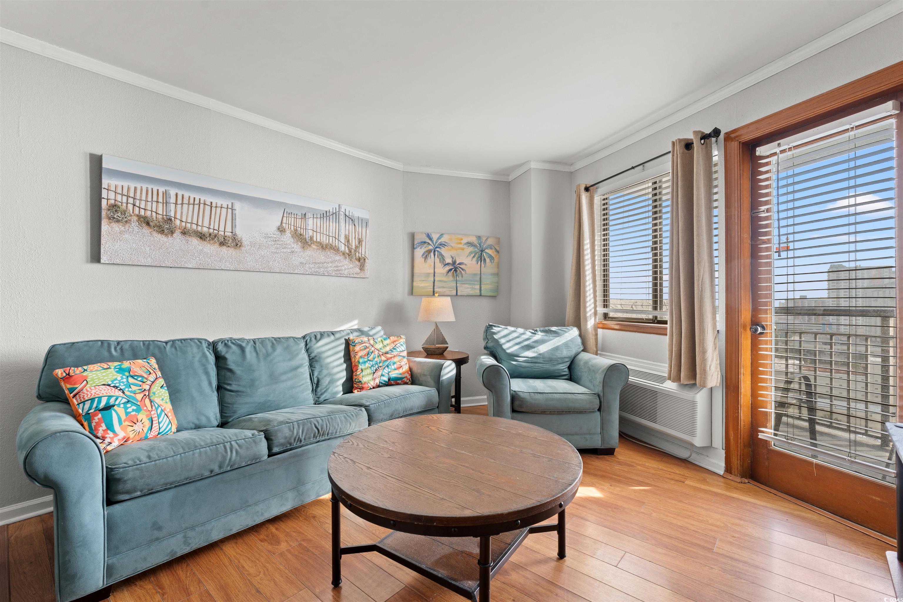 Welcome to Unit 1209 at Bluewater Resort a 1-bedroom, 1-bath condo on the 12th floor with sweeping views of the Atlantic Ocean. Enjoy your morning coffee or evening breeze from your private balcony, perfectly positioned to capture the beauty of the coastline. Inside, the unit features a blend of tile and wood laminate flooring, offering both durability and comfort. The living room is cozy with plenty of space to relax and includes a charming bench-style dining area. The kitchen is equipped with a range, microwave, refrigerator, and generous cabinet storage for its size ideal for short stays or longer getaways. In 2020, the packaged terminal air conditioner was replaced, the interior was freshly painted, a new microwave was installed, and the bathroom vanity was replaced. Bluewater Resort offers an impressive list of amenities including indoor and outdoor pools, a lazy river, hot tubs, a sauna, a game room, on-site dining, and private beach access. The resort also features 24-hour security, and both short-term and long-term rentals are allowed, making this condo a great vacation spot or investment property. HOA fee includes: Water/sewer, cable TV, internet, trash removal, pest control, security services, and electricity in-unit and common areas. Centrally located along South Ocean Boulevard, this resort is just minutes from Myrtle Beach’s top attractions, restaurants, shopping, and entertainment.
