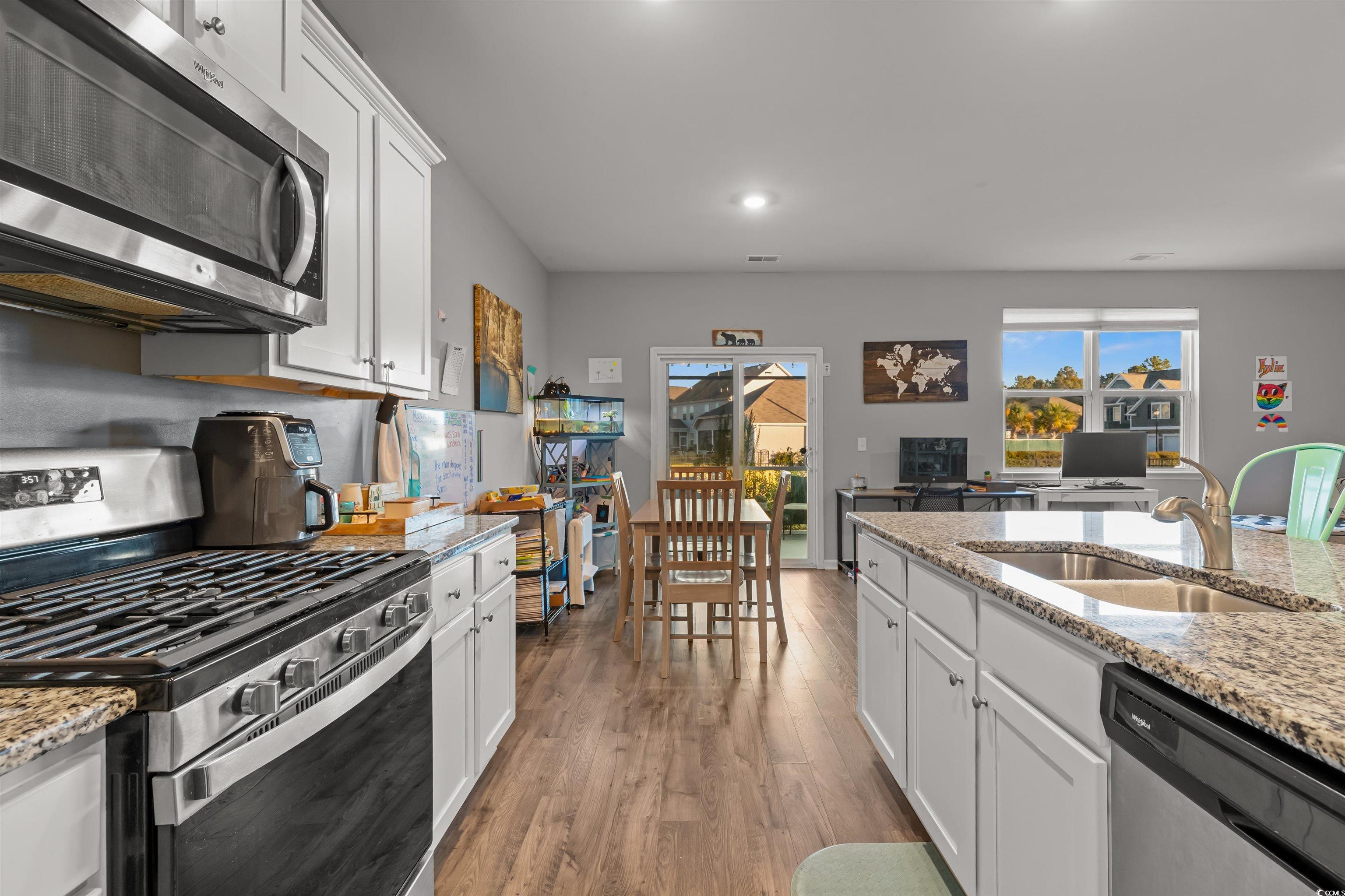 Welcome to Musgrove Mill Way, a spacious Elle floor plan offering generous living space and thoughtful upgrades throughout. This home is located within walking distance to the community’s resort-style amenities, including the lazy river, large pool, playground, and open recreation lawn. A set of French doors opens to a versatile flex room that works perfectly as a home office, playroom, or formal dining space. The open-concept great room flows into a bright kitchen with white cabinetry, granite countertops, stainless steel appliances, and sliding doors that lead to the backyard. The main level features the primary suite for easy convenience, along with an additional half bath for guests. Upstairs includes well-sized bedrooms, two full bathrooms, the laundry room, and a loft-style second living area ideal for media, work, or relaxation. The sellers have invested in valuable upgrades, including a screened-in back porch, black aluminum fencing around the backyard, and upgraded rock landscaping that replaces the builder’s basic straw beds. Move-in ready, well-maintained, and better than new construction, this home offers comfort, space, and an unbeatable location near top-tier amenities.