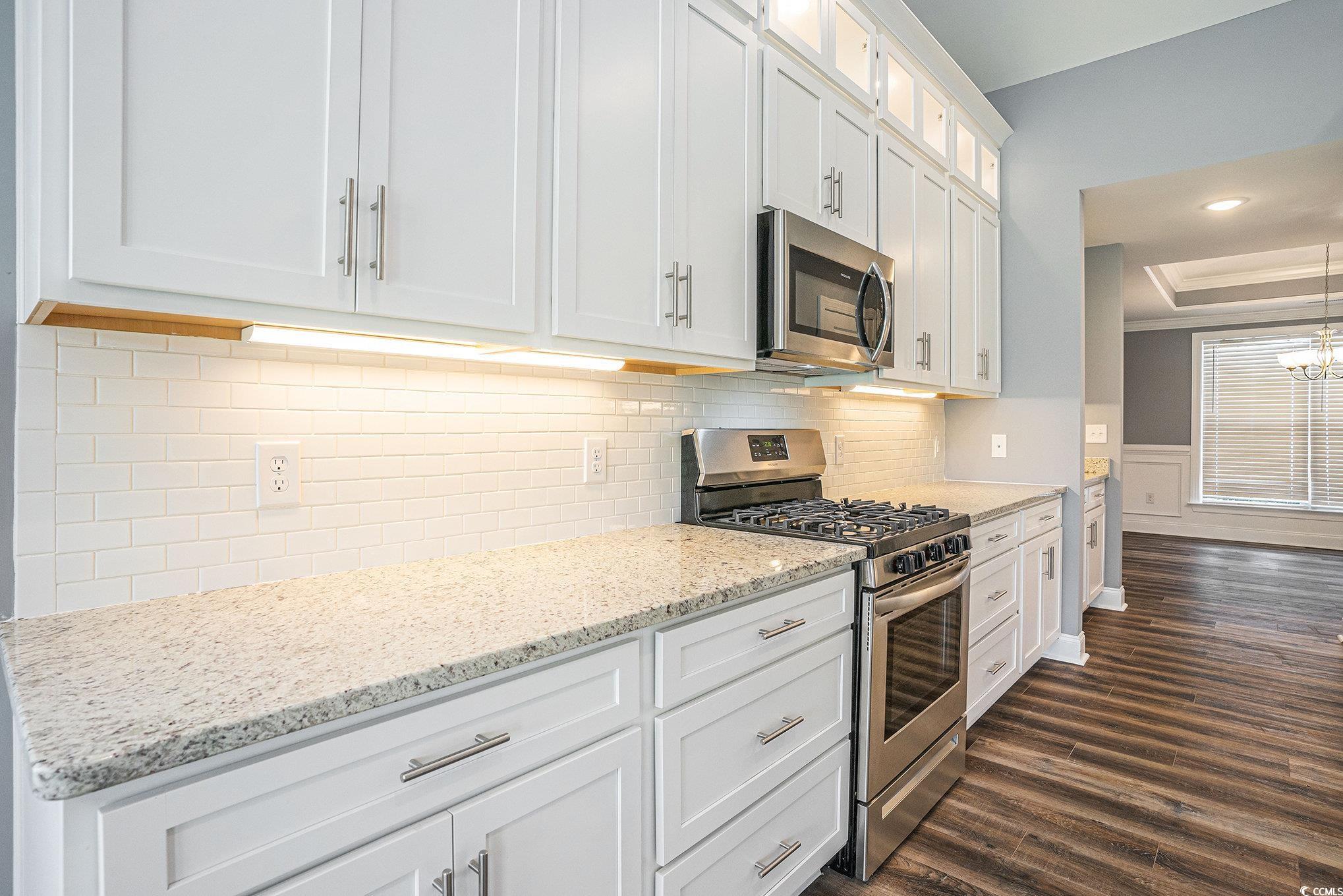 This is a spacious and beautifully maintained 4-bedroom, 3-bathroom home in the desirable gated community of Covington Lake East. This home features luxury vinyl plank flooring throughout the main living areas, tile in the wet spaces, and cozy carpet in the bedrooms and staircase. The gourmet kitchen is a standout with upgraded cabinetry, granite countertops, stainless steel appliances, tile backsplash, under-cabinet lighting, and a spacious layout perfect for entertaining. The adjoining family room includes a gas fireplace with built-in shelving, adding warmth and character. The oversized master suite is a true retreat, complete with cathedral ceilings, a luxurious en-suite bathroom with dual vanities, and a large tiled walk-in shower. There is a bedroom located above the garage with its own private bath -- ideal for guests or a private office space. Step outside to a large covered back patio with serene views of the pond. Whether you're looking for a permanent residence, vacation getaway, or a smart investment, this home has it all. Covington Lake East is a peaceful, gated community offering a beautiful community pool and clubhouse and access to the Carolina Forest school district -- all while being just minutes from shopping, dining, hospitals, golf, and only 8 miles to the beach. Everything the Grand Strand has to offer is right at your fingertips!