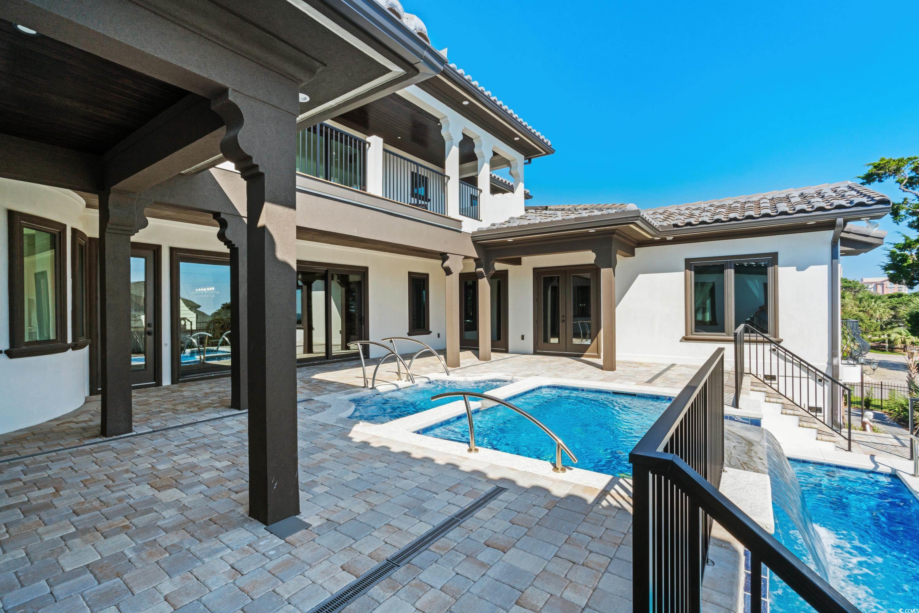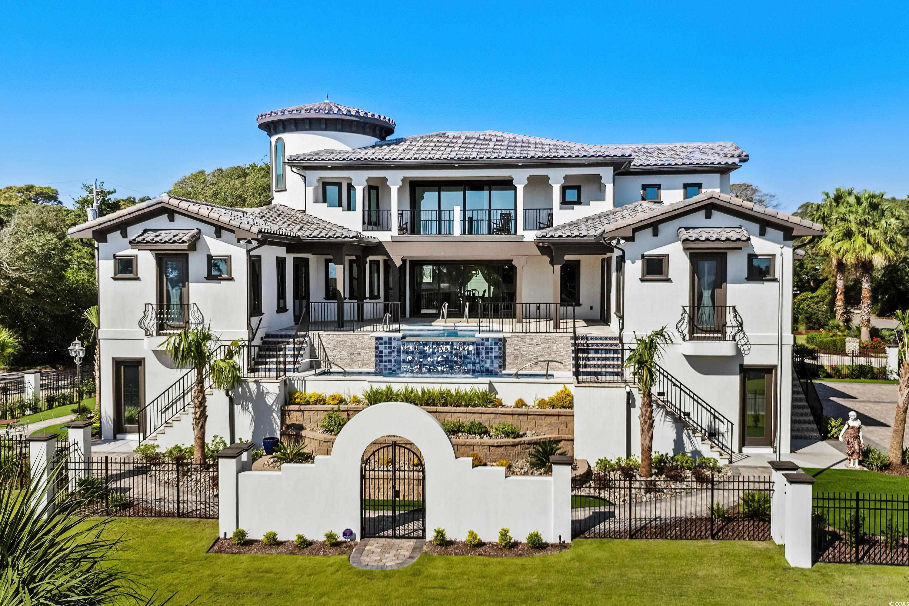 Coastal Luxury Living at its finest!! Introducing an almost-new, custom Mediterranean masterpiece with beautiful ocean views, perfectly positioned on a second row ocean view lot, in the highly desirable Long Bay Ext area of Myrtle Beach. This one of a kind, gated estate is absolutely loaded with details and offers 5 bedrooms plus an office/gym, a SAFE room, rare 6 car garage, and over 8000 square feet under roof. Unmatched craftsmanship that features cedar plank beams, French Oak flooring, sensational stone work, brick floors in the master bath, wine storage, massive fireplace in the family room and so much more. Enjoy ocean views from almost every room in the home, step outside and experience the owner's favorite, 2 separate pool areas, a spacious hot tub and waterfall that flows into the second pool...this is a first!! Other features not to miss include an elevator, quartz countertops, custom cabinets, natural gas cooktop, plenty of storage, a laundry room on every level, coffee bar in master and so much more. Schedule your private showing today to experience this coastal jewel.