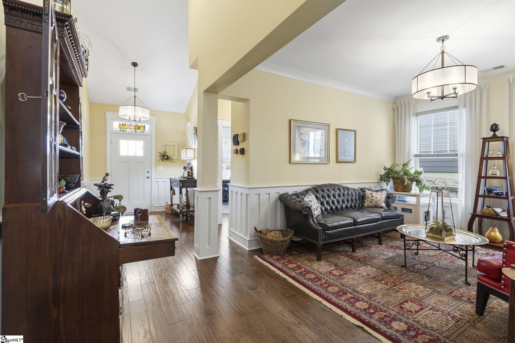 Tucked away in a peaceful EASTSIDE CUL DE SAC, this thoughtfully upgraded home offers a rare combination of privacy, charm, and convenience—LESS THAN 15 MINUTES to DOWNTOWN GREENVILLE and close to shopping and restaurants on Wade Hampton Boulevard. Set in an intimate neighborhood of only 51 homes, the property is also located within a HIGHLY DESIRABLE SCHOOL ZONE. Inside, the home features 3 BEDROOMS, 3 FULL BATHROOMS, and a versatile BONUS SPACE, with a layout designed for both everyday living and entertaining. The main level showcases soaring VAULTED CEILINGS, rich HARDWOOD FLOORING, detailed CRAFTSMAN-STYLE TRIM, and a blend of modern lighting upgrades including RECESSED LIGHTING and stylish BRUSHED NICKEL ACCENTS. The open living area centers around a warm GAS FIREPLACE and flows effortlessly into the kitchen and dining spaces. The KITCHEN stands out with its OVERSIZED ISLAND, QUARTZ COUNTERTOPS (added in 2022), striking COBALT CABINETRY, SUBWAY TILE BACKSPLASH, and STAINLESS STEEL APPLIANCES—including a GAS RANGE. Functional upgrades like SOFT-CLOSE DRAWERS, PULL-OUT SHELVING, a DEEP SINK, PANTRY STORAGE, and UNDER-CABINET LIGHTING make the space as practical as it is eye-catching. Nearby, the BREAKFAST AREA provides a casual dining option with easy access to the OUTDOOR LIVING SPACE. The PRIMARY SUITE on the MAIN FLOOR offers a private retreat, complete with HARDWOOD FLOORS, CUSTOM CLOSET SYSTEMS, and a well-appointed bathroom featuring DUAL VANITIES and a large TILED WALK-IN SHOWER with BUILT-IN SEATING. A separate FORMAL DINING ROOM—currently used as a sitting area—adds flexibility for a HOME OFFICE or additional gathering space. The LAUNDRY ROOM has also been enhanced with extra CABINETRY. Upstairs, you’ll find a SECONDARY BEDROOM, FULL BATH, and a spacious BONUS ROOM, all connected by HARDWOOD STAIRS with elegant WROUGHT IRON RAILING. OUTDOOR LIVING is just as inviting, with a welcoming FRONT PORCH and a SCREENED-IN BACK PORCH equipped with a CEILING FAN. The FENCED BACKYARD includes a PATIO WITH PERGOLA, surrounded by attractive LANDSCAPING and RIVER ROCK ACCENTS—ideal for relaxing or hosting guests. The home’s EXTERIOR is equally impressive, featuring HARDIE PLANK COLOR PLUS SIDING, STONE DETAILING, ENERGY-EFFICIENT LOW-E WINDOWS, ARCHITECTURAL SHINGLES, and FULL GUTTERING. Positioned just before the end of the CUL-DE-SAC, the property enjoys added seclusion with only one neighboring home and a WOODED BUFFER on the other side. With its extensive UPGRADES, FLEXIBLE FLOOR PLAN, and prime Taylors location close to SHOPPING, DINING, and MAJOR ROUTES, this home delivers comfort, style, and convenience in one exceptional package.