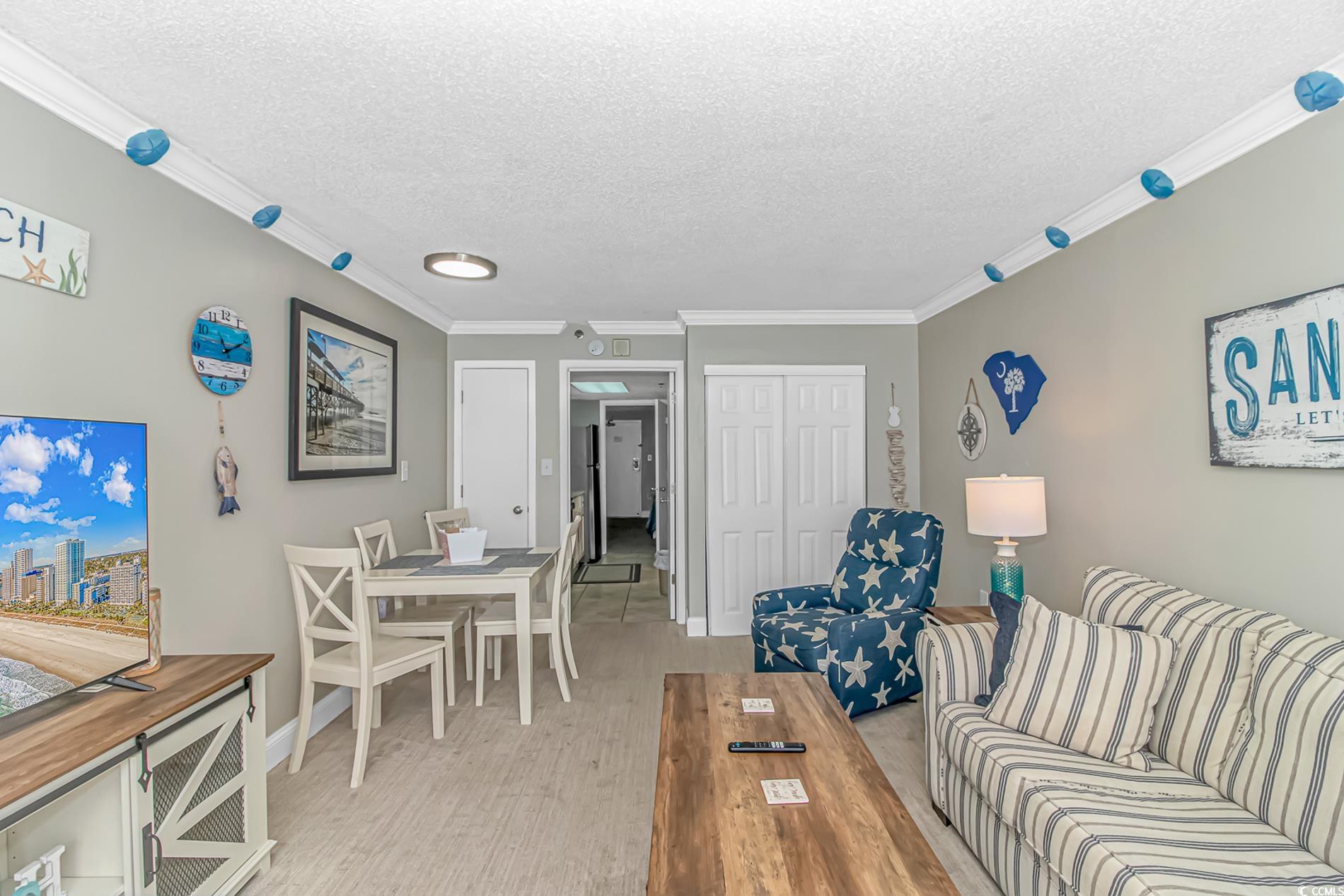 Beautiful ocean front 1 bedroom 1 bath condo in the fabulous Sandy Beach Resort. This building is ideally located across the street from Family Kingdom. The condo has been updated to include fabulous new furnishings, stainless appliances and the tub has been replaced with a beautifully tiled walk in shower. This unit does very well on the rental program and is consistently considered a guest favorite. The resort has a stunning ocean front sitting area, incredible amenities, including indoor and outdoor pools, a lazy river, a kiddie splash area, and direct beach access, all while being just minutes from the Myrtle Beach Boardwalk, SkyWheel, world class shopping, dining and entertainment. Call to see this condo today!