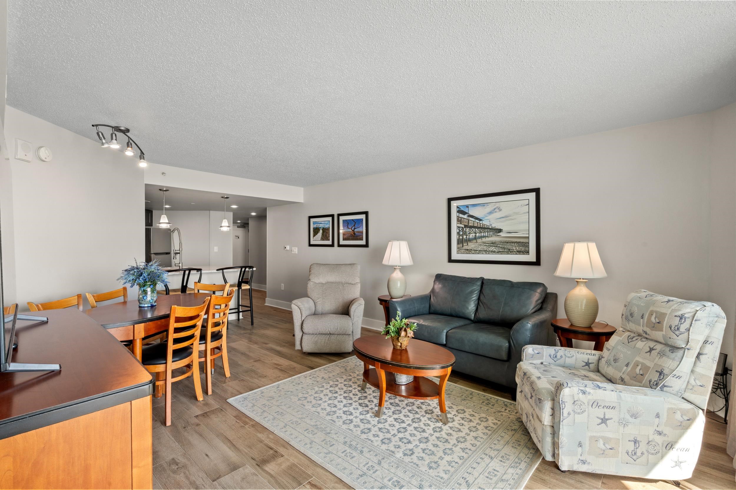Welcome to your oceanfront oasis at Sandy Beach Resort! This beautifully furnished 3-bedroom, 3-bath residence at 201 S Ocean Blvd, Unit 806 offers the perfect blend of comfort, space, and breathtaking views in the heart of Myrtle Beach. Step inside to a spacious entry hallway that sets the tone for this well-designed layout. Beautiful glass doors flood the condo with natural light, while multiple balconies showcase incredible ocean views. Enjoy four private balconies, including balcony off the primary suite. Wake up and take in the sunrise over the Atlantic right from your bed. The main living area also opens to the oceanfront balcony, with two additional private balconies off each guest bedroom. The open-concept living space is both inviting and functional, featuring LVP flooring, coordinated furnishings, and a seamless flow into the kitchen. The kitchen is equipped with solid surface countertops, stainless steel appliances, raised-panel cabinetry, a smooth-top range, and a bar for additional seating. This condo is perfect for entertaining. A stacked washer and dryer in the hallway adds everyday convenience. The thoughtful floor plan includes a guest suite with its own private bath, an additional bedroom with bathroom across the hall which can also be used as a powder room, and a spacious primary suite complete with a private bath . Located in Sandy Beach Resort, one of Myrtle Beach’s newer oceanfront resorts, residents and guests enjoy an impressive list of amenities including multiple indoor and outdoor pools, lazy river, hot tubs, children’s splash areas, oceanfront sundecks, fitness center, meeting space, and direct beach access. The building features enclosed interior corridors, multiple elevators, and convenient parking across the street. The HOA covers building insurance (including HO6), electric, water/sewer, cable, internet, trash, pest control, elevator service, pool maintenance, landscaping and security. Offers on-site management if desired making ownership easy and hassle-free. No obligation to onsite management. If self rented or with an offsite management company guests will have full access to amenities. Centrally located near the Myrtle Beach Boardwalk, Family Kingdom, dining, shopping, golf, and just minutes to the airport. Exceptional walkability allows for effortless access to Myrtle Beach’s top dining, shopping, and attractions. This turnkey property is ideal as a primary residence, second home, or income-producing rental.