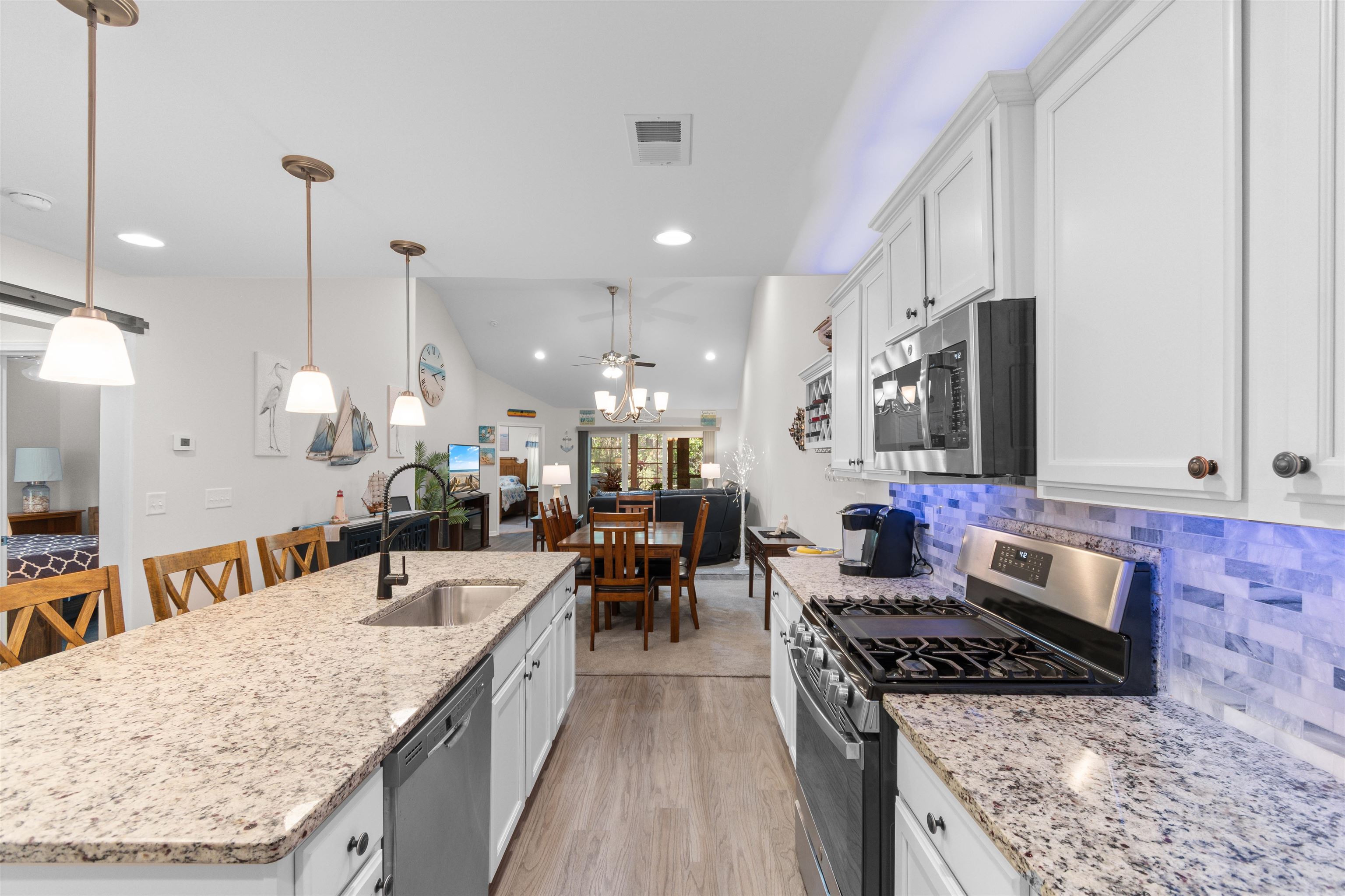 OPEN SUNDAY 12-2 PM!!! This beautifully maintained 3-bedroom, 2-bath ranch style end-unit townhome in Palm Lakes Garden Homes feels much larger than its square footage suggests! The open floor plan features vaulted ceilings, a suntube, ceiling fans, luxury vinyl plank flooring, and brand-new carpet throughout. The kitchen is designed for both style and function with granite countertops, stainless steel appliances, a gas range, new pendant lighting, a sink in the oversized island, island stools, a pantry, and a built-in wine shelf. Just off the attached 2-car garage, the mud room includes the washer and dryer for added convenience. A charming barn door separates the guest bedrooms and second bath from the main living area, offering extra privacy. The spacious primary suite features a tray ceiling, decorative accent wall, and large picture window. The primary bath includes your closet, dual sinks, a linen closet and a large walk-in shower with etched glass doors. The home includes an enclosed Carolina Room and also a concrete patio out back. Being an end unit, you can enjoy the larger side yard! Residents enjoy access to the community pool, fitness center and play area shared with Palm Lakes. Conveniently located just off Mt. Zion Road between Highways 57 and 90, this home is only minutes from North Myrtle Beach dining, shopping, entertainment, and the beach