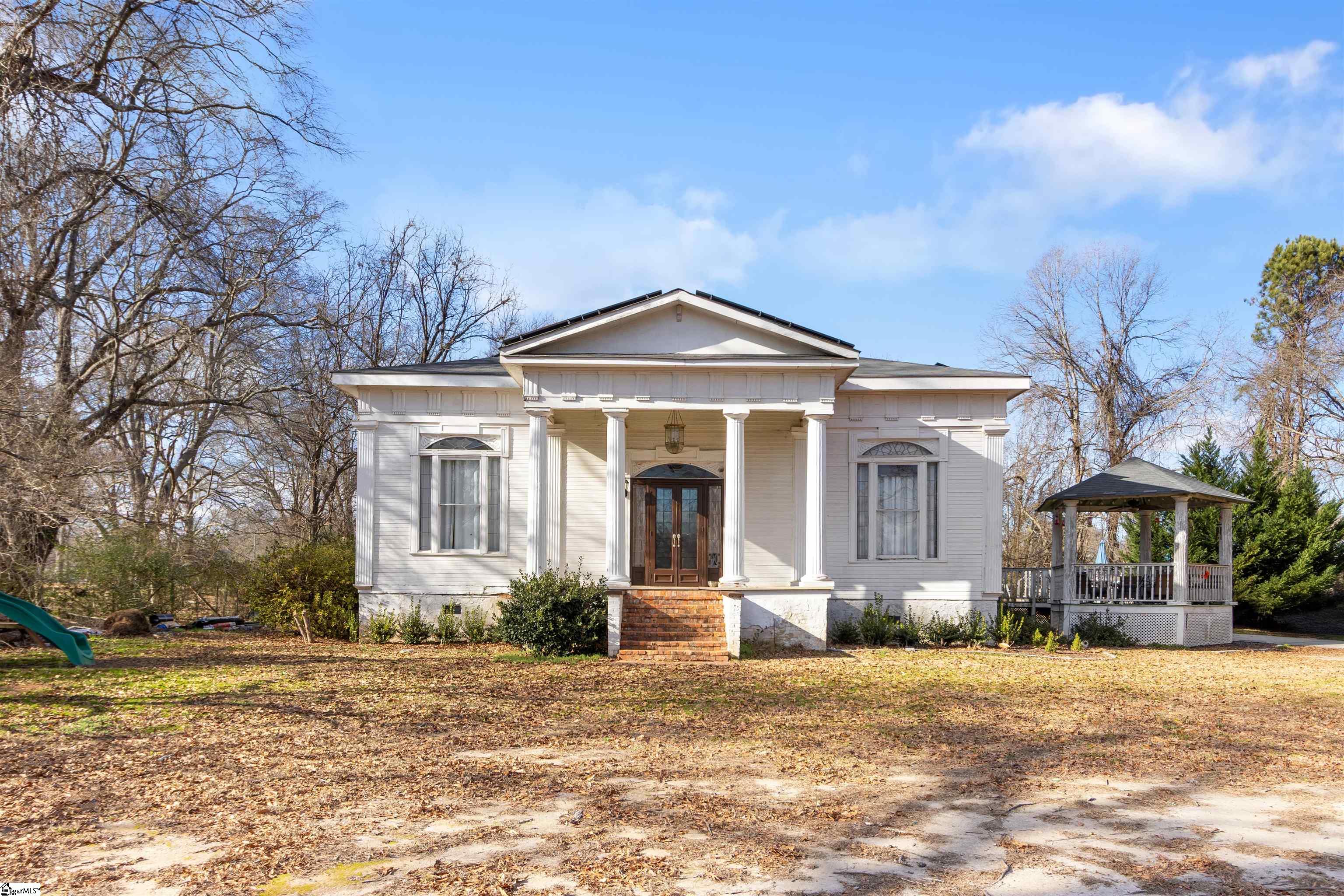 Ready for stately living in a peaceful country setting? This historic 3 bedroom, 2 bath home is full of character and possibility. Soaring 16 foot ceilings and a grand foyer with a chandelier set the tone, while original wood floors and two fireplaces add warmth and charm. The spacious layout includes a great room, formal dining room, mudroom, laundry room, and a primary suite featuring a large bath plus separate his-and-hers closets. An unfinished garage offers potential to expand with up to two additional bedrooms. Situated on a full acre, the property also includes a large outbuilding with power and an above ground pool with a deck - perfect for enjoying the outdoors. Fully paid-for solar panels installed in 2019 add long-term value and efficiency. While the home does need some work, it presents a rare opportunity to restore and personalize a truly statement-making property. Located outside Laurens city limits, you’ll enjoy no HOA and no city taxes, with convenient access to both I-385 and I-26. Cash buyers or possible conventional loan. Sold in as-is condition. Here's your opportunity to own a piece of Laurens County history - call for your showing today!