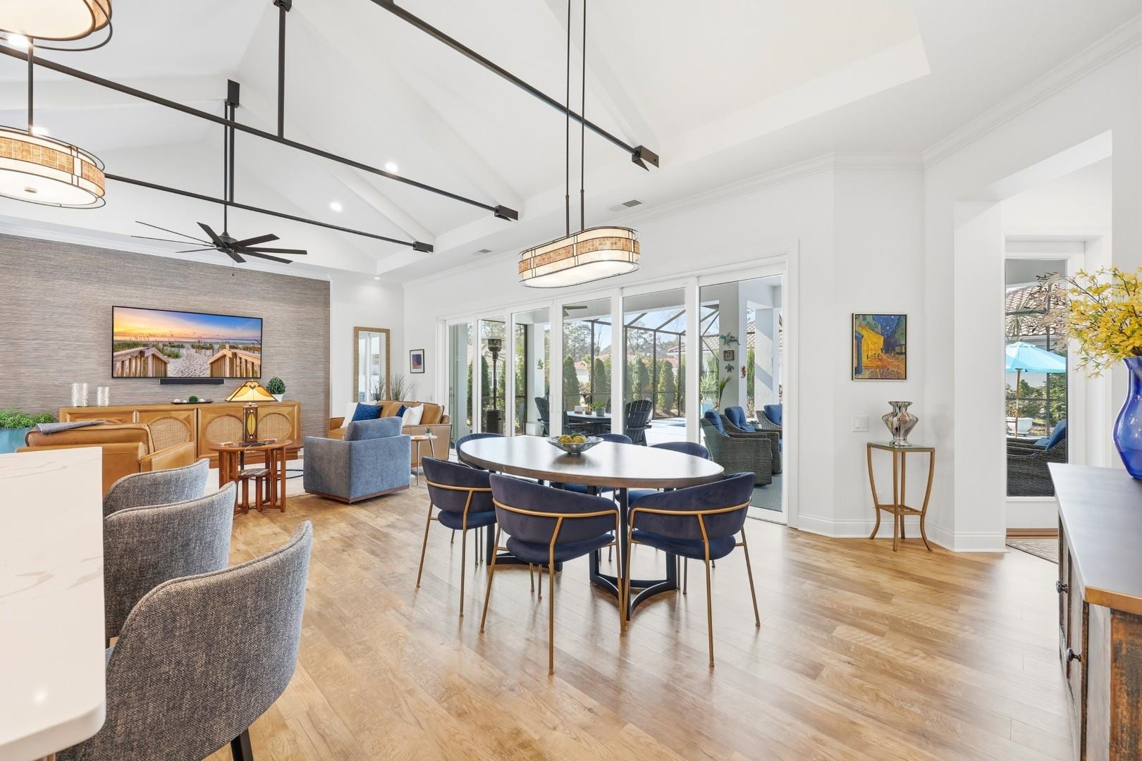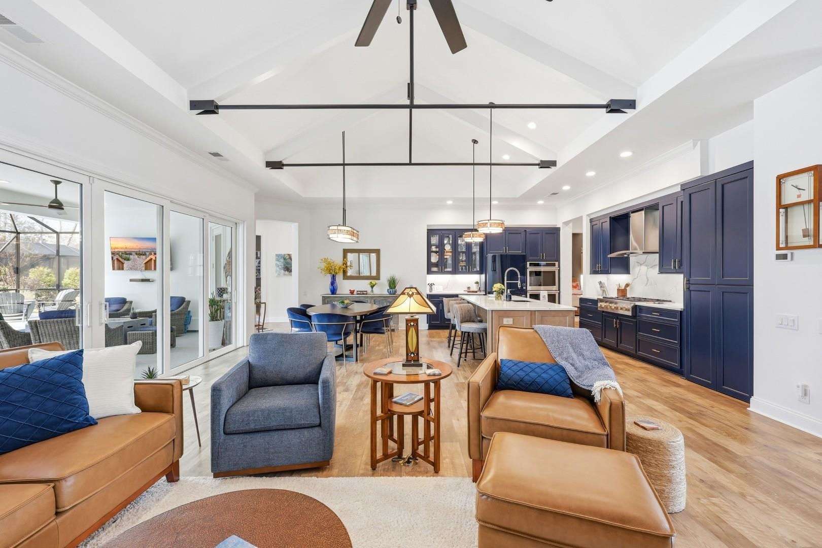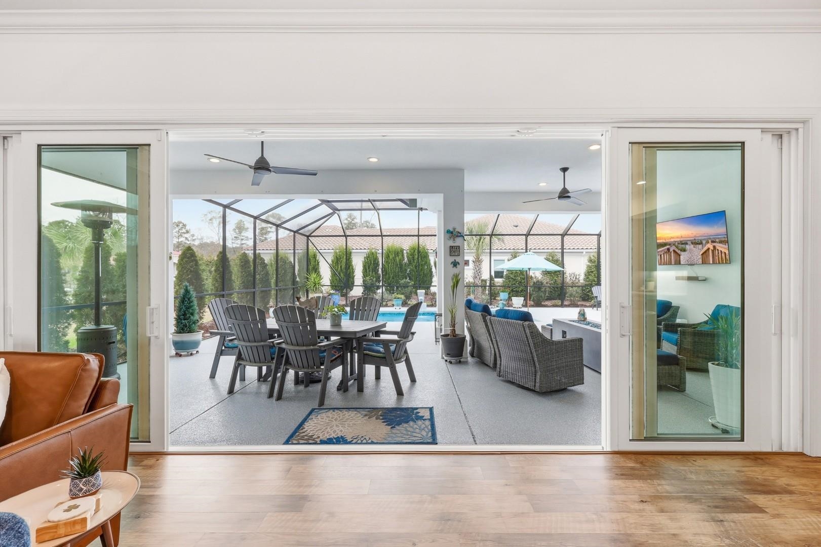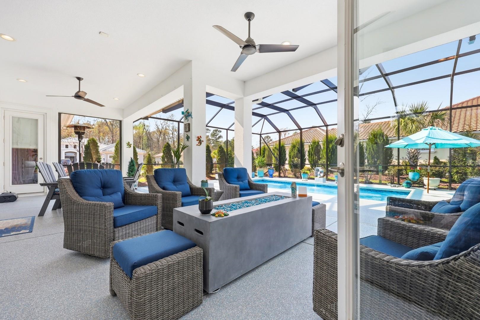 Experience refined coastal living in this custom-built 4-bedroom, 3-bath AR Homes masterpiece nestled within the exclusive Members Club Enclave at Grande Dunes. From the moment you arrive, the double iron front doors with hurricane locks make a bold statement---setting the stage for the elegance and craftsmanship found throughout. Inside, a breathtaking vaulted living room with custom metal beams commands attention, while full-wall, fully retractable patio doors create a seamless transition to the outdoors---an entertainer's dream and a true architectural showpiece. The designer kitchen is as functional as it is stunning, featuring quartz countertops, custom soft-close cabinetry, under-cabinet lighting, and premium GE Monogram appliances, complemented by a butler's pantry and two additional pantries for exceptional storage and effortless hosting. The extended owner's suite is a private sanctuary, offering direct access to the lanai and resort-style pool, while the spa-inspired bath showcases a walk-in shower, soaking tub, and dual vanities with LED mirrors. Outdoors, indulge in your own private oasis with an in-ground saltwater pool, screened enclosure, and upgraded polyaspartic decking---designed for both beauty and low-maintenance luxury. Additional enhancements include a high-performance 4-ton Bosch HVAC system, whole-house surge protection, and an extended 3-car garage with insulated hurricane-rated doors and ample storage. Ownership here extends beyond the home---enjoy exclusive access to the Grande Dunes Ocean Club, a 25,000 sq ft oceanfront retreat offering fine dining, a resort-style pool, and elegant gathering spaces. Optional memberships elevate the experience even further with two championship golf courses, a 126-slip deep-water marina, Har-Tru tennis facilities, and miles of scenic trails. This is more than a residence---it's a statement of luxury, comfort, and coastal sophistication.