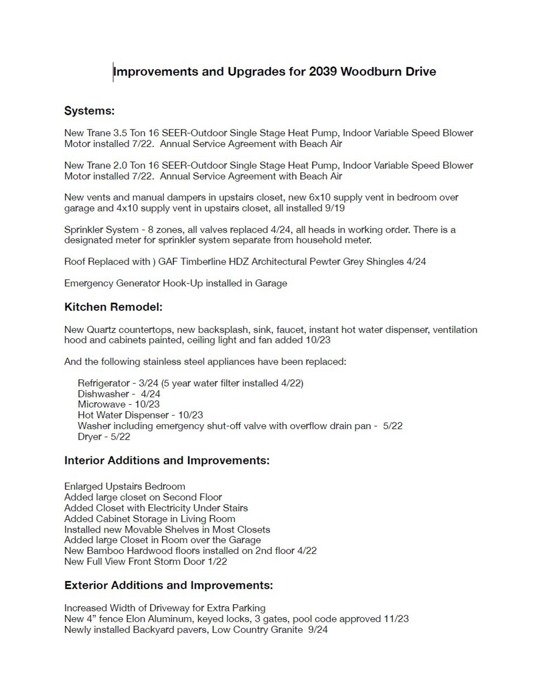 If you are looking for a home that is move-in ready, 2039 Woodburn Drive is the place to be. Extensive upgrades including a new roof (2021) and new HVAC System (2023) take the worry out of home ownership. In fact, so much has been done to upgrade this property, it is like moving into a new home. 2039 Woodburn Dr. is a beautiful, immaculate home with amazing lakefront views. Including 4 bedrooms, 3 full baths and sizable multi-use rooms, there is plenty of space to enjoy privacy when needed or togetherness when desired. The great room is spacious and bright with a soft color palette. An abundance of natural light fills this room, creating a warm and cozy feeling that will certainly brighten your day! Adjacent to the great room is a separate sitting room that can easily be used as an office or library. This is one of many flex rooms that can be adapted to personal use. If you are a cooking guru, then the kitchen will ‘pan out’ nicely for you! With plenty of soft close cabinets, quartz counters and upgraded appliances, family meals will be a delight to prepare. Counter seating and a sizable breakfast area are perfect for informal dining. For formal gatherings, a separate dining room is adjacent to the kitchen. 1st floor living also includes a large primary bedroom with a walk-in closet and stunning view of the lake. The en-suite bathroom has a sink, vanity, jetted tub, tiled walk-in shower and separate water closet. A second downstairs bedroom with closet space and full bath is perfect for guests or family members who prefer to be downstairs. Living up to the flexible nature of this home, the guest bedroom is currently used as an office. Upstairs you will find 2 large bedrooms, a full bathroom and a large bonus room complimented by two incredible all weather storage rooms. Both bedrooms have a view of the lake and are bright and very accommodating. The flow in this home really is quite comfortable both upstairs and downstairs. The backyard is spacious, way large enough to entertain family and friends with a game of croquet or corn hole. If boating is your pleasure, the property includes a full length, well maintained bulkhead with boat dock. The back yard also includes a large patio, essential for BBQs, happy hour with neighbors or just relaxing to watch the 4th of July boat parade or annual Christmas regatta. If living in a vibrant, well established neighborhood is on your ‘must have’ list, then look no further. Plantation Lakes is a community of custom built homes, large lots, sidewalks and interconnected lakes. The community provides an exceptional level of living that includes great amenities, low HOA fees and numerous social activities for all ages. It is a neighborhood where wonderful memories are made. We invite you to schedule your private tour today and see why this home in Plantation Lakes is the perfect place to call HOME!