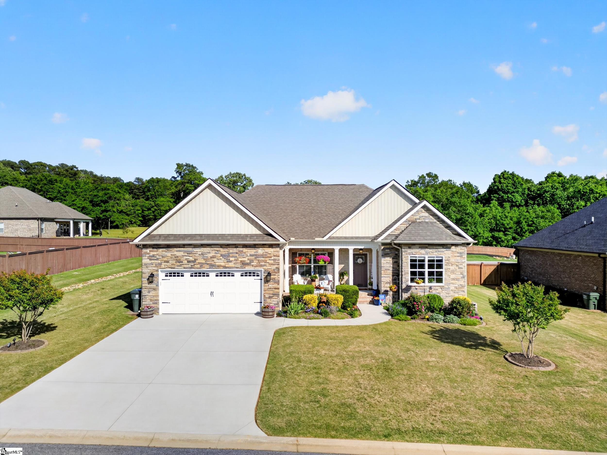 The one buyers have been waiting for. Welcome to 205 Cedar Knoll Way, a move-in-ready brick and stone beauty on nearly half an acre in highly desirable Meadow Creek. Combining the layout, lot, and finishes today’s buyers want most, this home checks boxes that are increasingly hard to find. Offering over 2,100 square feet of thoughtfully designed one-level living, the split-bedroom floorplan features 3 bedrooms, 2 baths, and a dedicated office/flex space ideal for working from home, hobbies, or playroom needs. The heart of the home is an expansive open-concept living area centered around a beautifully appointed kitchen with granite countertops, oversized island, gas range, stainless appliances, and effortless flow for entertaining. The spacious primary suite feels like a retreat with trey ceilings, double vanities, soaking tub, walk-in shower, and generous closet space. Hardwood floors, upgraded finishes, abundant natural light, and a gas fireplace add warmth and sophistication throughout. Step outside to enjoy a large, level backyard with space to entertain, play, garden, or simply enjoy the privacy that larger lots provide. Located in a neighborhood of attractive homes with quick access to Greenville, Greer, and Spartanburg, this is the kind of property that draws immediate attention. Homes like this do not sit. Schedule your showing quickly.