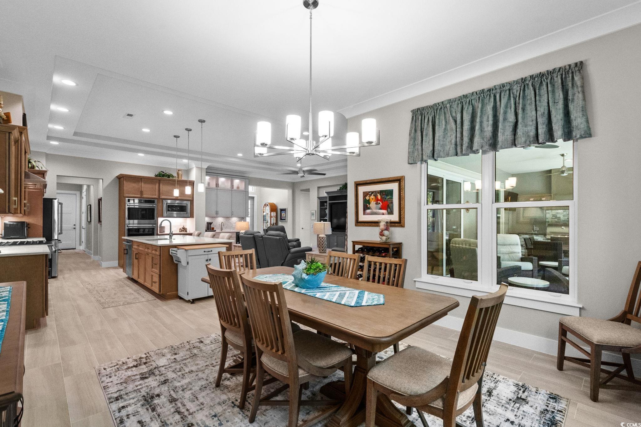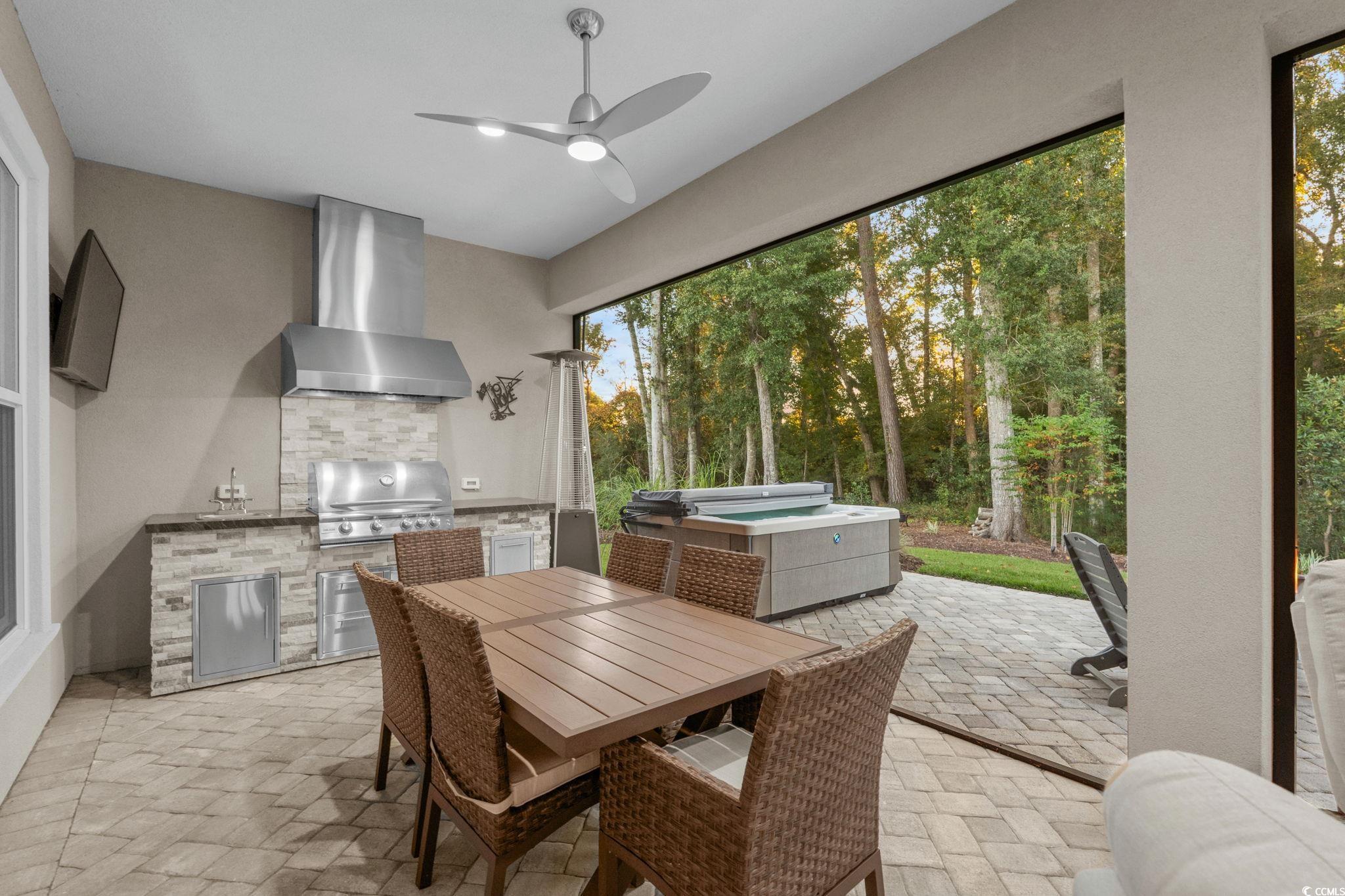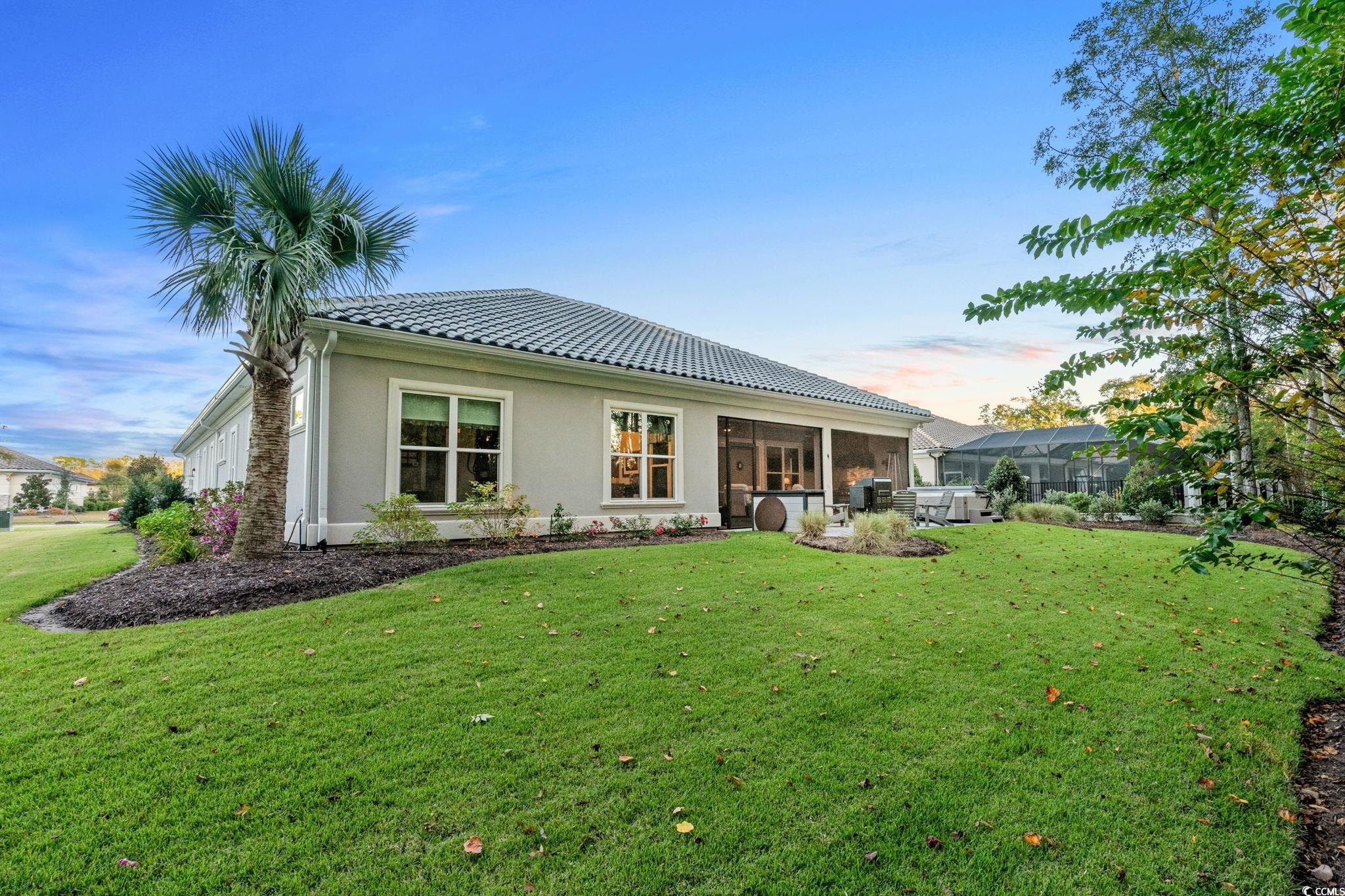 Discover your dream home in the prestigious Members Club Enclave at Grande Dunes. This practically new, custom-built residence offers a spacious and modern design with 4 bedrooms, 3 bathrooms, and a versatile den. Situated on a private wooded lot, this home features an open floor plan that seamlessly blends indoor and outdoor living. Enjoy thoughtful upgrades, including a Rinnai tankless water heater with recirculation system for energy efficiency, and a low-maintenance Leaf Filter system. The home boasts wood-look ceramic tile throughout, enhancing its sleek and contemporary aesthetic. Custom fixtures and Fanimation ceiling fans are installed throughout for added comfort, while upgraded landscaping with extensive lighting creates stunning curb appeal. Entertain effortlessly with a custom outdoor kitchen, oversized screened Lanai, and fully retractable triple sliders that open completely to connect indoor living with the outdoor oasis. Relax in the luxury saltwater spa after a long day of golf while enjoying your favorite beverage. The oversized 3-car garage features extra storage, epoxy floors and plenty of room for your golf cart. Located in Myrtle Beach’s prestigious Grande Dunes community, this 2,600-acre development offers luxurious living with top amenities. Residents enjoy the 25,000-square-foot Ocean Club, featuring fine dining, oceanfront pools, and daily activities. The community also includes two golf courses, a deep-water marina, tennis courts, and scenic trails. Don't miss this rare opportunity to own a nearly new CUSTOM home "over the bridge".