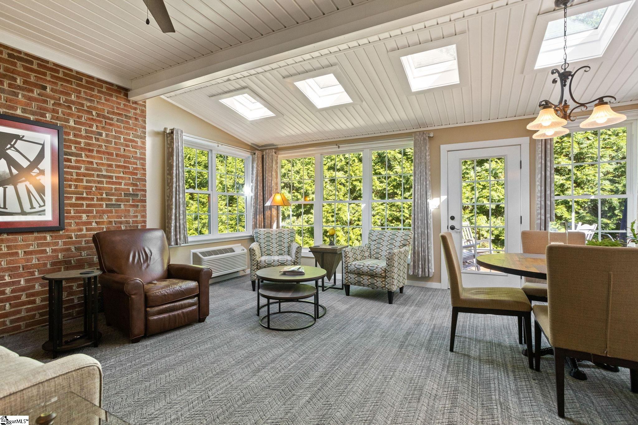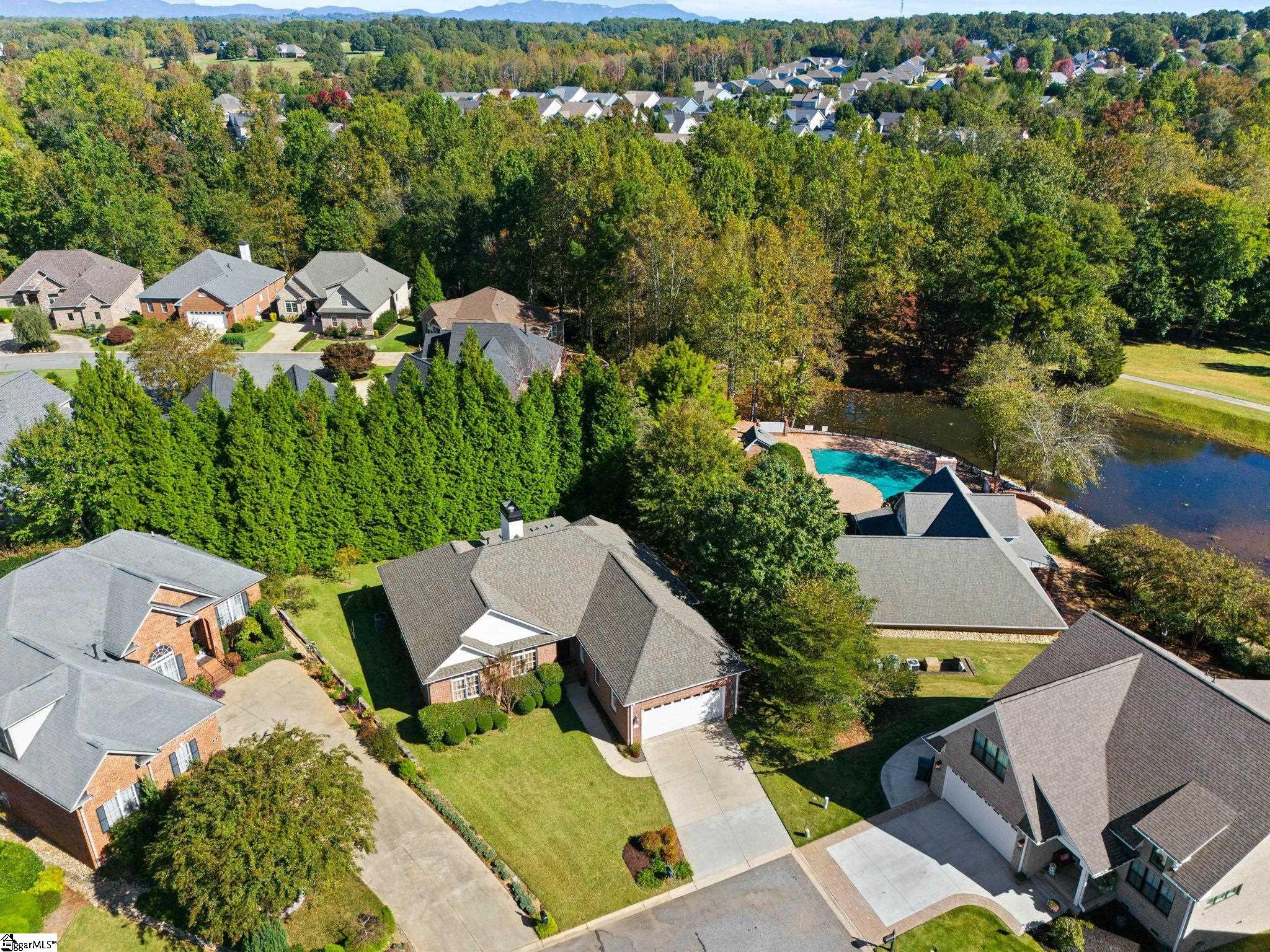 Back on the market due to previous buyers not meeting their home sale contingency. Beautiful brick ranch on a cul-de-sac in the highly sought after gated community of Hunters Ridge at Green Valley. Step inside to gleaming hardwood floors, beautiful custom cherry cabinetry with new granite countertops, huge windows with transoms to let in all the sunlight, custom window treatments. Custom trim and molding throughout with tray ceilings in Dining Room and Primary Suite, the home features 9 foot ceilings,12 foot in formal living room with cozy, convenient gas log fireplace. Primary bath has huge roll in shower. Enjoy the bright and airy den with 4 skylights and wall to wall windows with a view to your private outdoor two-tier deck. A truly low maintenance home with brick, vinyl windows and aluminum trim. The garage is wired with a car charger outlet. New in 2024: HVAC (with remaining transferrable 8 years prepaid maintenance agreement), Roof, composite deck, carpeting and stove. Easy Swamp Rabbit Trail bike access to quaint Travelers Rest or down to Greenville all without crossing any busy intersections. Enjoy the Hunters Ridge lifestyle: take your golf cart to Green Valley Country Club for a round of golf, play a little tennis or pickleball, bocce ball, swim in the pool or take the pooch on a lovely walk through the 7-acre walking park that runs along the golf course and Reedy river. The community has a social activity for everyone whether it be monthly potlucks, yoga, poker night, game night, book club and many other events in the beautiful pond-side clubhouse. This home and active community are a must see.