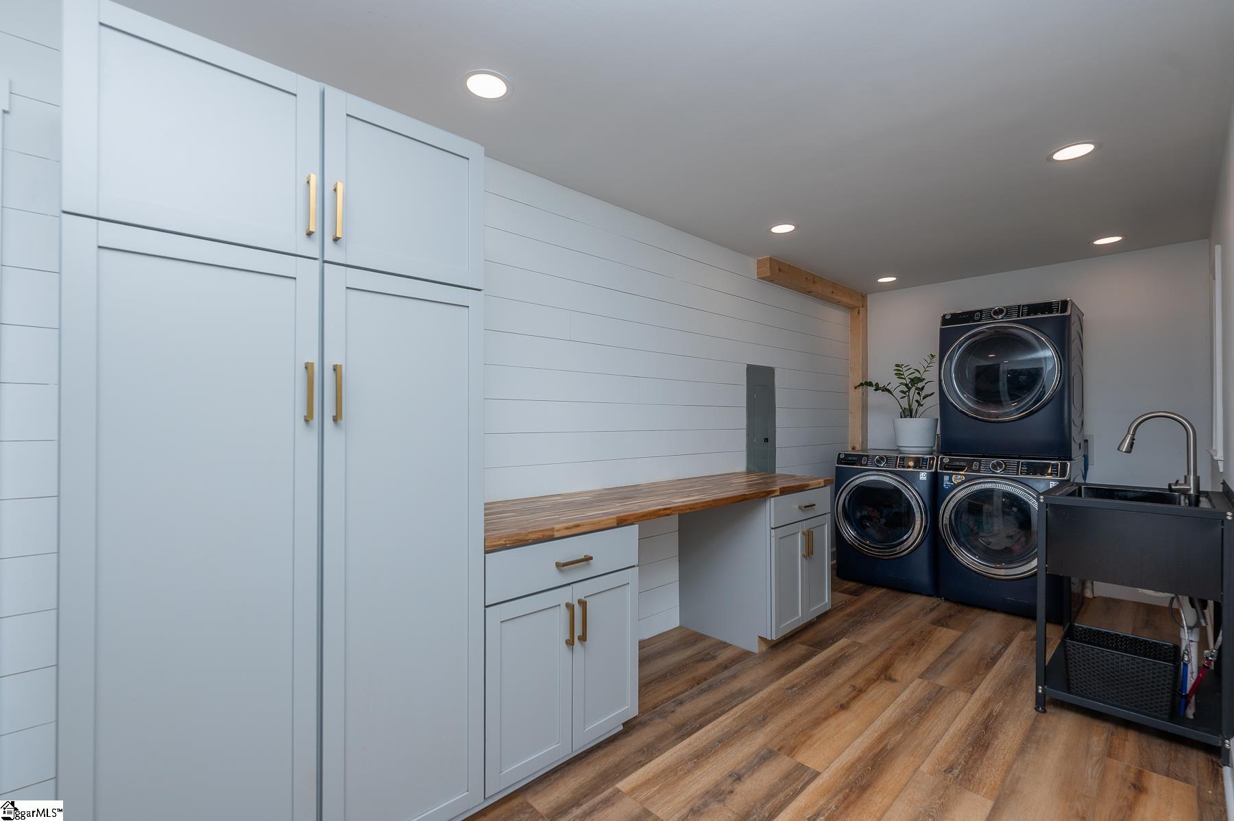 Beautiful home situated on over an acre of flat property, conveniently located just minutes from Travelers Rest, Greenville, and Greer. As you arrive, you’ll immediately notice the expansive front yard and large driveway leading to the attached two-car garage, complete with epoxy floors and its own separate AC unit—perfect for projects year-round. Across the driveway, an additional two-car garage/shop offers storage space above with potential for a future studio or man cave. A long sidewalk leads to the inviting covered front porch with a swing—ideal for relaxing on warm summer evenings. Inside, you’ll love the spacious living room featuring an exposed brick fireplace, detailed trim, and warm, welcoming finishes. The updated kitchen offers stainless steel appliances, a farmhouse sink, quartz countertops, and a well-positioned bar—perfect for entertaining family and friends. Just off the kitchen, you’ll find a generously sized dining room and a large laundry room with ample storage, folding space/desk, and a utility sink. The primary suite is conveniently located on the main level and features a full bath with double sinks, a jetted tub, separate shower, and walk-in closet. Upstairs includes two additional bedrooms, a full bath, and a bonus room that can serve as walk-in storage or a private workspace. Step outside from the living room onto a spacious deck—ideal for grilling and entertaining—overlooking the fenced backyard, perfect for kids or pets. With a one-acre lot, mature neighborhood setting, four-car garage capacity, multiple workshop/storage options, and a fenced yard, this home truly checks all the boxes. Come see it today and make it yours!