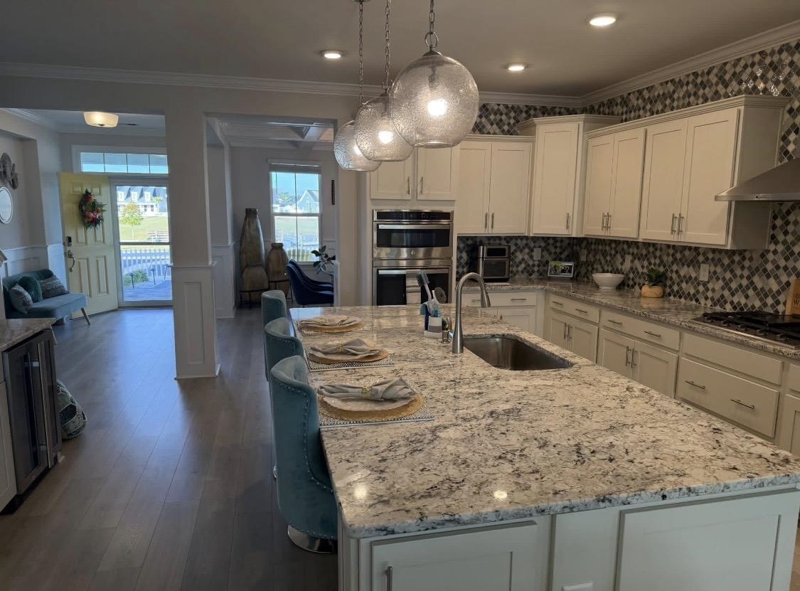 Enjoy the SPECTACULAR Lake View from the spacious front porch! Lots of extras in this home - Step out back and relax on the patio where the waterfall flows and sets the tone for a relaxing escape, there's a firepit, too!. The kitchen has everything: a chef-style stove, a wine fridge, and tankless hot water. Extra architectural appointments - tray ceilings, coffered ceiling in the formal dining room, crown molding, and wainscot paneling. The primary bedroom includes a large walk-in closet, and the primary bath offers an upgraded walk-in shower, water closet, and double sink. Two beds and baths on the first floor and the second floor has the 3rd bed, bath, and plenty of additional space up there for whatever you need. Parking in the back with a large driveway and an extra off-road space. This amenity-rich community, combined with the contemporary home design make for a great lifestyle - a place to live the good life! Request your tour today!
