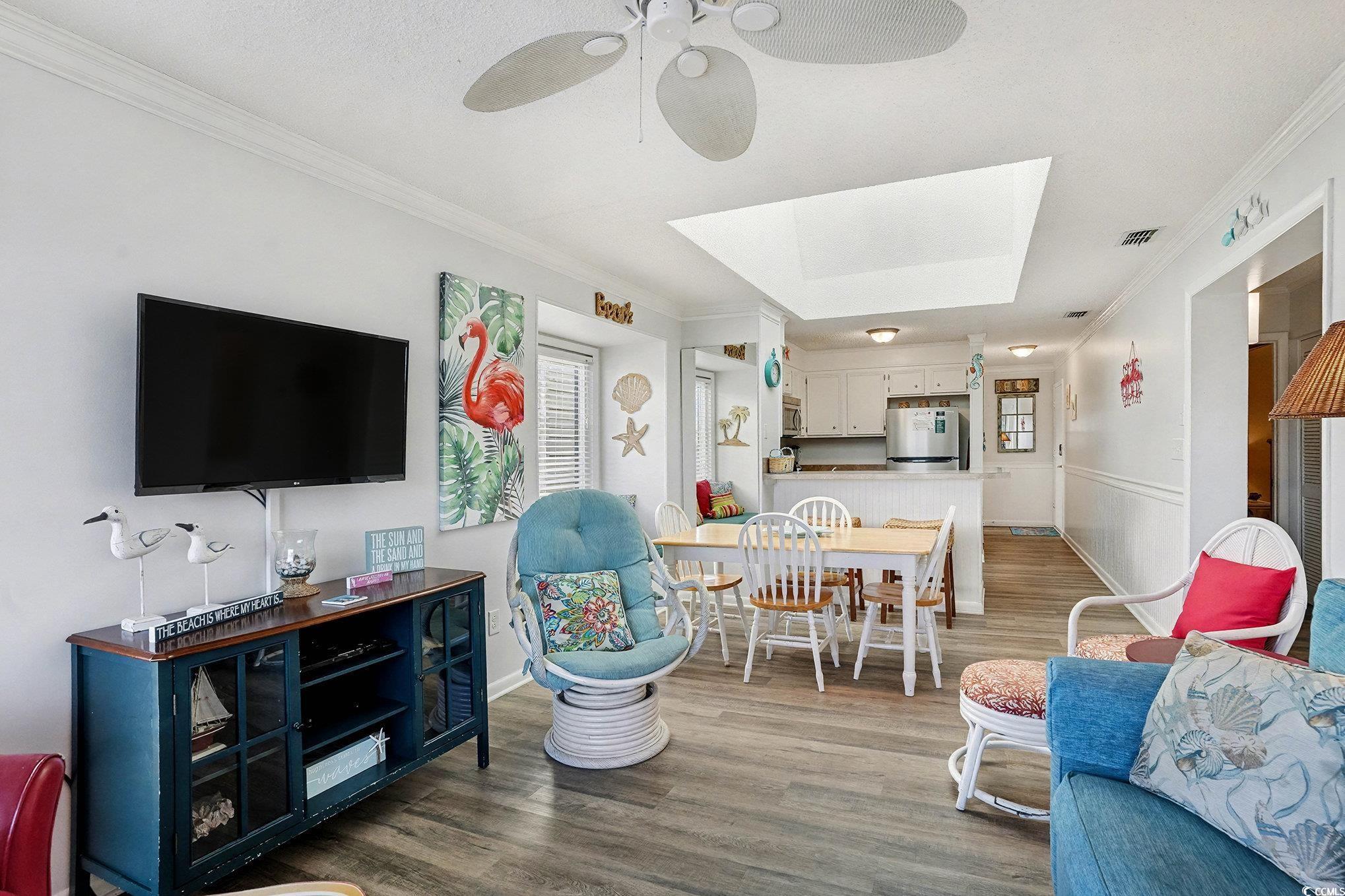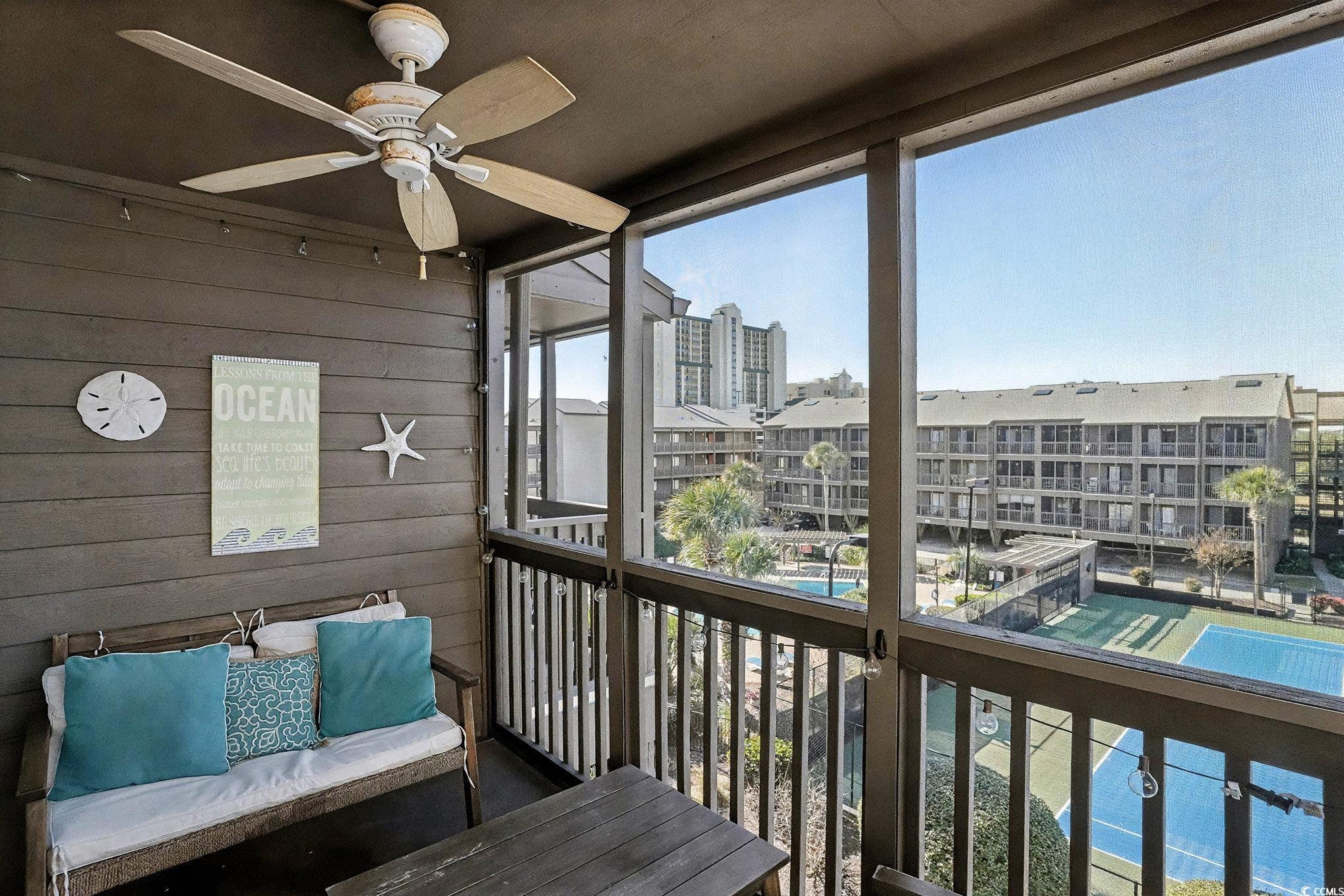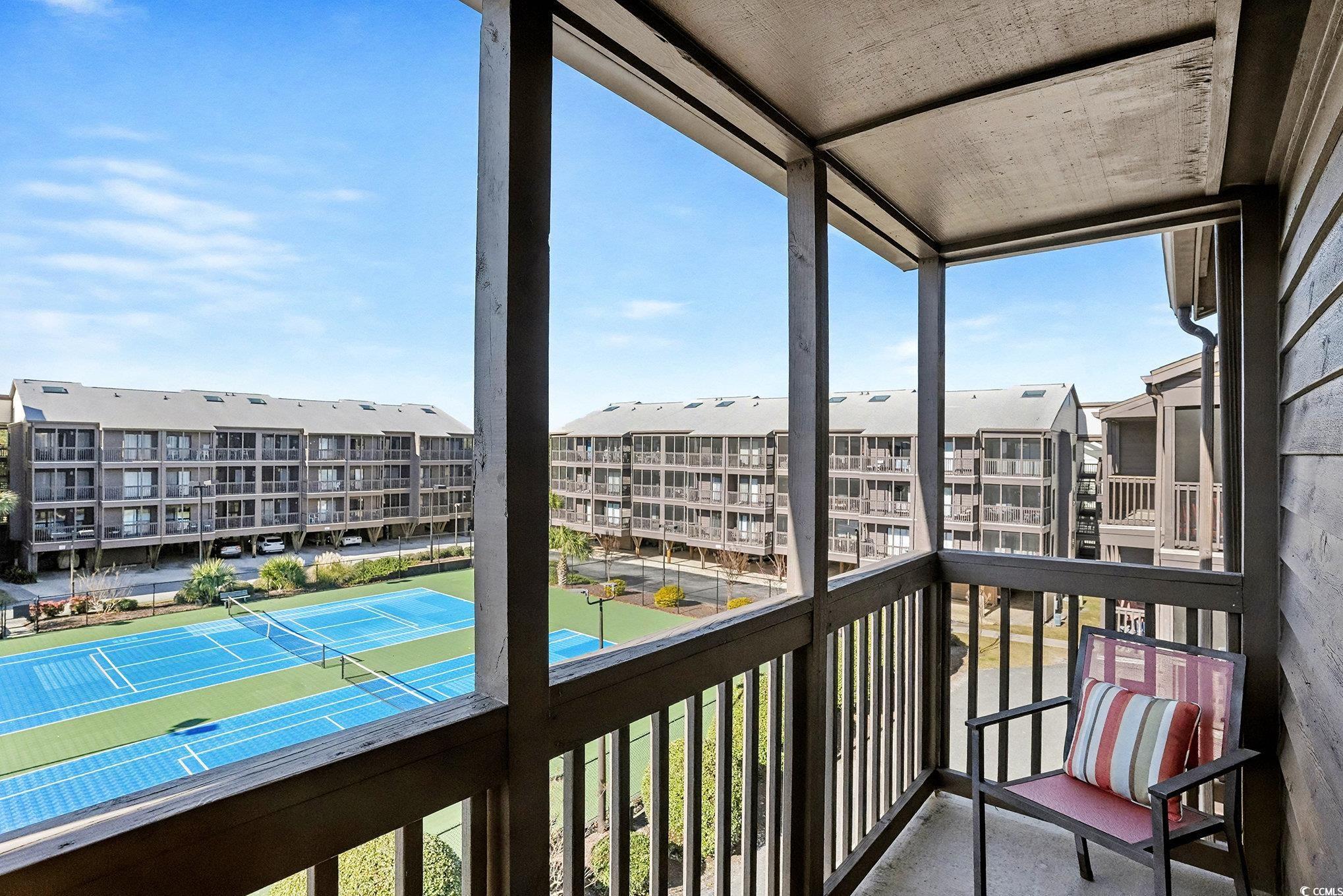 Welcome to Tilghman Tennis & Racquet Club, a beautifully maintained 3-bedroom, 2.5-bath end-unit condo offering exceptional natural light, multiple outdoor living spaces, and a prime North Myrtle Beach location. Conveniently located near the elevators, this unit combines accessibility with privacy and space. As an end unit, this condo benefits from additional windows, creating a bright and airy atmosphere throughout. The open-concept living and dining area is highlighted by a skylight above the dining space, flooding the heart of the home with natural light. The living room opens to a private screened balcony overlooking the tennis courts and community amenities, providing the perfect spot to relax and enjoy coastal breezes. The kitchen offers ample cabinetry and counter space and flows seamlessly into the dining area—ideal for entertaining or casual coastal living. Equipped with stainless steel appliances. A convenient half bath is located off the main living area for guests. The primary suite features its own private balcony, offering a peaceful retreat with elevated views and a quiet place to unwind. Two additional bedrooms provide flexibility for guests, family, or a home office. With 2.5 bathrooms, the layout is well-suited for both everyday living and hosting visitors. This condo has not been rented, reflecting pride of ownership and making it an excellent option for a primary residence, second home, or future investment. Tilghman Tennis & Racquet Club is known for its resort-style amenities, including tennis courts, swimming pools, and beautifully maintained grounds, all just a short walk to the beach and close to dining, shopping, and entertainment. Buyer is responsible for verification.