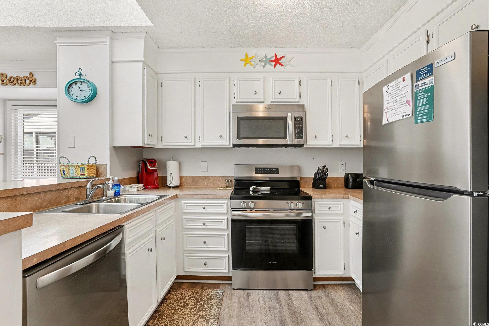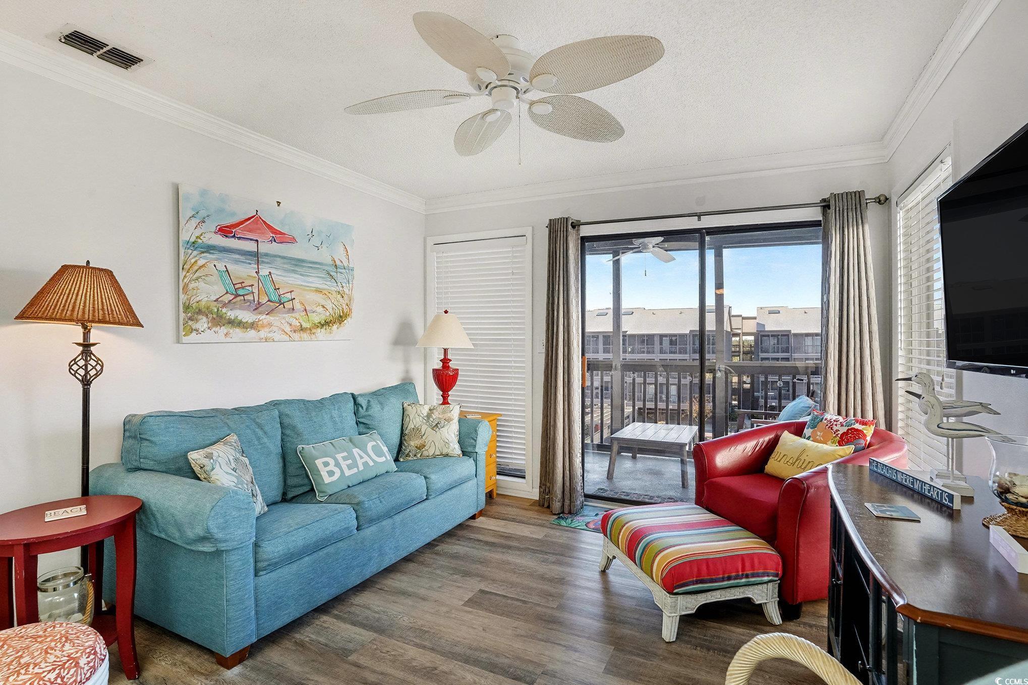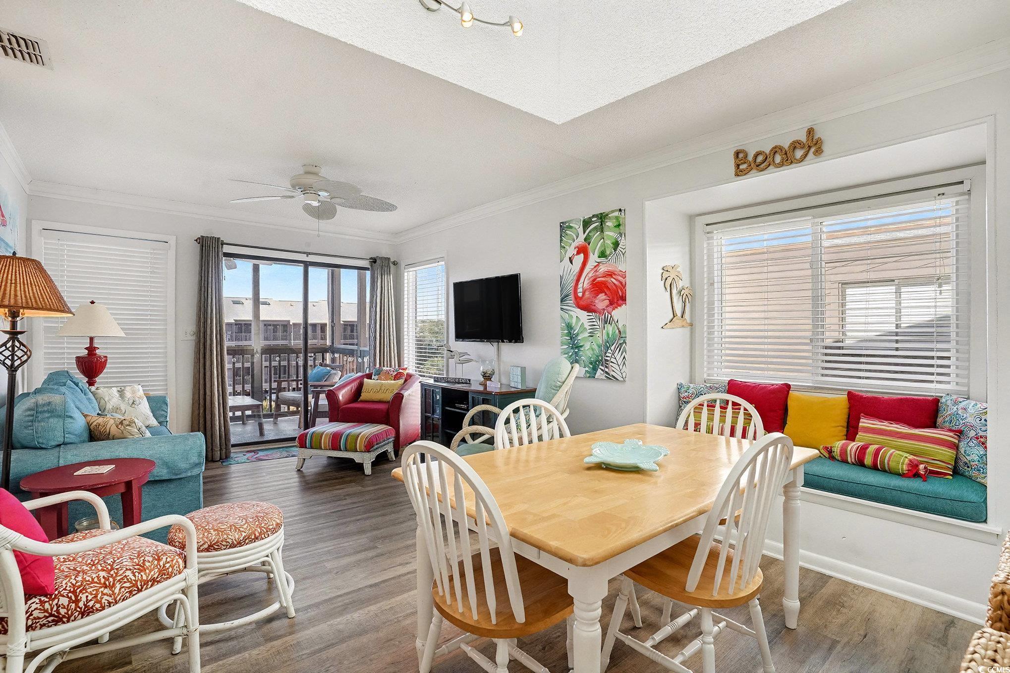 Welcome to Tilghman Tennis & Racquet Club, a beautifully maintained 3-bedroom, 2.5-bath end-unit condo offering exceptional natural light, multiple outdoor living spaces, and a prime North Myrtle Beach location. Conveniently located near the elevators, this unit combines accessibility with privacy and space. As an end unit, this condo benefits from additional windows, creating a bright and airy atmosphere throughout. The open-concept living and dining area is highlighted by a skylight above the dining space, flooding the heart of the home with natural light. The living room opens to a private screened balcony overlooking the tennis courts and community amenities, providing the perfect spot to relax and enjoy coastal breezes. The kitchen offers ample cabinetry and counter space and flows seamlessly into the dining area—ideal for entertaining or casual coastal living. Equipped with stainless steel appliances. A convenient half bath is located off the main living area for guests. The primary suite features its own private balcony, offering a peaceful retreat with elevated views and a quiet place to unwind. Two additional bedrooms provide flexibility for guests, family, or a home office. With 2.5 bathrooms, the layout is well-suited for both everyday living and hosting visitors. This condo has not been rented, reflecting pride of ownership and making it an excellent option for a primary residence, second home, or future investment. Tilghman Tennis & Racquet Club is known for its resort-style amenities, including tennis courts, swimming pools, and beautifully maintained grounds, all just a short walk to the beach and close to dining, shopping, and entertainment. Buyer is responsible for verification.