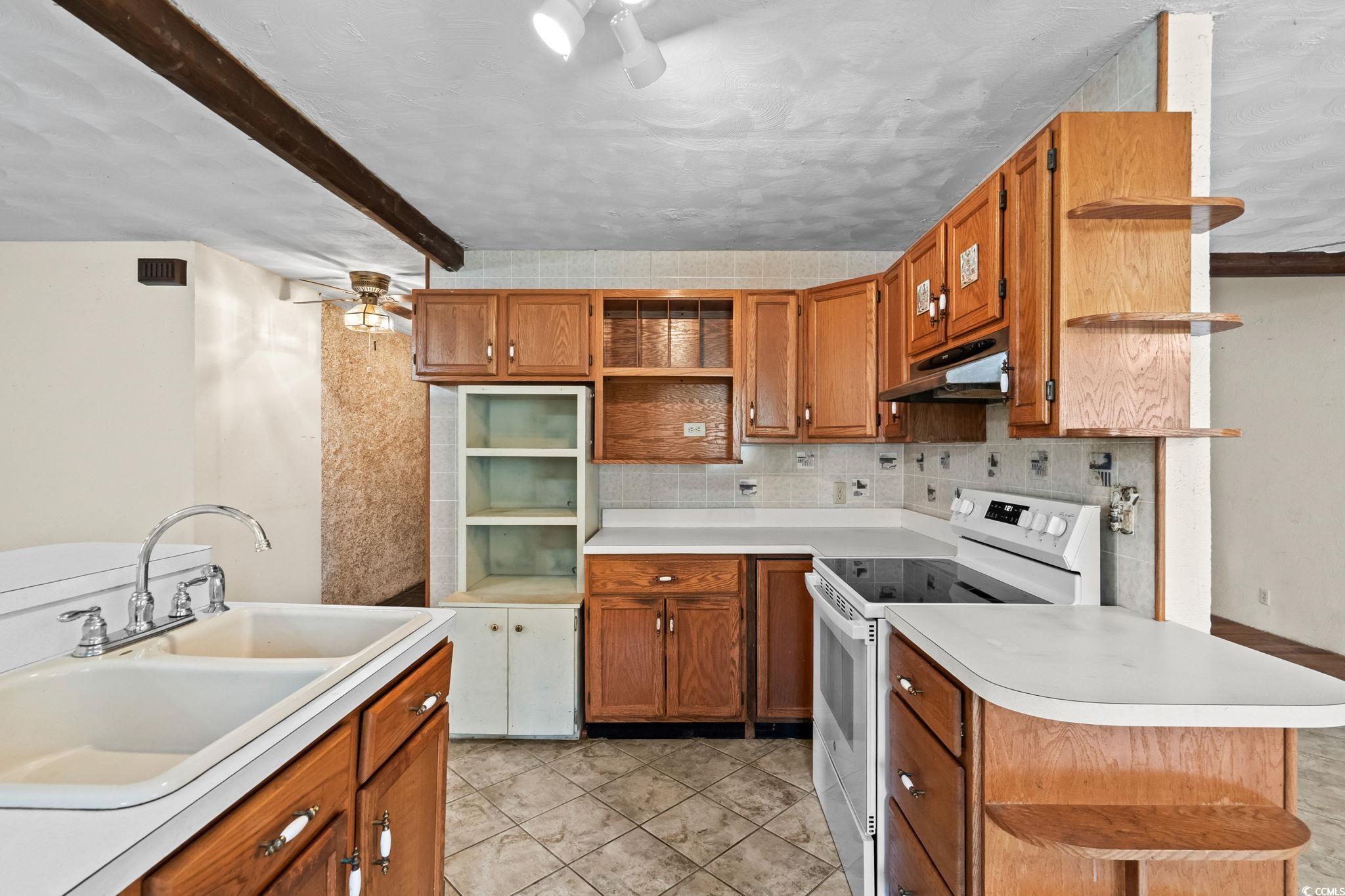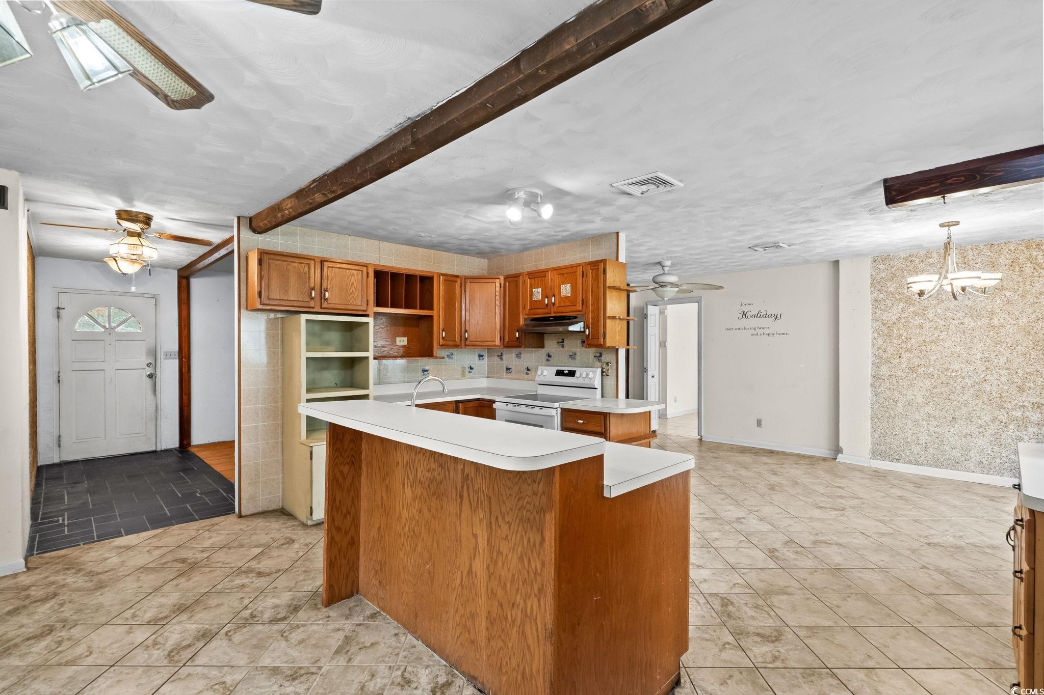 Welcome to Caropines, a Surfside Beach community. Don't miss this 4 bedroom 2 bath all stucco home. This home has tons of character, including a fireplace in the gathering room. Large room openings with beautiful dark beams. The back yard is huge, the lot measures approximately 200 feet deep! Fenced yard. Great neighborhood And most importantly, this home is located 1 mile from the blue Atlantic Ocean! An easy walk or golf cart ride to the beach. Call today to tour this home!