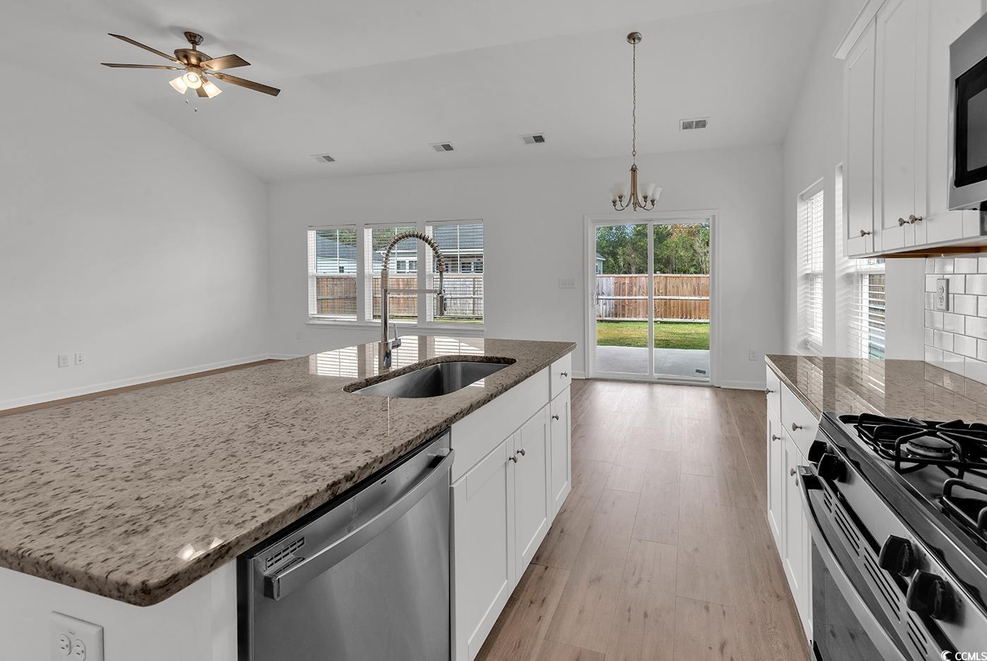 Excellent opportunity to purchase this 4-year-old, one level home without steps in the quaint, natural gas community of Queens Park. New LVP flooring flows throughout the main living space, and the interior has been freshly painted. The kitchen comes equipped with stainless steel appliances including gas range, work island, white cabinetry & subway tile backsplash and adjoins the great room with vaulted ceilings. The owner's suite boasts a tray ceiling, two sinks, shower and a substantial walk-in closet. A glass slider off the breakfast nook allows access to the spacious fenced-in backyard with covered porch. Queens Park is an established 82-home community with low HOA dues situated near the intersection of highways 90 and 22, approximately 10 miles from the beach! Call your agent and schedule a showing today.