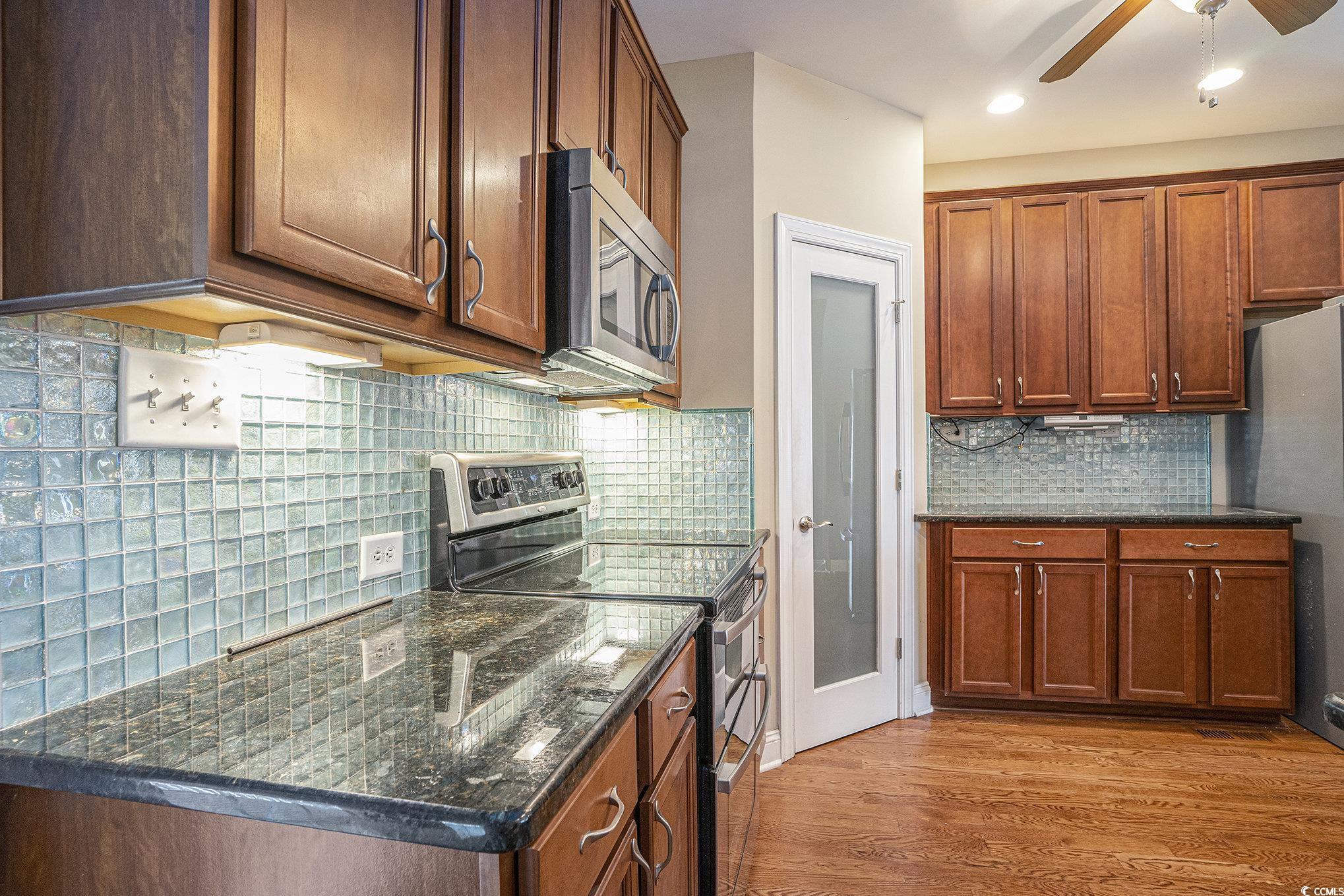 Coastal Living at Its Finest -an elegant, raised beach-style home nestled within the private, gated community of The Bays at Litchfield. This beautiful home offers the ideal blend of low-maintenance living, modern convenience, and relaxed coastal charm. Step inside and take the private elevator from the enclosed three-car garage to the main living area, where you'll be greeted by an inviting open-concept layout, gorgeous wood flooring, and abundant natural light. The spacious kitchen is a chef's delight, featuring granite countertops, stainless steel appliances, ample cabinetry, a breakfast bar, and pantry-all flowing seamlessly into the dining and living areas, ideal for entertaining. Enjoy peaceful mornings or relaxing evenings on the large screened-in porch, surrounded by nature. The owner's suite offers generous space for a king-sized bed and furnishings, with a luxurious ensuite bath. Two additional guest bedrooms and a full bath are located on the upper level, along with a cozy sitting area for visitors. The ground floor also includes a versatile space perfect for a bedroom, office, or media room, plus a full bath, laundry area, and access to a patio overlooking the backyard. Residents enjoy a host of amenities, including a community pool, clubhouse, scenic walking trails, and fishing in the community's natural bay. Best of all, enjoy golf cart access to Litchfield Beach, local restaurants, and more-just minutes from your doorstep. Conveniently located near shopping, dining, and only a short drive to Myrtle Beach, Historic Georgetown, and charming Charleston. Don't miss this opportunity-schedule your private tour today!