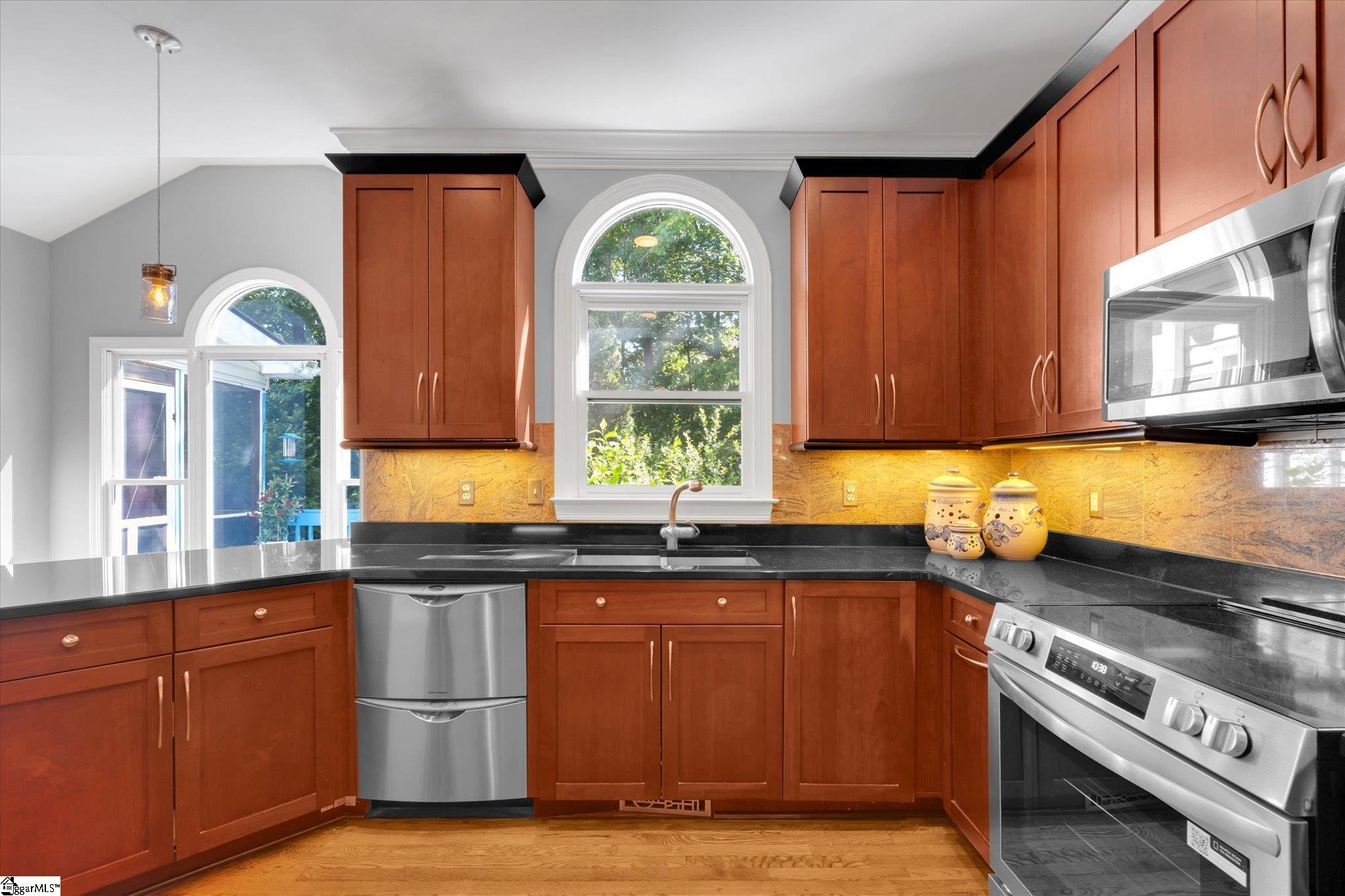 Priced Below Appraisal Value!!! Beautifully maintained home in the sought-after Neely Farm community! This house sits on a picturesque lot with mature landscaping in a charming garden, both offering privacy and curb appeal. It features four bedrooms plus a large bonus room, a valuable distinction in this Neighborhood. Recent upgrades include a three year-old roof, brand new HVAC, new range and microwave. House has been freshly painted throughout. Inside, you will find real hardwood floors on both levels, generous natural light, and thoughtful details, such as custom shelving in the walk-in closet that remains with the home. Storage is abundant with a floor attic, a spacious high crawl space with shelving and additional storage under the porch. Step outside to your own backyard retreat: a tile screening porch and wood deck overlooking a brick patio, irrigated yard, a small pond and beautiful hardwood trees, perfect for relaxing and entertaining. This home is also energy efficient, featuring added attic insulation, an attic tent, dual flush toilets, stainless steel dishwasher with a split load capability, tankless water heater, smart, thermostats, and LED lighting throughout. A rare combination of updates, efficiency, and outdoor living! This beautiful and unique home in Neely Farm, one of the most desirable communities in the Upstate where residents enjoy exceptional amenities, and convenient access to restaurants, shopping and top rated schools, is ready for its new owner.