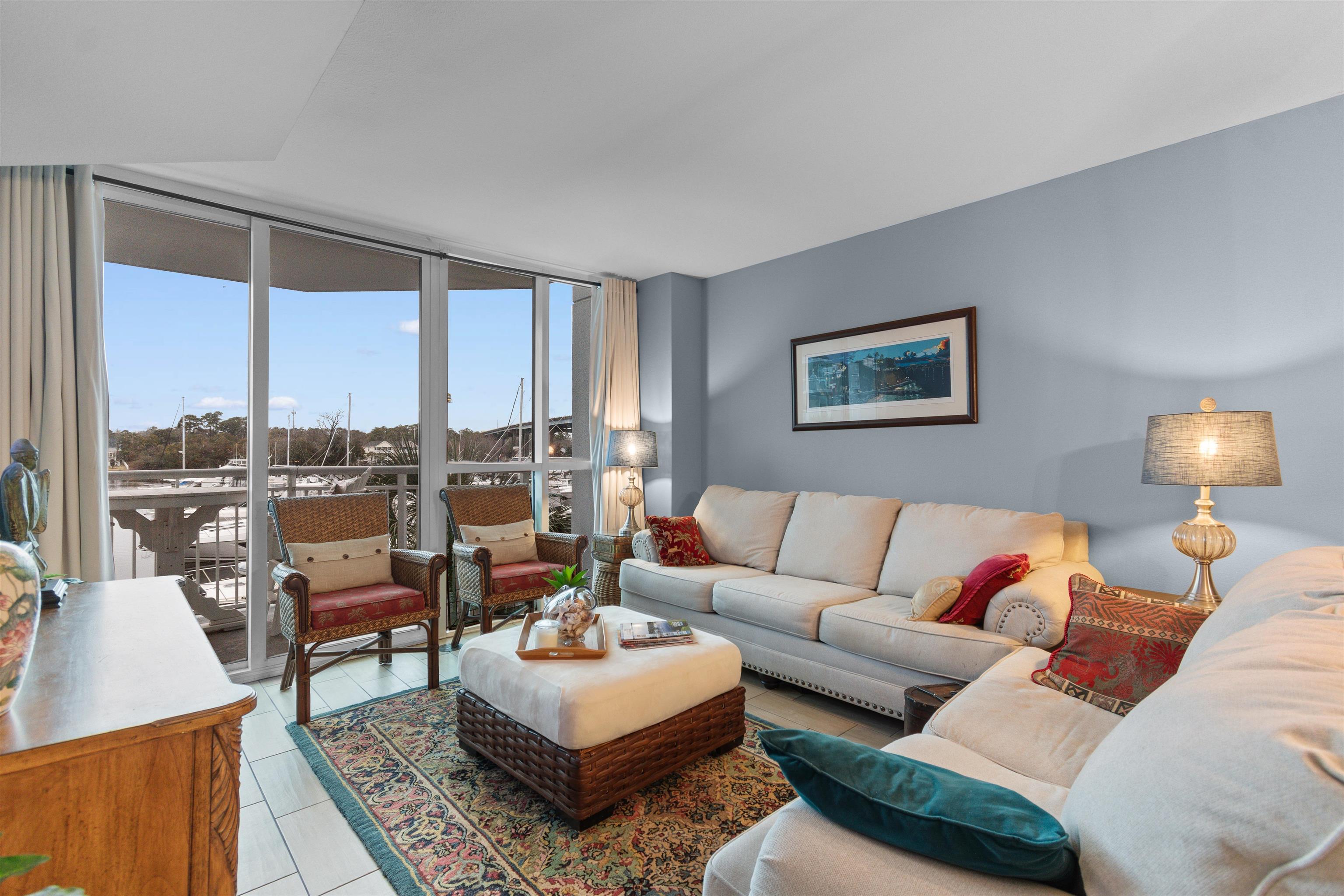 Welcome to waterfront living at its finest in Harbourgate Marina, located directly on the scenic Intracoastal Waterway in desirable Little River. This beautifully decorated 3-bedroom, 2-bath condo offers stunning marina views and an abundance of natural light throughout. Enjoy tile and laminate flooring, granite countertops, stainless steel appliances, and a spacious open layout designed for both comfort and entertaining. The large primary suite features private sliding door access to the balcony overlooking the marina, creating the perfect spot for morning coffee or evening sunsets. The master bath includes a walk-in shower, water closet, generous vanity space, and additional storage. Both bathrooms are well-appointed with updated finishes. You’ll love the extra storage throughout the unit — including additional storage in the kitchen, living area, and bathrooms — a rare and valuable feature for condo living. The partially furnished interior makes this property move-in ready and ideal as a primary residence, vacation getaway, or income-producing rental. Relax on your private patio and take in the peaceful waterway views, all while being just minutes from beaches, golf, dining, and everything the North Myrtle Beach area has to offer. If you’re looking for light-filled, marina-front living in one of Little River’s most desirable waterfront communities, this is it.