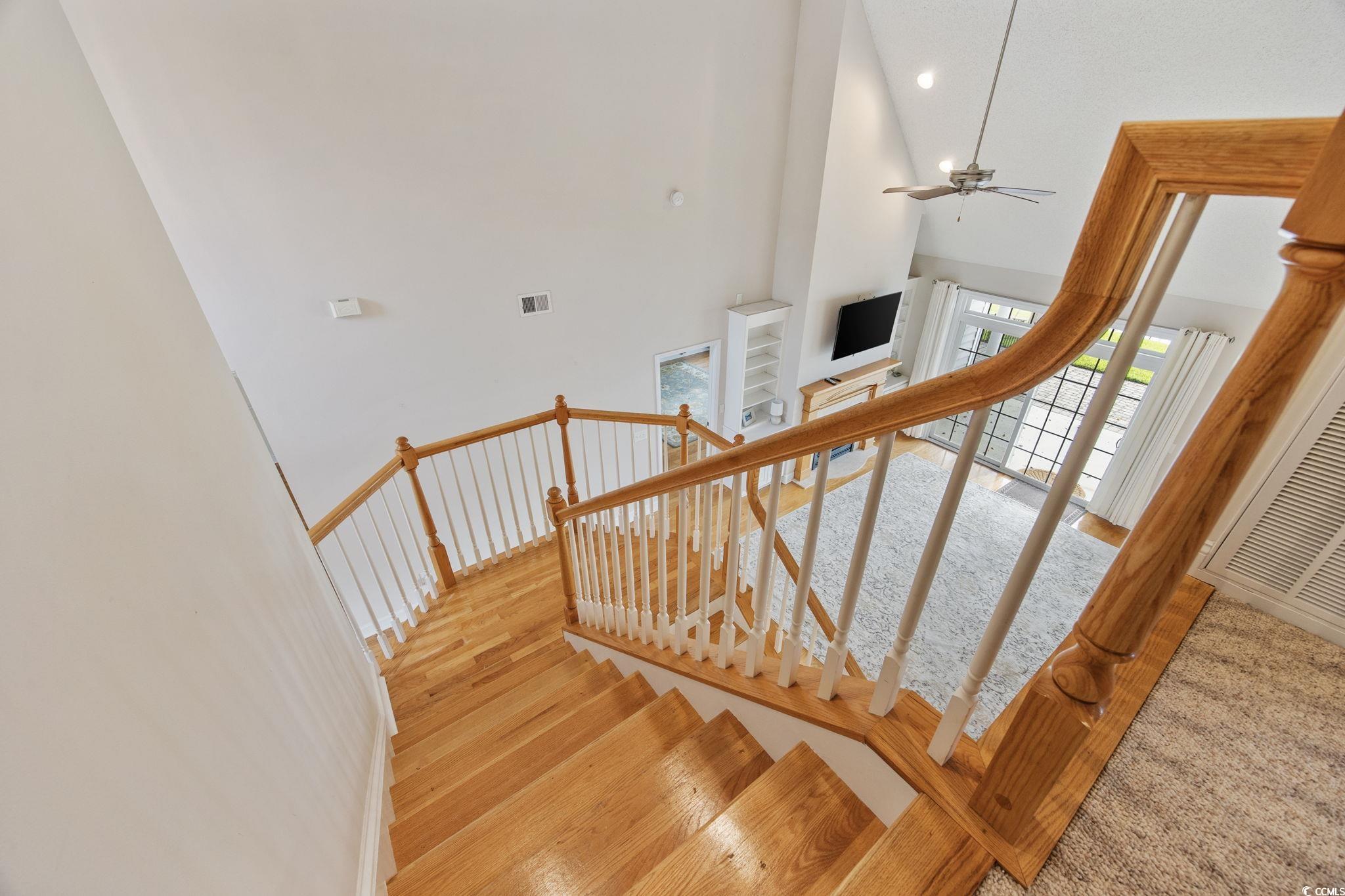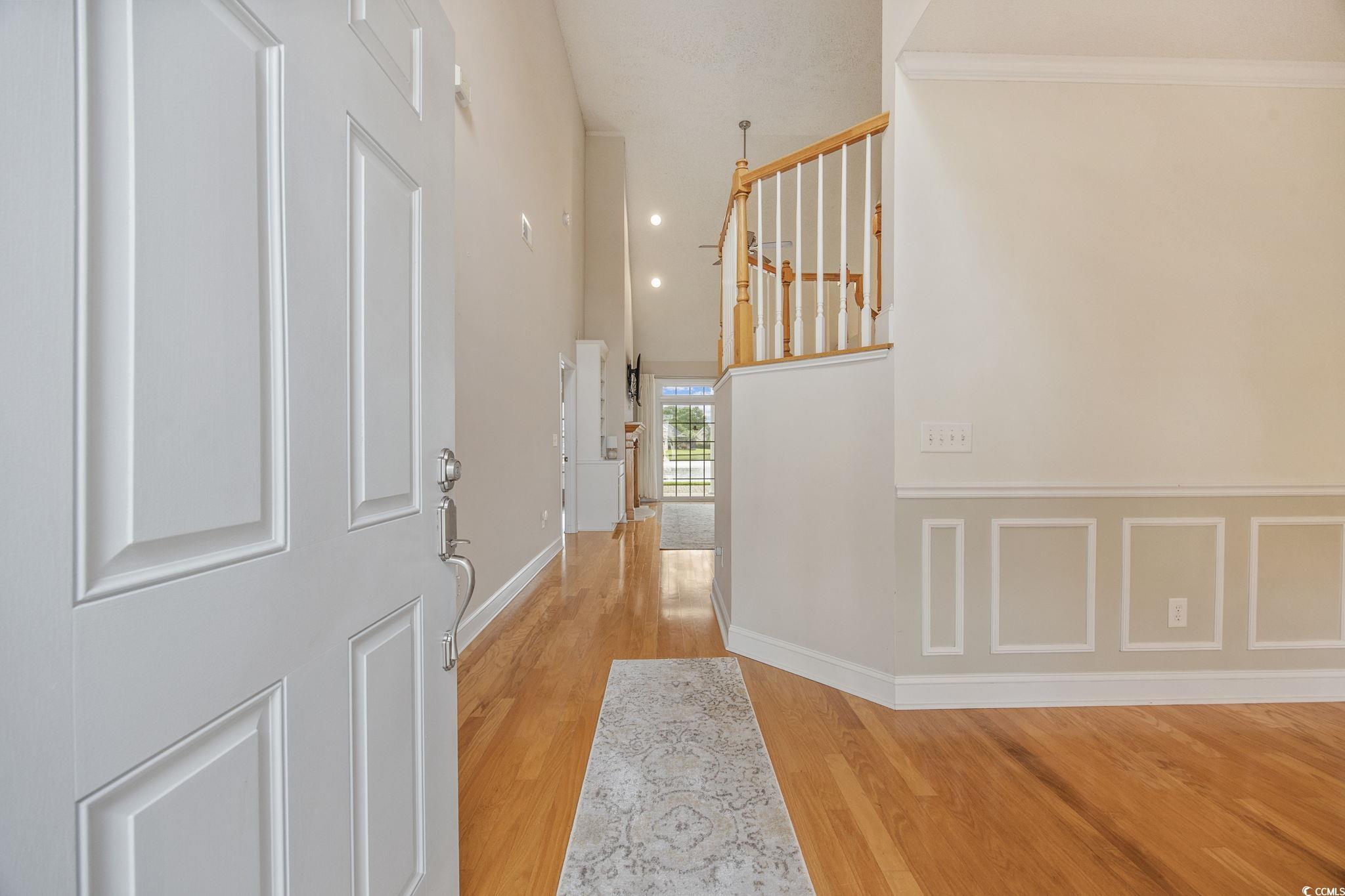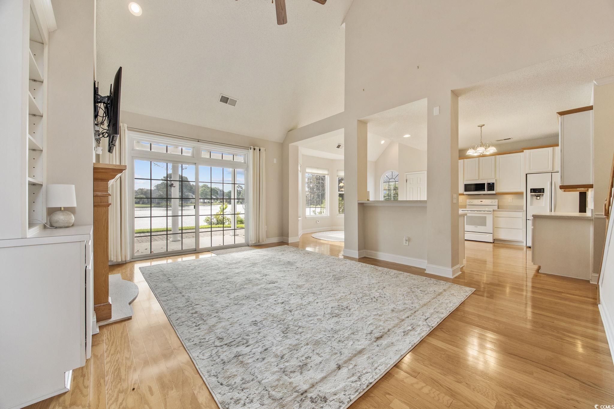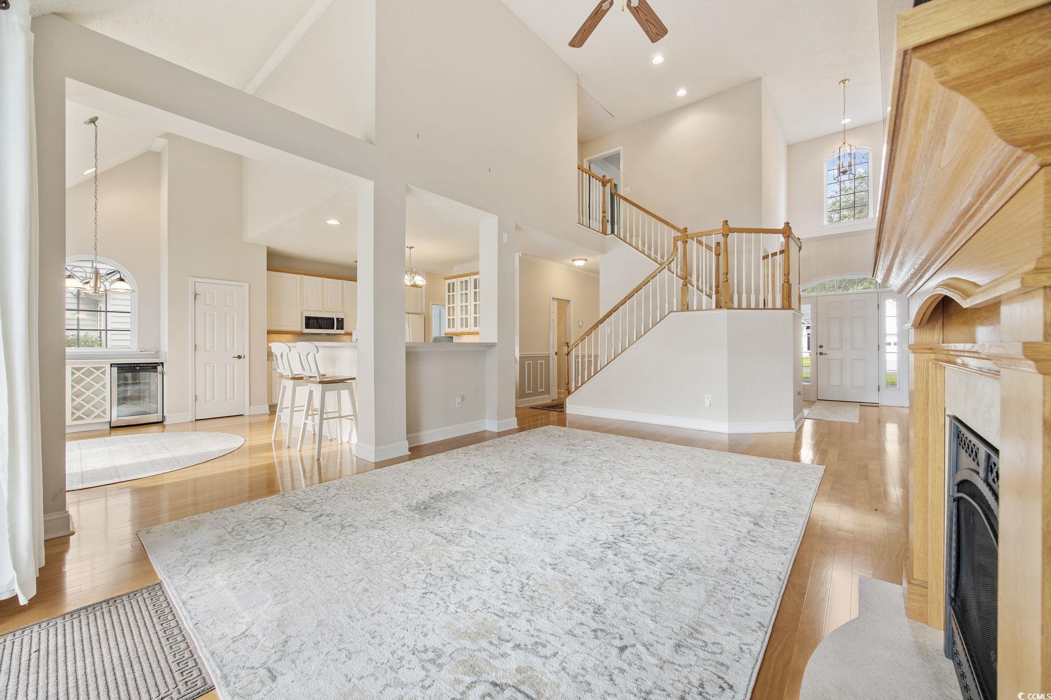 Welcome to this charming 4-bedroom, 2.5-bath home in the desirable 55+ gated community of Burning Ridge. Perfectly positioned between Hwy 501 and Hwy 544, you’ll enjoy easy access to Coastal Carolina University, Conway Medical Center, shopping, dining, and just a short drive to the beach. Step inside and you’re greeted by soaring 18-foot ceilings in the living room, highlighted by a cozy gas fireplace, with the TV included for added convenience. Right off the entrance is a formal living room, and the dining room shines with wainscoting and an elegant chandelier, creating the perfect space for hosting. The beautiful wooden staircase leads upstairs, where you’ll find carpeted bedrooms and a full bath, ideal for guests or hobbies. The spacious primary suite is located on the first floor and features hardwood flooring, a dual vanity, and a large walk-in shower. Off the master, a sunroom opens directly to the back patio, extending your living space outdoors. The kitchen boasts a breakfast bar, and plenty of cabinetry, while the laundry area comes fully equipped with a washer and dryer. The garage is outfitted with built-in cabinetry and shelving, providing excellent organization and storage. Outdoor living is equally impressive with a back patio accented by columns and a covered pergola, a lovely backyard overlooking the pond, and proximity to the 7th hole of Burning Ridge Golf Course. An irrigation system keeps the landscaping easy to maintain. This golf course community features low HOA dues with access to a clubhouse, community pool, and more, giving you the perfect balance of relaxation and recreation. Whether you’re seeking a primary residence or a retirement retreat, this home blends convenience, style, and location in one incredible package.