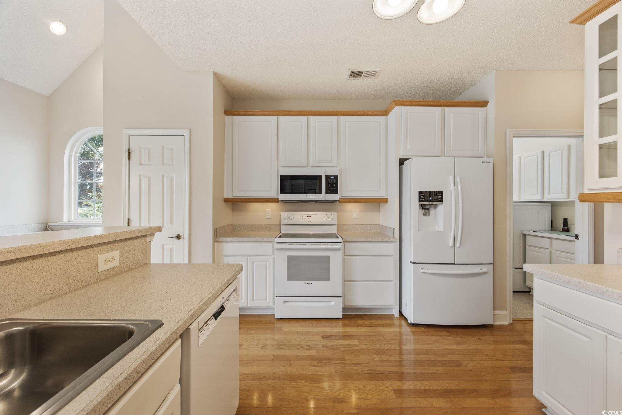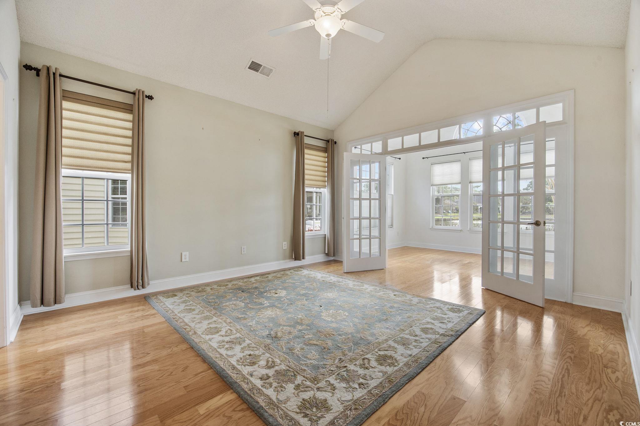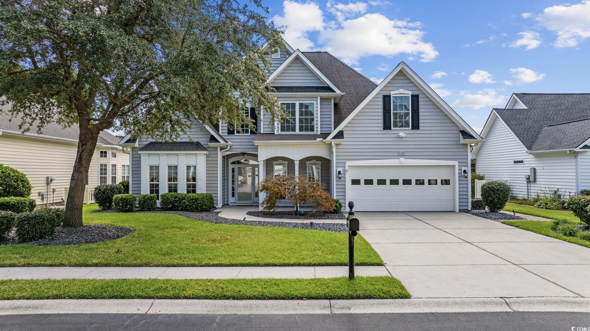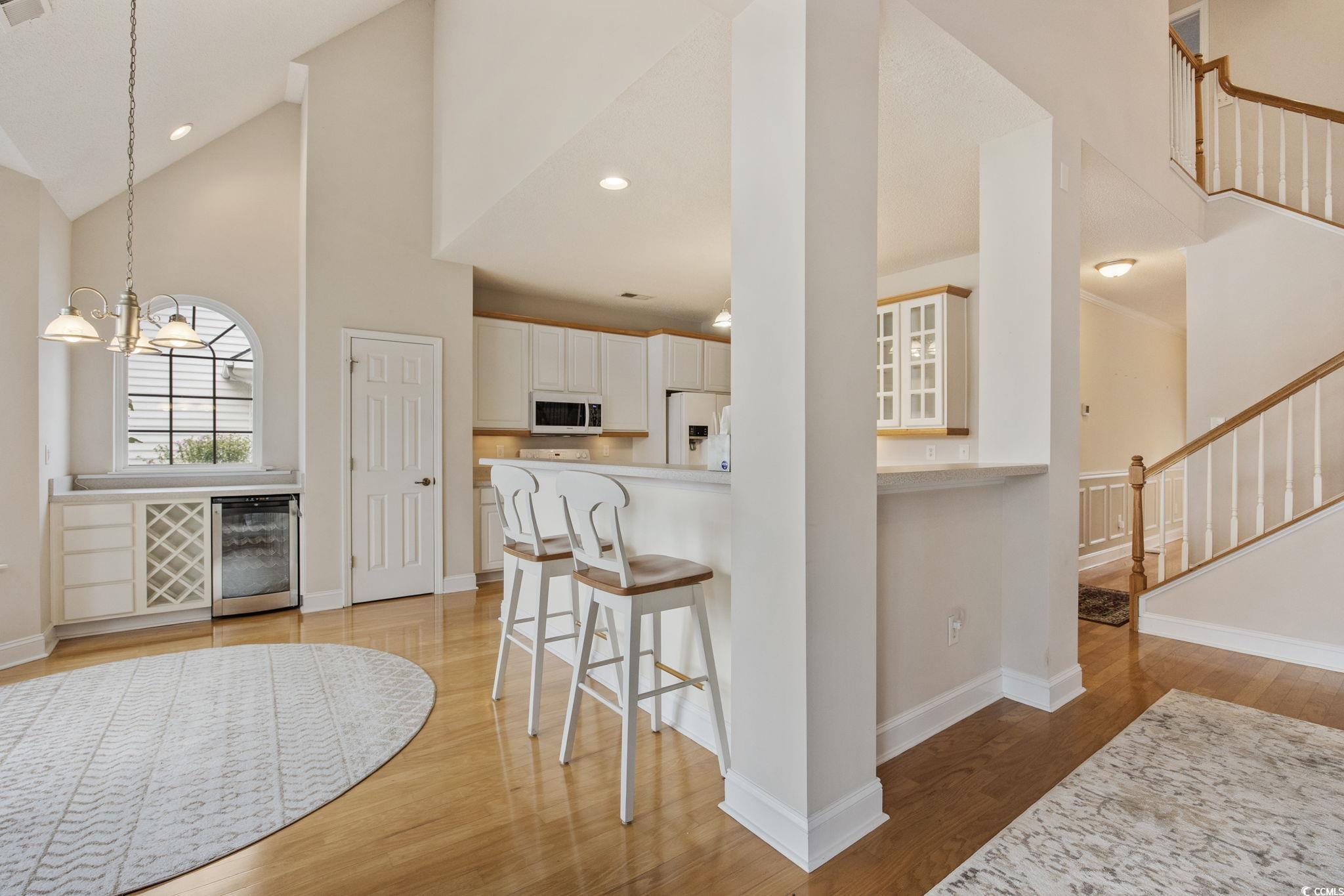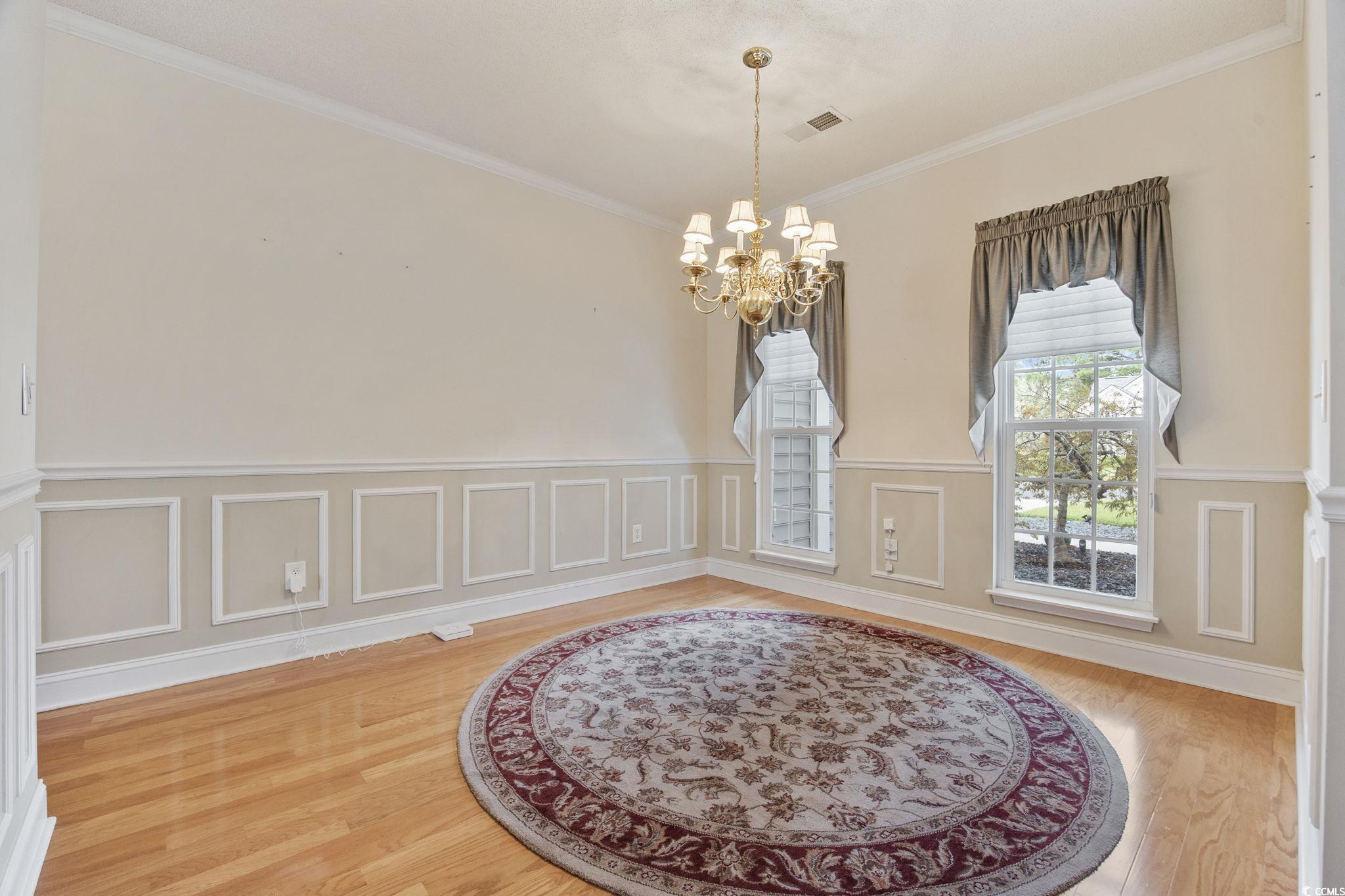 Welcome to this charming 4-bedroom, 2.5-bath home in the desirable 55+ gated community of Burning Ridge. Perfectly positioned between Hwy 501 and Hwy 544, you’ll enjoy easy access to Coastal Carolina University, Conway Medical Center, shopping, dining, and just a short drive to the beach. Step inside and you’re greeted by soaring 18-foot ceilings in the living room, highlighted by a cozy gas fireplace, with the TV included for added convenience. Right off the entrance is a formal living room, and the dining room shines with wainscoting and an elegant chandelier, creating the perfect space for hosting. The beautiful wooden staircase leads upstairs, where you’ll find carpeted bedrooms and a full bath, ideal for guests or hobbies. The spacious primary suite is located on the first floor and features hardwood flooring, a dual vanity, and a large walk-in shower. Off the master, a sunroom opens directly to the back patio, extending your living space outdoors. The kitchen boasts a breakfast bar, and plenty of cabinetry, while the laundry area comes fully equipped with a washer and dryer. The garage is outfitted with built-in cabinetry and shelving, providing excellent organization and storage. Outdoor living is equally impressive with a back patio accented by columns and a covered pergola, a lovely backyard overlooking the pond, and proximity to the 7th hole of Burning Ridge Golf Course. An irrigation system keeps the landscaping easy to maintain. This golf course community features low HOA dues with access to a clubhouse, community pool, and more, giving you the perfect balance of relaxation and recreation. Whether you’re seeking a primary residence or a retirement retreat, this home blends convenience, style, and location in one incredible package.