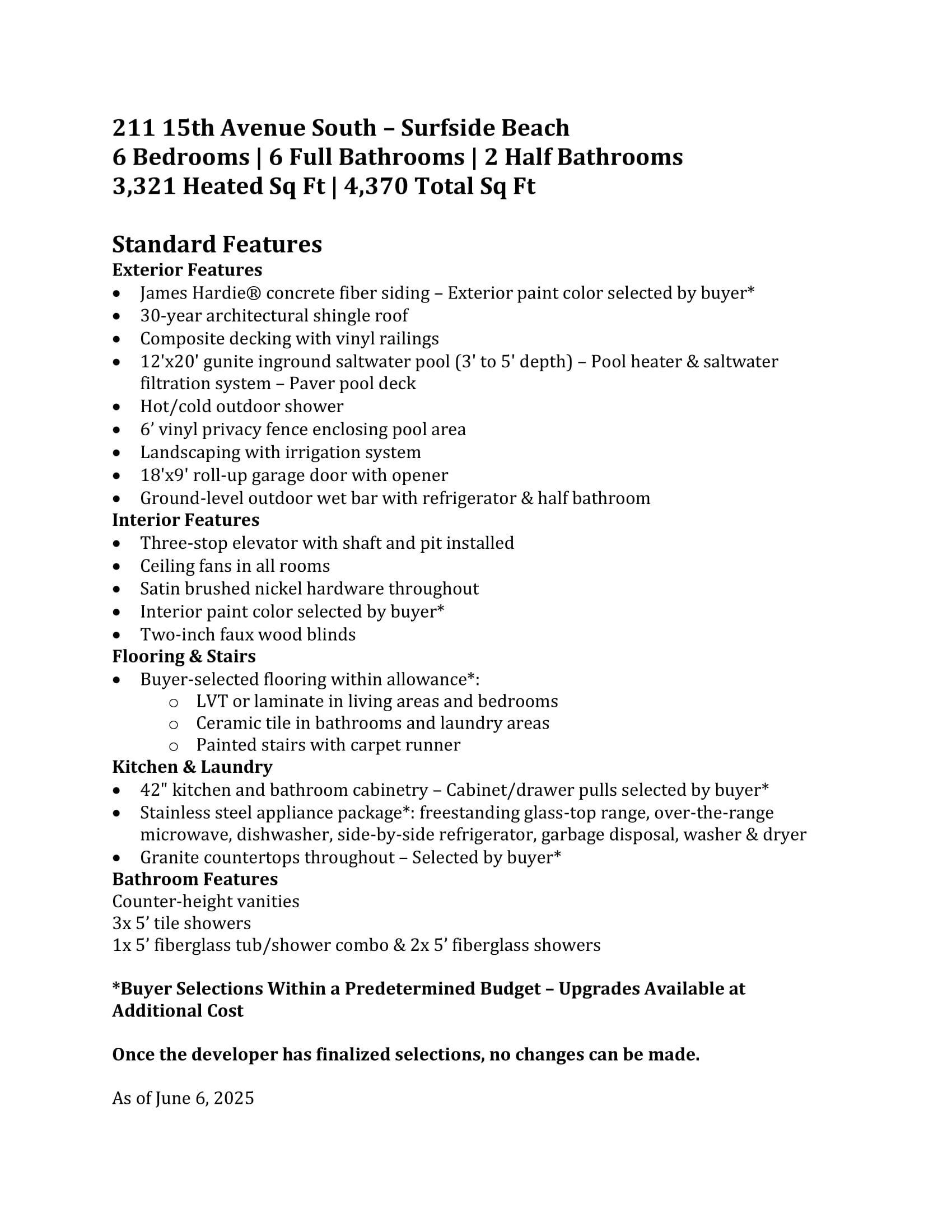 Just a short stroll away from your new home at 211A 15th Ave S (Left Side) "Toes in the Sand". Nestled in the charming Surfside Beach community and located approximately 250 yards from the ocean, this newly constructed beach house offers a perfect blend of comfort and luxury. This under-construction single-family home, due to be completed by May 1, 2026, boasts 3,321 heated square feet and 4,370 total square feet. It includes 6 bedrooms, 6 full bathrooms, and 2 half bathrooms, making it ideal for large families, group vacations, or high-performing short-term rentals. The exterior is designed for coastal durability with James Hardie concrete fiber siding, a 30-year architectural shingle roof, composite decking with vinyl railings, and a 6' vinyl privacy fence enclosing the backyard. Enjoy relaxing and entertaining in your own private oasis featuring a 12'x20' gunite saltwater pool (3' to 5' depth) with a heater, saltwater filtration system, paver pool deck, and hot/cold outdoor shower. A ground-level wet bar with a refrigerator and a half bath adds functionality to outdoor entertaining. Inside, the home features a three-stop elevator, ceiling fans in all rooms, two-inch faux-wood blinds, and satin-brushed-nickel hardware throughout. Flooring consists of LVT or laminate in the main living areas and bedrooms, and ceramic tile in bathrooms and the laundry room. The painted stairway features a carpet runner for added comfort. The property accommodates up to six vehicles, including space in the 18' x 9' garage. The kitchen features 42" upper cabinetry, granite countertops, and a stainless-steel appliance package with a freestanding glass-top range, microwave, dishwasher, side-by-side refrigerator, garbage disposal, and washer/dryer. Within a set allowance, buyers may select finishes such as cabinet hardware, countertops, flooring, and paint color, with upgrade options available. Bathrooms include counter-height vanities, three tile showers, one 5' fiberglass tub/shower combo, and two 5' fiberglass showers, offering both comfort and functionality. The home is zoned for short-term vacation rentals. It is within walking or golf-cart distance of Surfside Pier, restaurants, shops, parks, tennis and bocce courts, a baseball diamond, the library, and the seasonal farmers market. Myrtle Beach is a short 20-minute drive away. View the Matterport 3D Virtual Tour at www.bit.ly/7BRVirtualTour and www.bit.ly/4kMhWwg for a preview of what the finished home may look like. Images and virtual tours are of similar completed models and are for illustrative purposes only. For a spacious, well-appointed beach home in a prime location, 211A 15th Ave S offers excellent value and investment potential. 211B is the twin of 211A, also for sale and currently under construction, with completion scheduled for January 1, 2026.