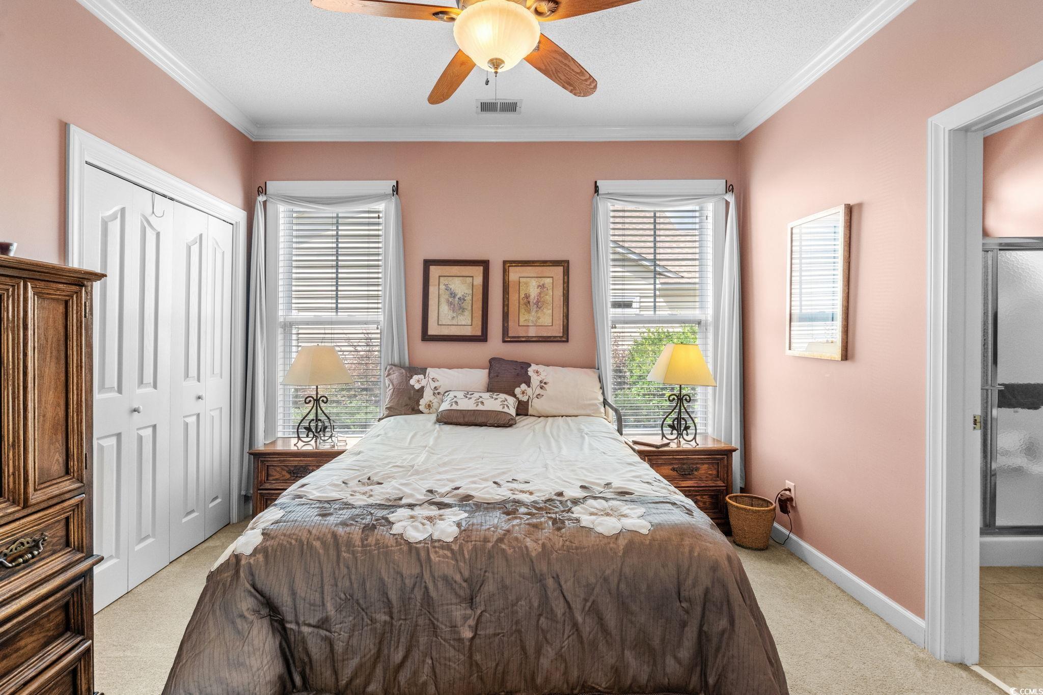 Welcome to this beautifully maintained custom-built 4-bedroom, 3.5 bath all brick home, designed for both luxury and functionality. Elegant details like French doors in the living room, custom crown molding, and designer ceiling fans add charm throughout. Enjoy a sunroom, screened patio with skylights, and serene pond views. The spacious master suite includes a walk-in shower, walk-in tub with safety features, double vanities & a walk-in closet. Three bedrooms feature en-suite baths, while the fourth is perfect as an office or media room. Kitchen is well equipped with newer appliances, under cabinet lighting & pull-out drawers in the cabinets. A connected laundry room leads to a 2-car garage with wall-to-wall cabinets providing abundant storage space, plus a large walk-up attic for even more space. Wood floors in main living area, tile floors in wet areas & carpet in 2 of the bedrooms. Recent updates include a newer roof with leaf guard gutters, appliances, HVAC, water heater and high-end finishes. An in-ground irrigation system with separate meter keeps the yard pristine. Located in an amenity-rich community offering a pool, hot tub, tennis, bocce, gym, playground, and clubhouse—just minutes from beaches, golf, boat landings, and historic downtown Georgetown. Give us a call for a list of all the upgrades completed on this home...you won't be disappointed!!! Don’t miss this rare Lowcountry gem—schedule your showing today!