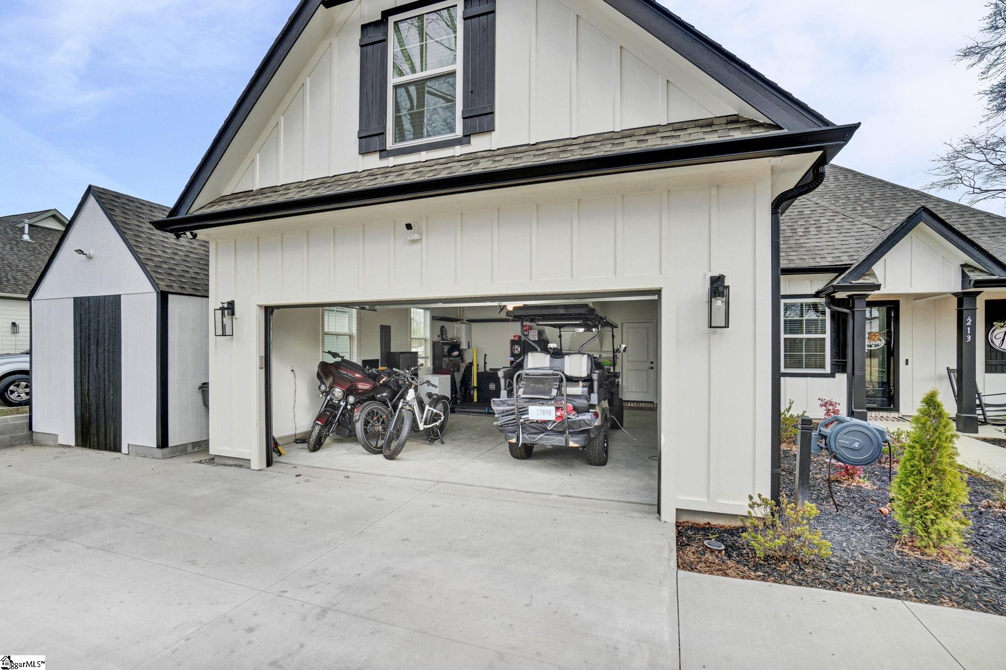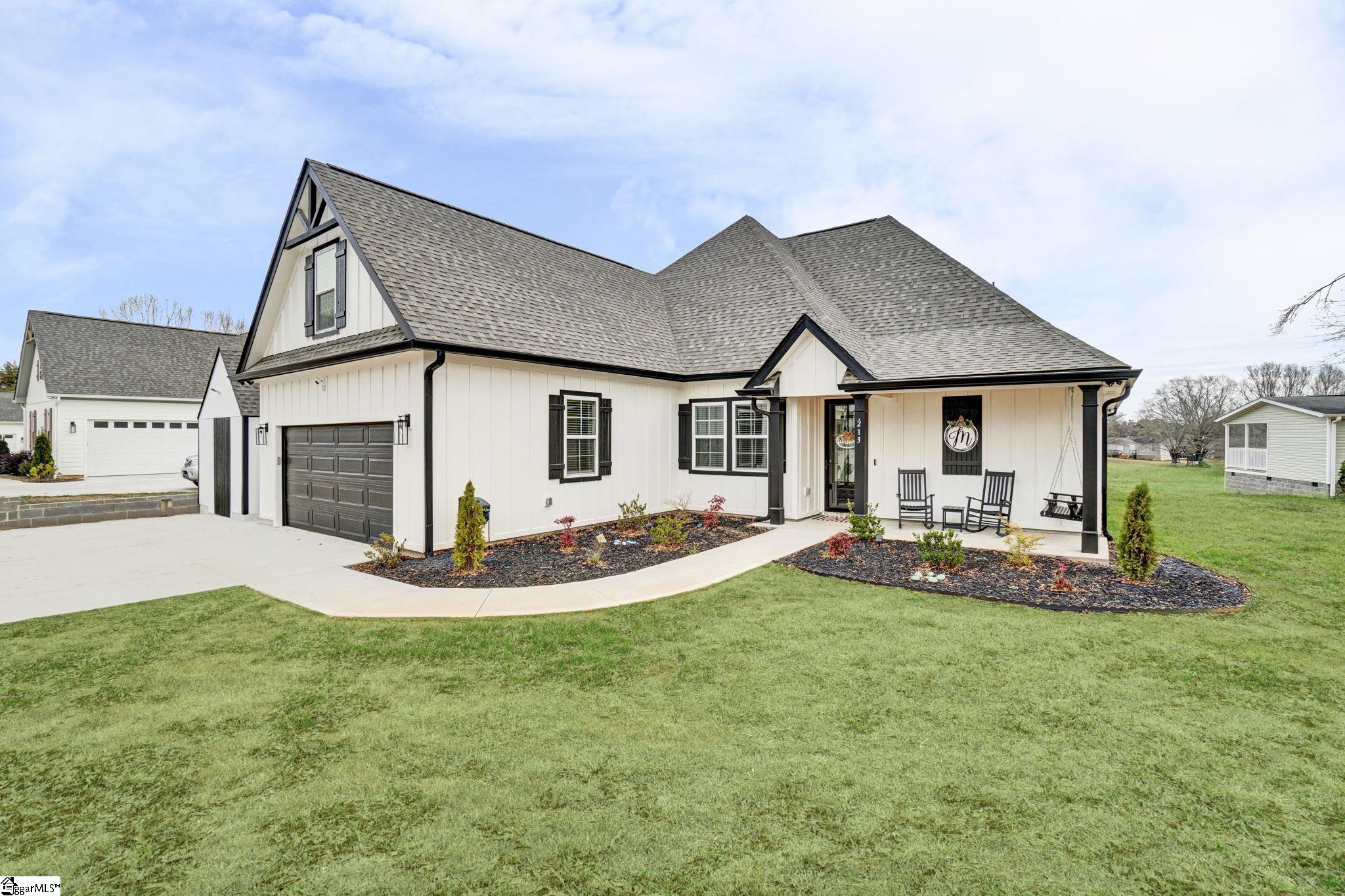 Built by Ellys Construction and completed in late 2024, this Craftsman-style home sits on a rare .91-acre lot with no HOA, just minutes from Downtown Simpsonville, Heritage Park, and Downtown Fountain Inn, with Downtown Greenville only about a 25-minute drive away. From the covered front porch, you enter into a welcoming foyer with a dedicated office just off the entry, offering a quiet and functional space for work or flexible use. The home opens into a centrally located living room that anchors the layout and flows naturally into the kitchen and breakfast nook, creating an easy, connected space for everyday living and entertaining. The kitchen is both practical and polished, featuring white cabinetry, quartz countertops, a large center island, farmhouse sink, subway tile backsplash, a built-in wine fridge, and a stainless gas range, while the adjacent breakfast nook overlooks the covered rear patio and backyard, extending the living space outdoors. The primary suite is privately positioned on the main level and features a tray ceiling and a well-finished bathroom with a dual-sink vanity, quartz countertops, matte black fixtures, and a tiled walk-in shower with dual shower heads, a built-in bench, recessed niches, and a glass enclosure, along with his-and-hers walk-in closets, one with a pocket door for added functionality. Two additional bedrooms and a full bath are located on the opposite side of the home, providing separation from the primary suite, and a main-level laundry room is conveniently positioned near the garage entry. Upstairs, a large bonus room is set apart from the main living areas and includes two additional closets, allowing it to easily function as a fourth bedroom if preferred, as well as flexible space for a media room, guest area, or recreation. Outside, the nearly one-acre .91-acre lot provides space and breathing room that’s increasingly hard to find, with a covered rear patio already equipped with a natural gas line for a grill, a post-construction whole-home Generac backup generator that runs on natural gas for added peace of mind, and a separate storage building with electricity that is constructed to allow a future door, making it an ideal spot for a motorcycle, golf cart, or workshop setup, all in a prime location that balances space, function, and convenience.