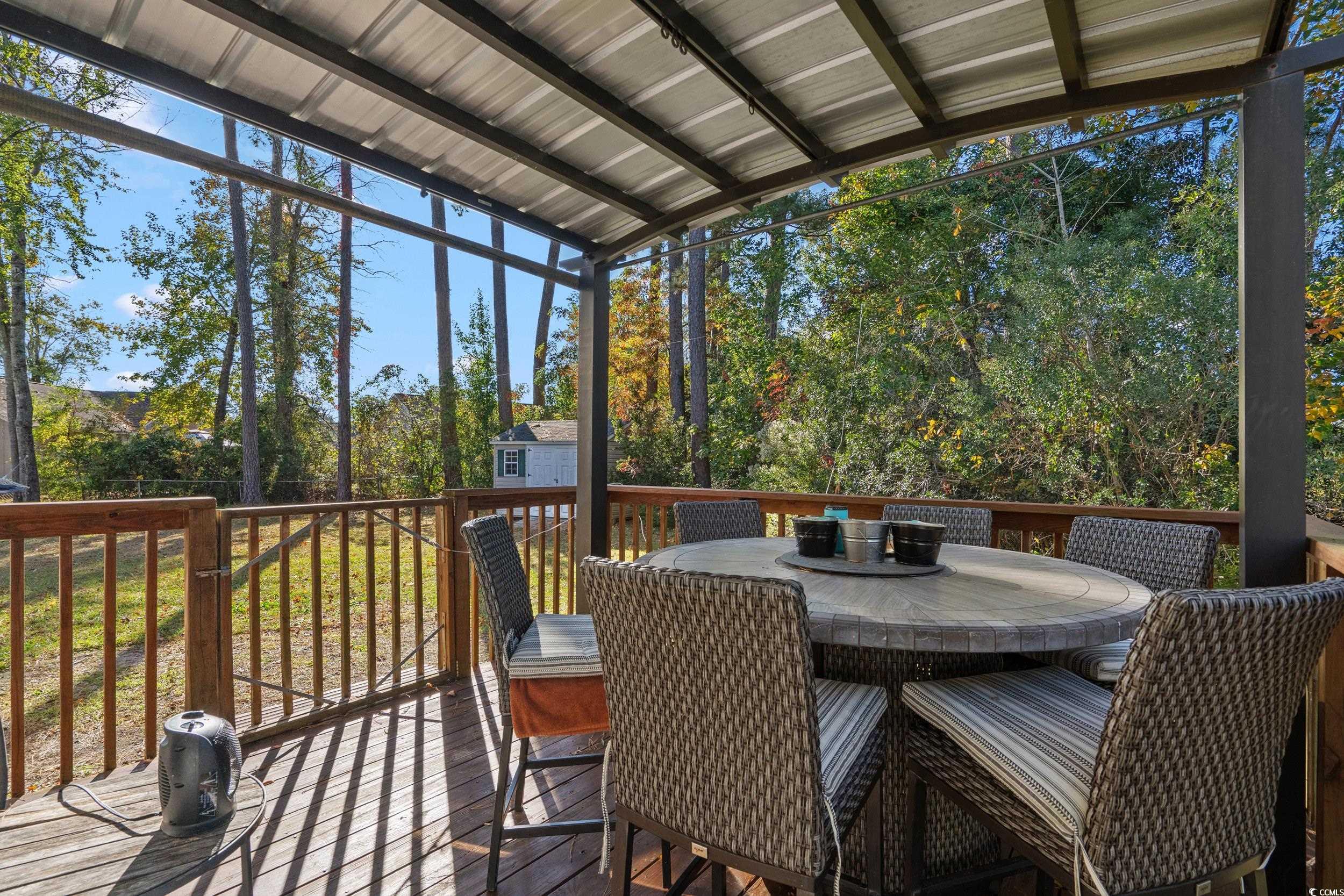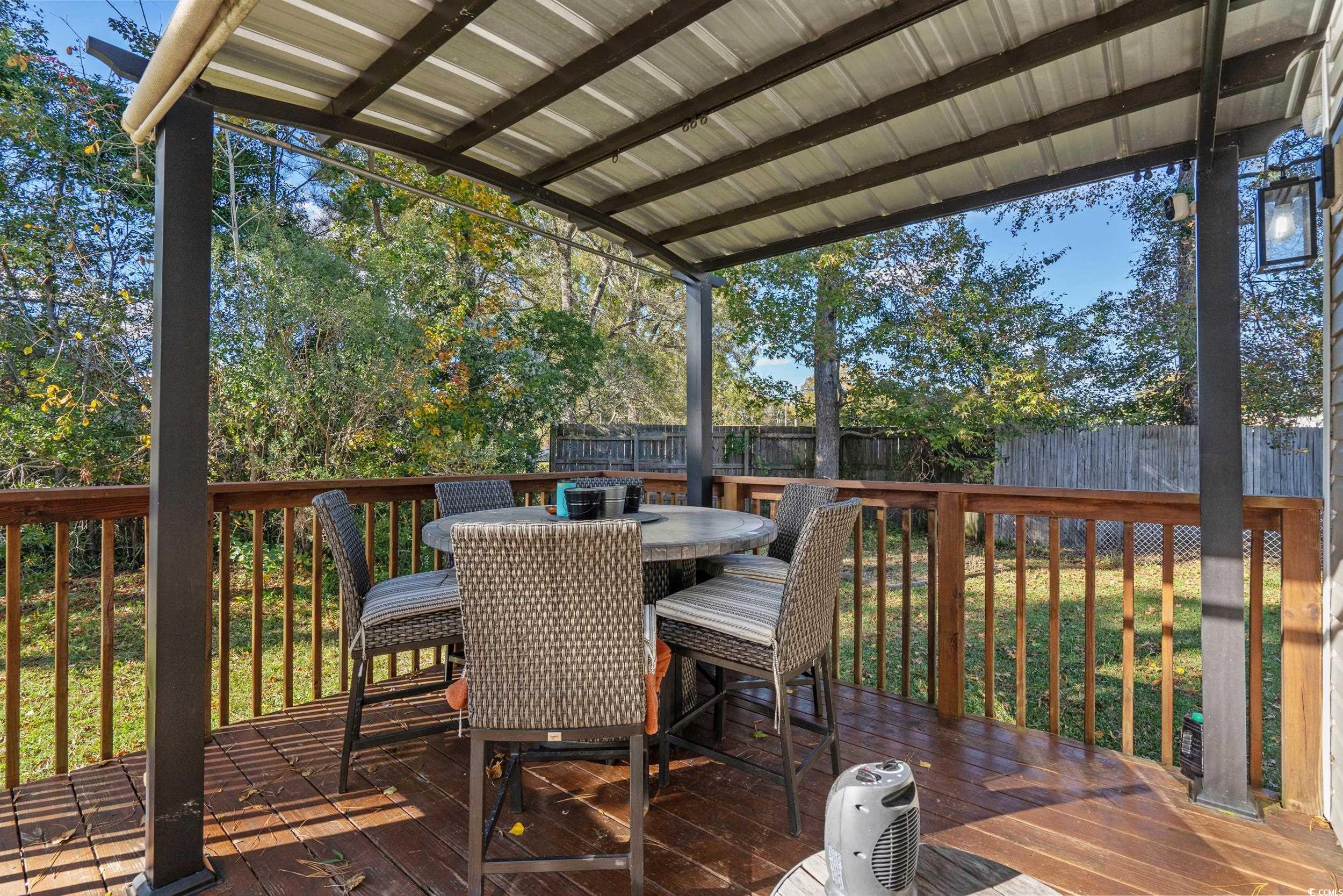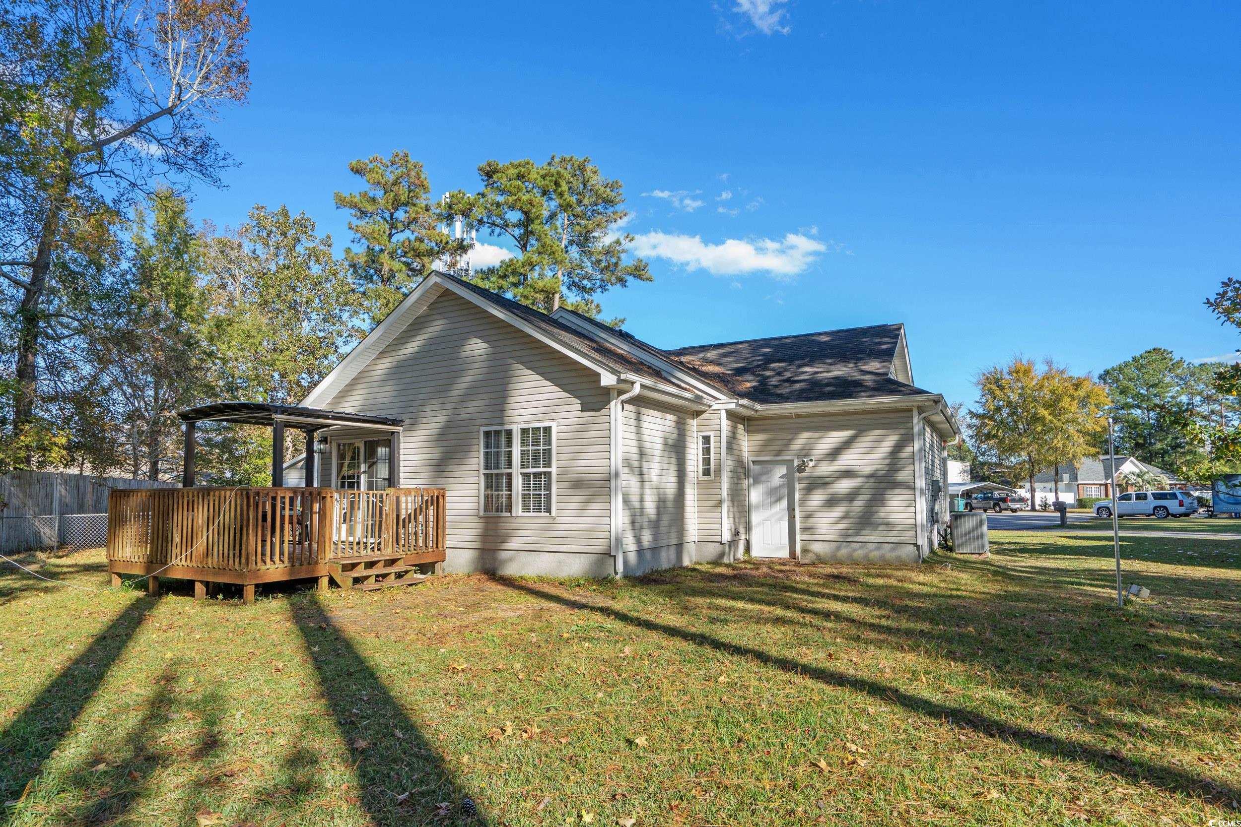 Bring your buyers to see this charming 3-bedroom, 2-bath home located on a cul-de-sac in the desirable Stonebridge subdivision! This lovely property offers a split-bedroom floor plan with ceiling fans in all bedrooms, the dining room, and the living room. The kitchen features tile flooring that continues through the bathrooms, and the living room boasts new wood-look tile flooring, giving the home a fresh, modern touch. Additional updates include a new stove August 2024 and a new HVAC compressor installed July 2025. The spacious, wooded backyard is perfect for entertaining family and friends. An outdoor storage shed conveys with the home, and the attached 11x23 one-car garage offers built-in wood shelving for extra storage. Enjoy the convenience of being close to Market Common, fine dining, shopping, and just minutes from the beach — all with NO HOA fees!