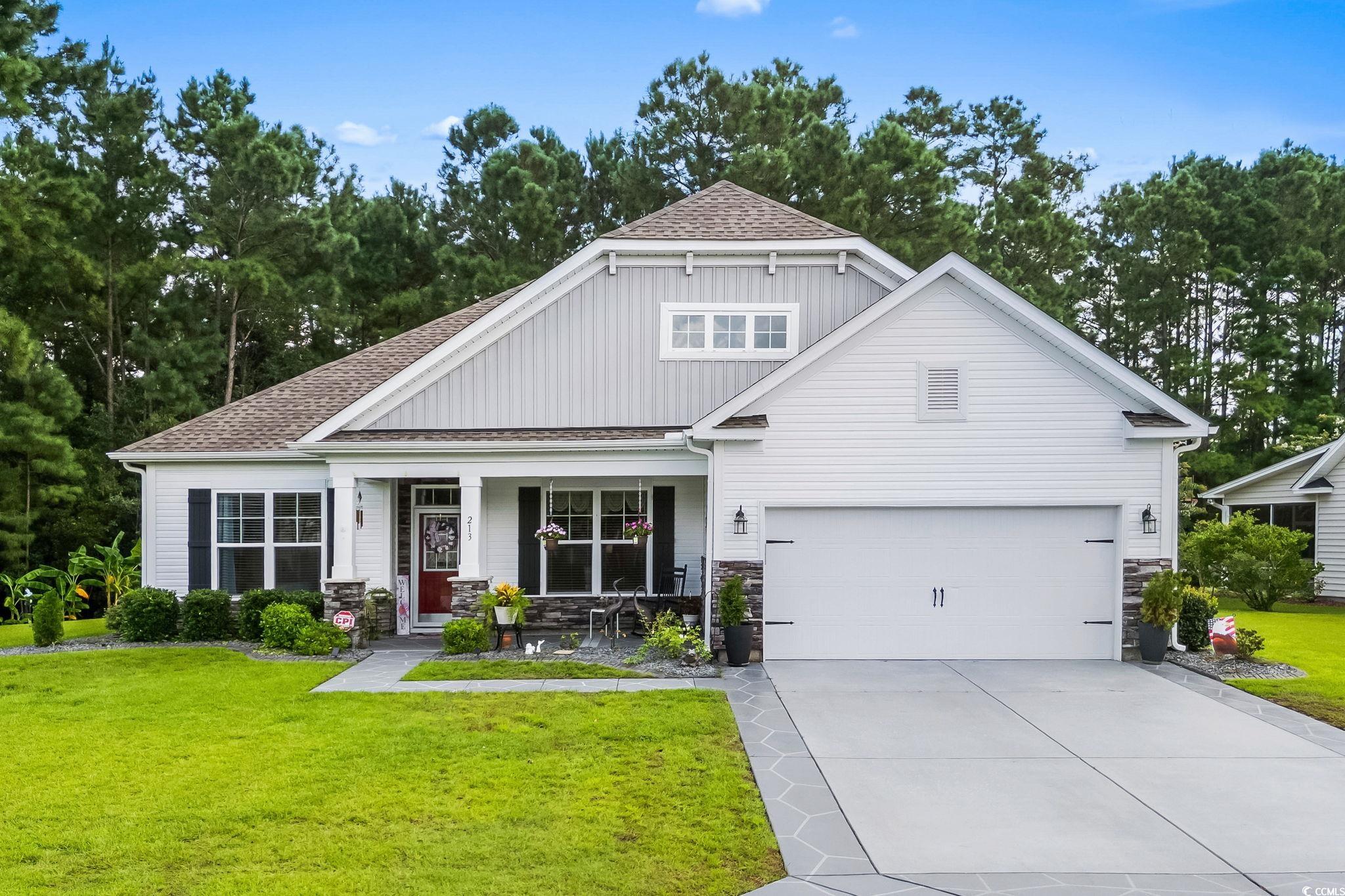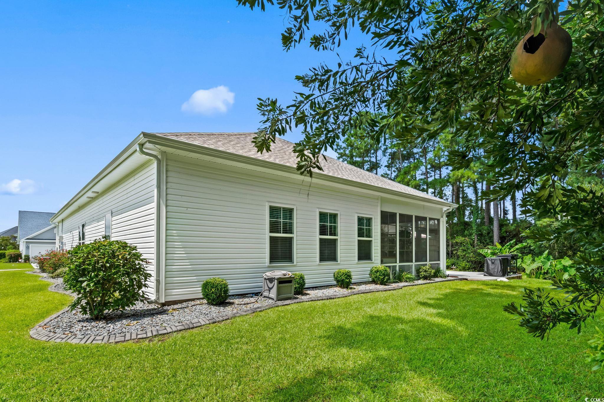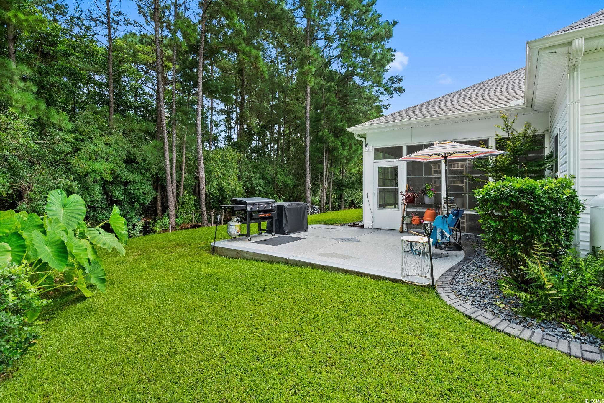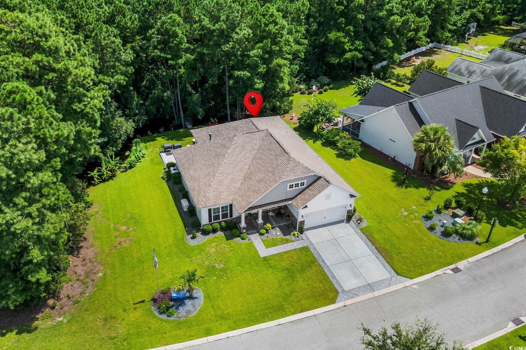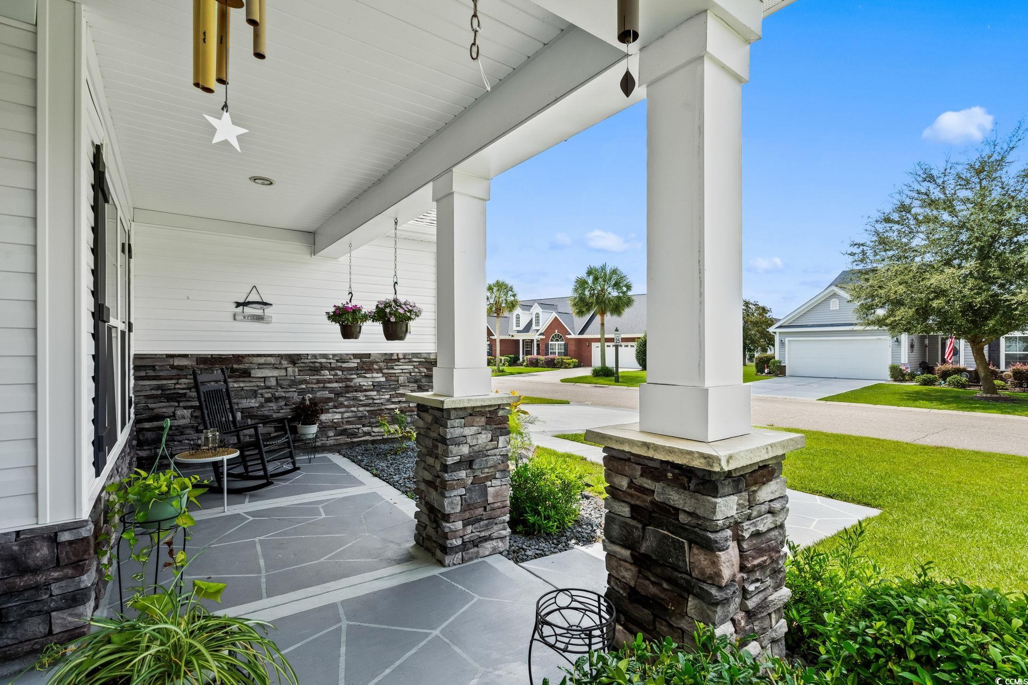 Nestled in the sought-after Hillsborough community, this former builder model home offers a wonderful blend of style, comfort, and convenience. The neighborhood is known for its beautiful mature trees and an ideal location just minutes from International Drive. The home makes a striking first impression with its painted driveway, curbscape details, stacked stone accents, and welcoming front porch. With only one neighbor beside you, the setting feels more private and serene. Inside, the home showcases a fresh, neutral color palette that highlights its thoughtful design. A formal dining room sits at the front of the home and can also serve as a flexible space to fit your needs. The spacious living room features a tray ceiling, gas fireplace, and a built-in beverage station complete with a hand sink and wine storage, making it perfect for entertaining. The expansive kitchen is a chef’s dream with granite countertops, an island, breakfast bar, range, wall oven and microwave, and a pantry that provides excellent storage. The living room flows seamlessly into a large all-season room where you can enjoy the versatility of screened panels in warm weather or close them for comfort during the cooler months. This space opens to a patio that is ideal for grilling and outdoor dining. The backyard backs up to trees, giving you a peaceful, more private view. The primary suite offers a retreat of its own with a tray ceiling and fan and a walk-in closet. The private bathroom has a garden tub and separate shower with tile surround, and dual sinks. Two additional bedrooms are generously sized, each with a ceiling fan and convenient access to the second full bathroom. A full home generator powered by propane gas gives peace of mind. Hillsborough is an established community with a pool, clubhouse, playground, picnic and grilling area, street lights, sidewalks and paths for walking or biking. This home is conveniently located near Highway 90 and International Dr, just a short distance from Highway 501, and Highway 31, providing you with close proximity to all the attractions and amenities of Myrtle Beach, including fine dining, world-class entertainment, ample shopping experiences along the Grand Strand, and Conway’s antique shops, local eateries, and the River Walk. Rest easy knowing you are only a short drive from medical centers, doctors’ offices, pharmacies, banks, post offices, and grocery stores.
