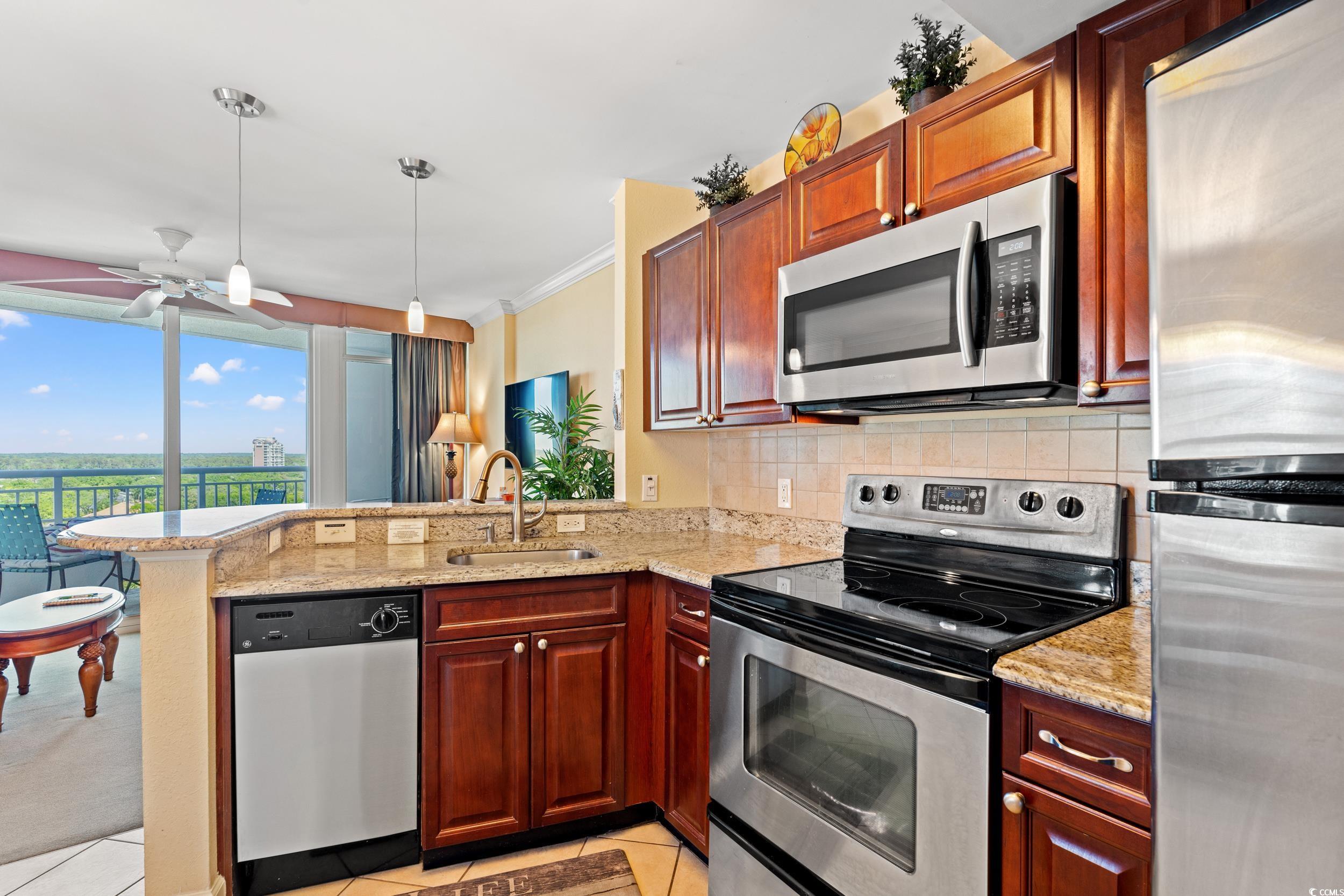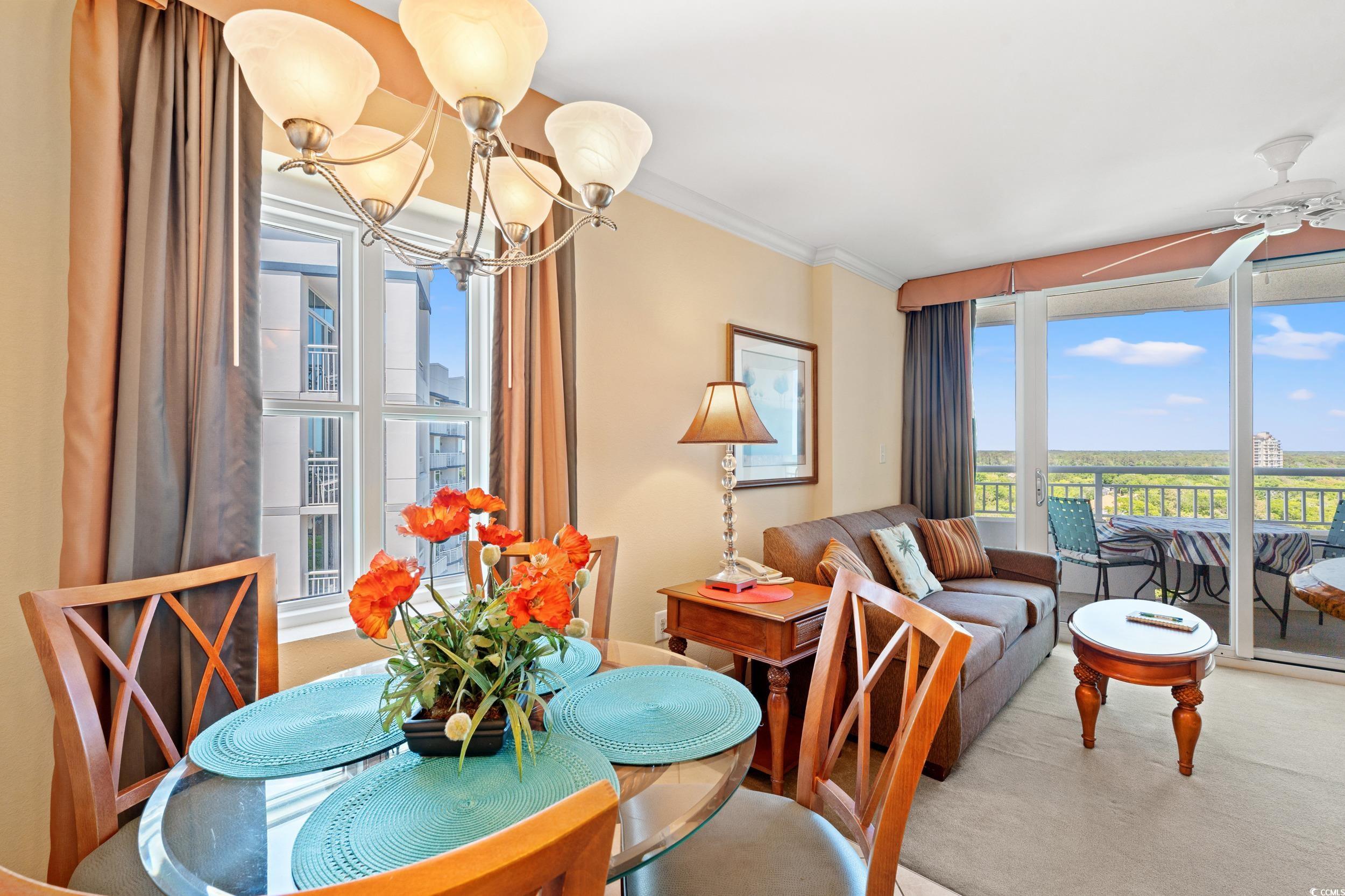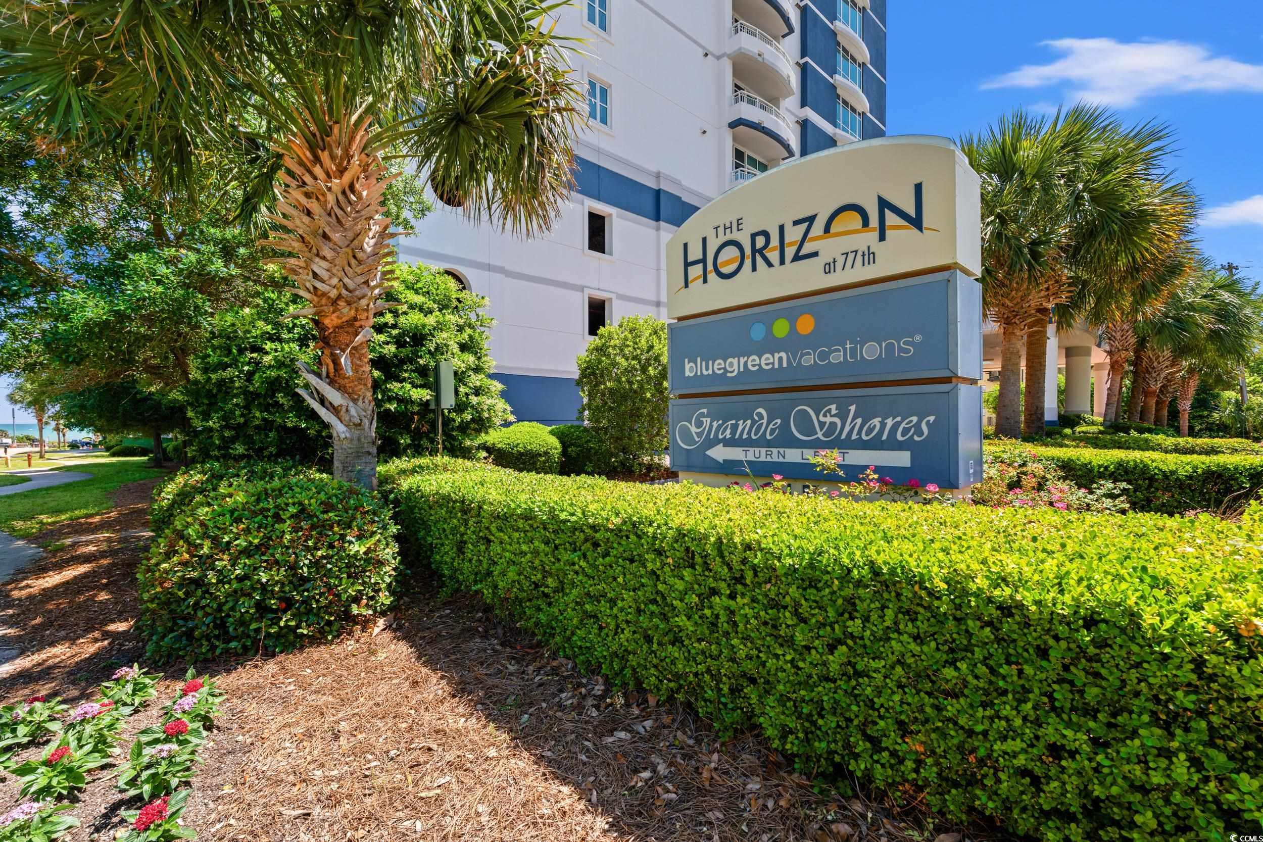 An exceptional end unit condo on the 12th floor of The Horizon at 77th Avenue North presents the perfect beach retreat. Located in a convenient and prestigious area in the north section of Myrtle Beach, this property allows you to enjoy gorgeous panoramic vistas of the Atlantic Ocean over the beautiful oak tree tops from the private balcony. This fully furnished one bedroom condo is bright with natural light and has a full kitchen with granite countertops and bar complete with stainless steel appliances including microwave, range, oven, refrigerator and dishwasher and a separate dining area and living area that leads to the balcony. Included as well are a washer and dryer to add to the convenient lifestyle. The Horizon at 77th boasts desirable amenities, including interior temperature-regulated hallways, a private four level parking garage, an elevated deck lazy river, an elevated deck swimming pool, a fitness center, and a rooftop sun deck. Additionally, residents can enjoy a heated indoor pool and hot tub, all while being just steps away from the ocean. The prime location is near restaurants, shopping, entertainment and golf and makes an exceptional choice for a vacation home or an investment opportunity.