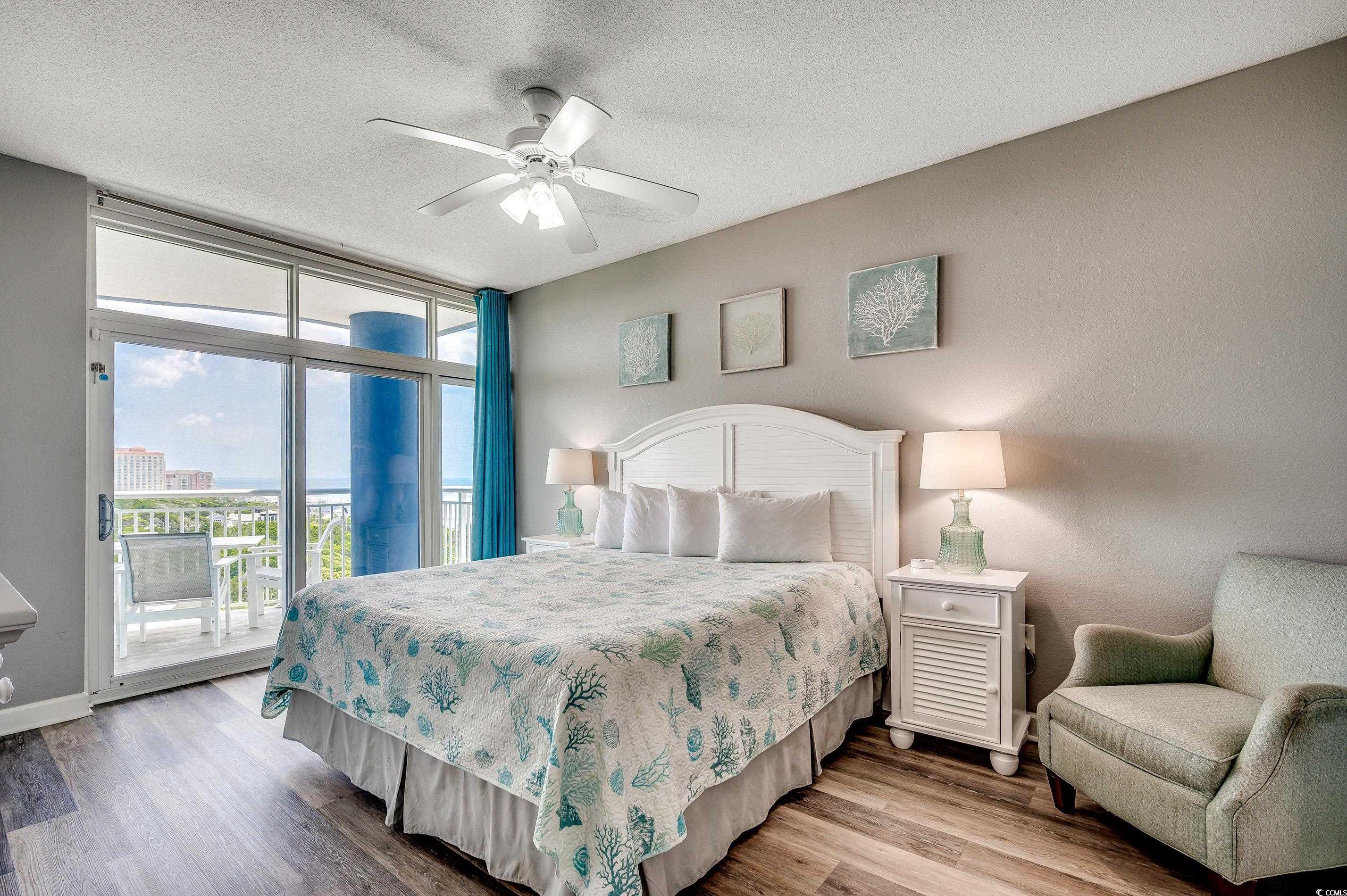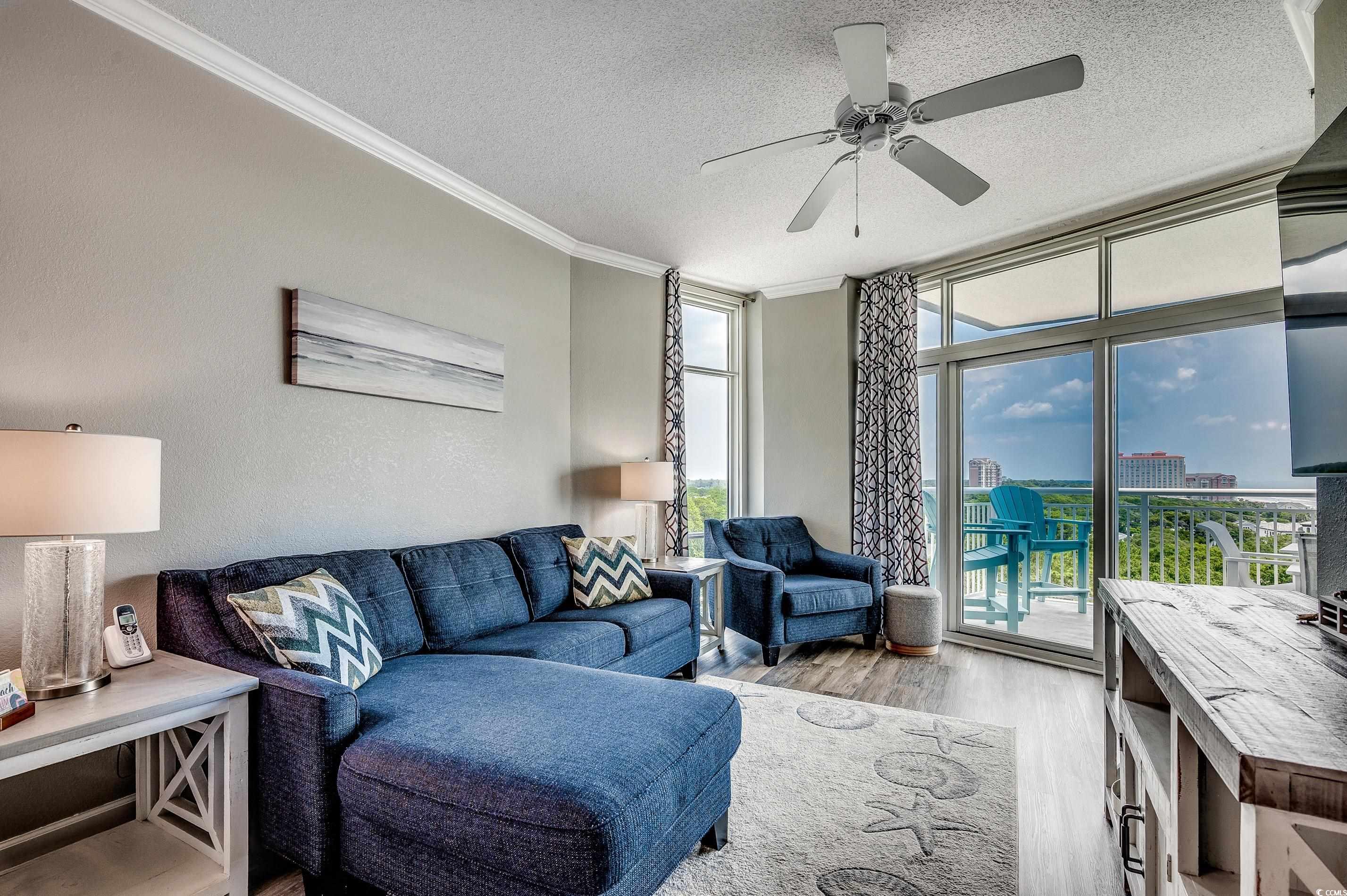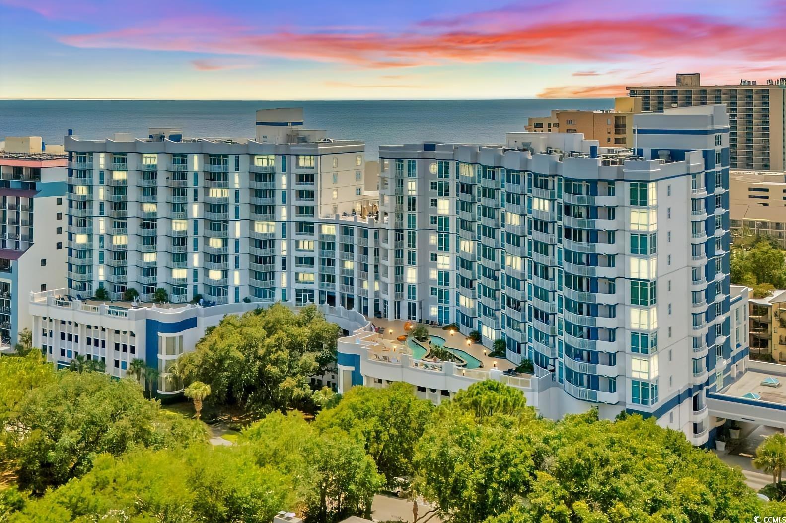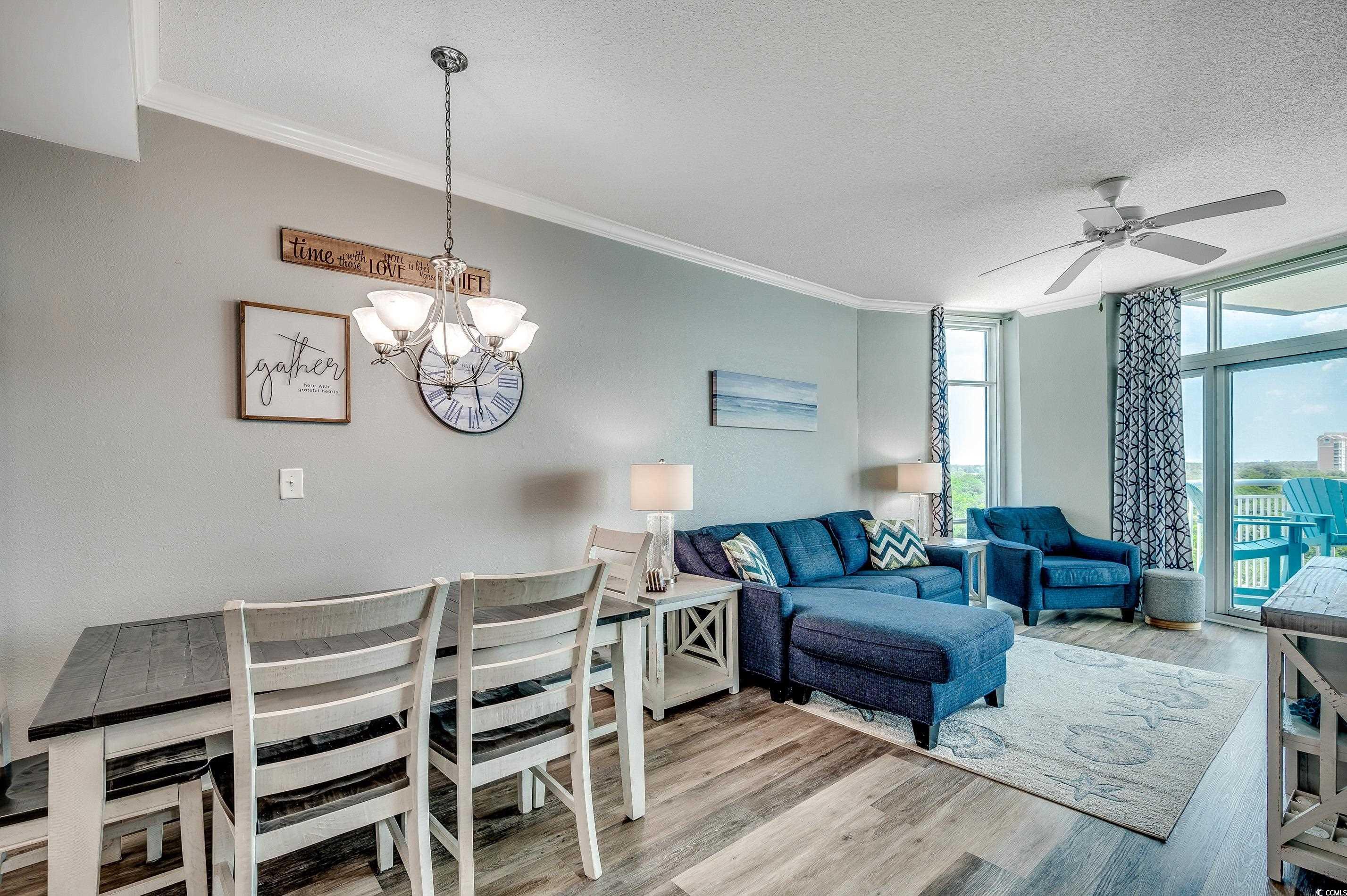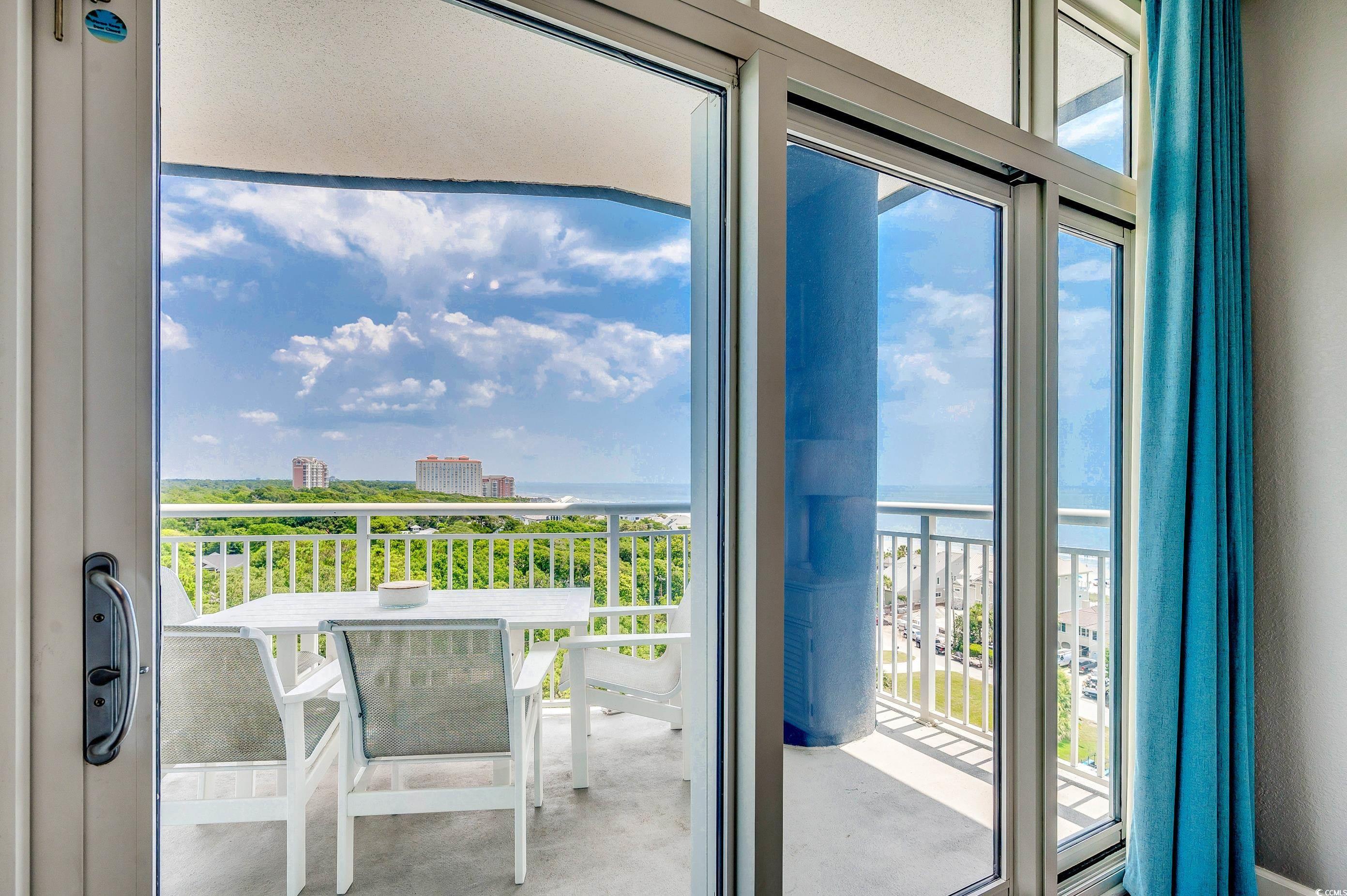 Experience all-inclusive coastal luxury in the Golden Mile area! Discover the perfect blend of style, comfort, and ocean views in this beautifully upgraded, fully furnished 3-bedroom, 2-bath corner end unit at The Horizon on 77th North. Perched on the 5th floor, this condo offers breathtaking views of both the ocean and lush trees from two spacious private balconies—perfect for enjoying morning sunrises, evening stargazing, or simply listening to the soothing waves from your bed. Step inside to a fresh, modern interior featuring upscale LVP flooring, crown molding, and a kitchen with stylish cabinets, quartz countertops, chic backsplash, and a stove with built-in air fryer. Recent appliance upgrades include a microwave (2024), washer/dryer (2024), and refrigerator, stove, and disposal (2021). Smart TVs in every room, bedside charging stations, and tasteful furnishings—including all kitchenware—make this property fully turn-key for a short-term rental investment, second home, or primary residence. The owner suite is a private retreat with its own balcony access, a luxury walk-in shower with stone detail, and serene ocean and tree views. Additional updates include a programmable Smart Ecobee thermostat with auto humidity shutoff, a Digital Lockly keypad entry, and the HVAC was replaced in (2021). This residence also boasts exceptional building features with a recently painted exterior (approx. 2 years ago) and clean, dry interior hallways—no need to walk through the rain. Large, gated parking garage with secure, keycard-access elevator. Overnight security for added peace of mind. Resort-style amenities including indoor/outdoor pools, lazy river, hot tub, fitness center, and rooftop terrace. Motorcycle and golf cart friendly for both owners and guests. HOA fees include: all building exterior/structure insurance, electricity inside the unit, water/sewer, cable, internet, trash pickup (with a convenient garbage chute), and more—covering nearly all of your monthly costs. Owners are also offering a 2-10 Home Warranty for added peace of mind. Location highlights: Short stroll to The Cypress Room—one of the best oceanfront restaurants in the area, Blueberries for a top-notch brunch, Crave for delicious Italian cuisine, PGA Tour golf at Dunes Club and Grande Dunes public course. Close to Barefoot Landing, boutique shopping, and live music. Oceanfront sidewalk with built-in exercise equipment for an active lifestyle. Beautifully upgraded, fully furnished, and ideally located, this ocean-view oasis is ready for you to move in or start generating rental income immediately. Schedule your private showing today and explore the virtual tour! Square footage is approximate and not guaranteed. Buyers responsible for verification.