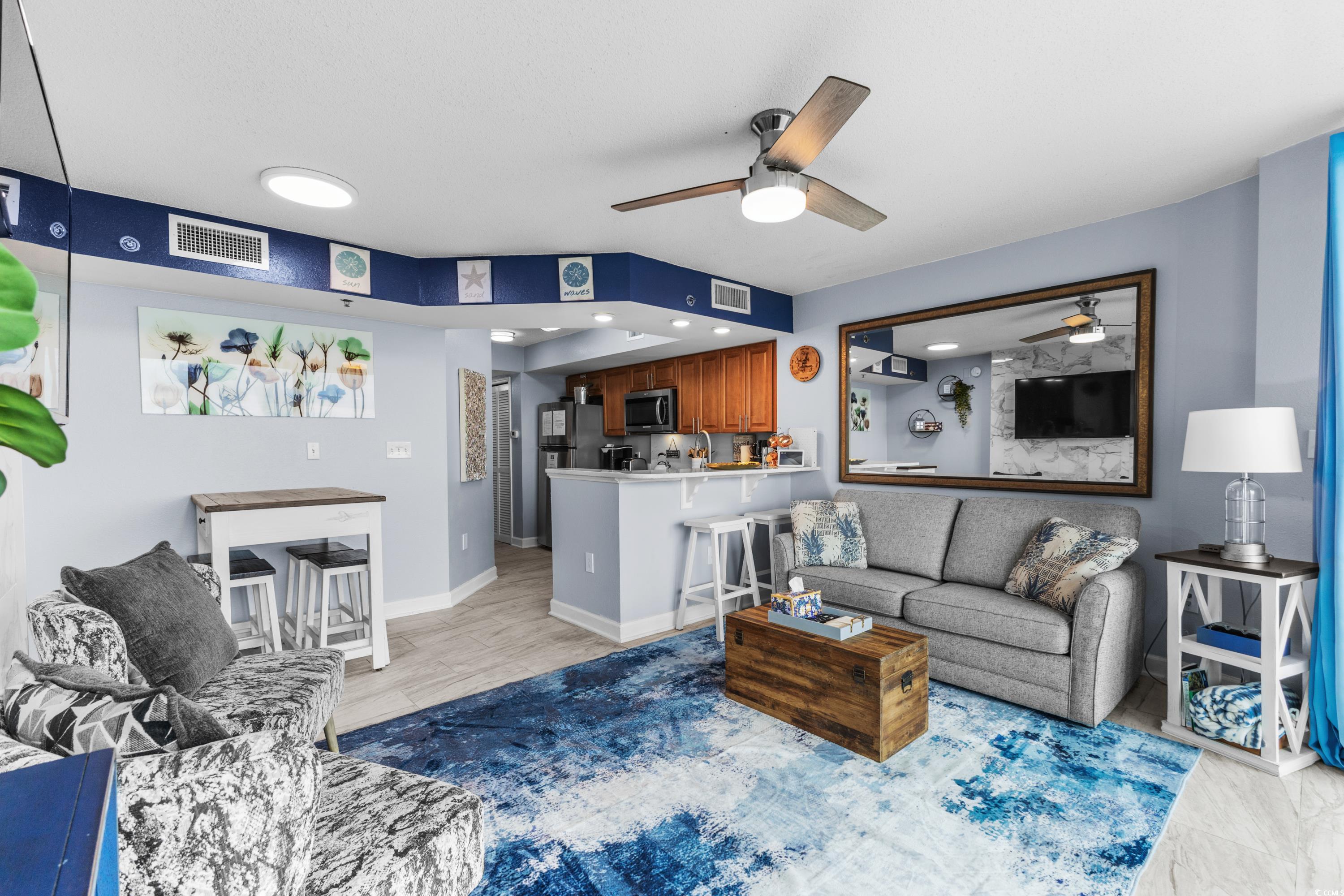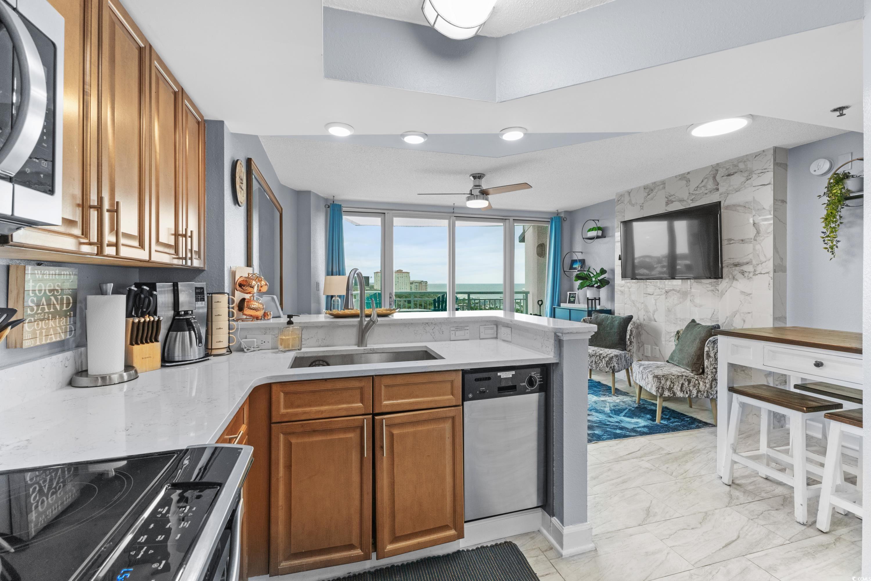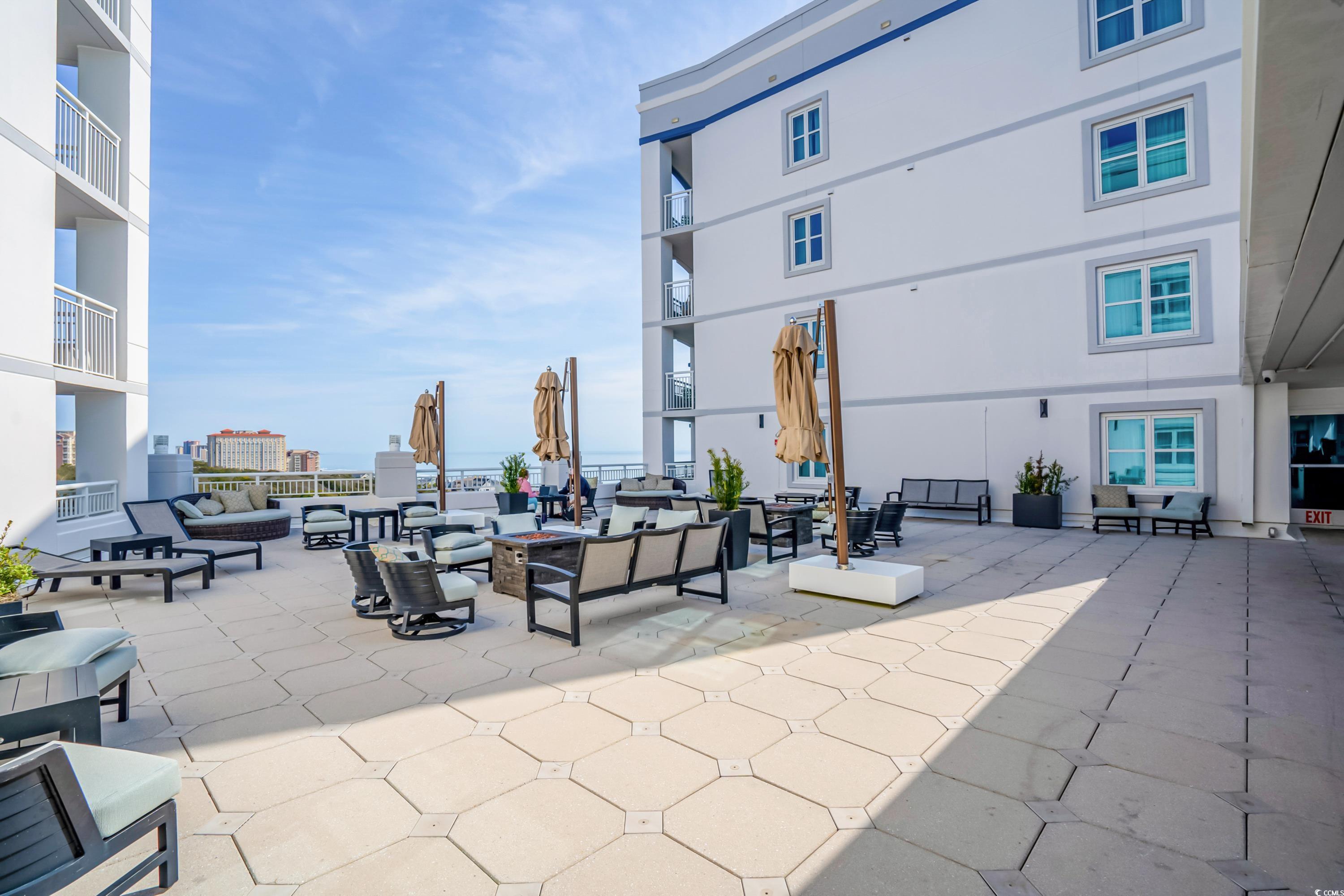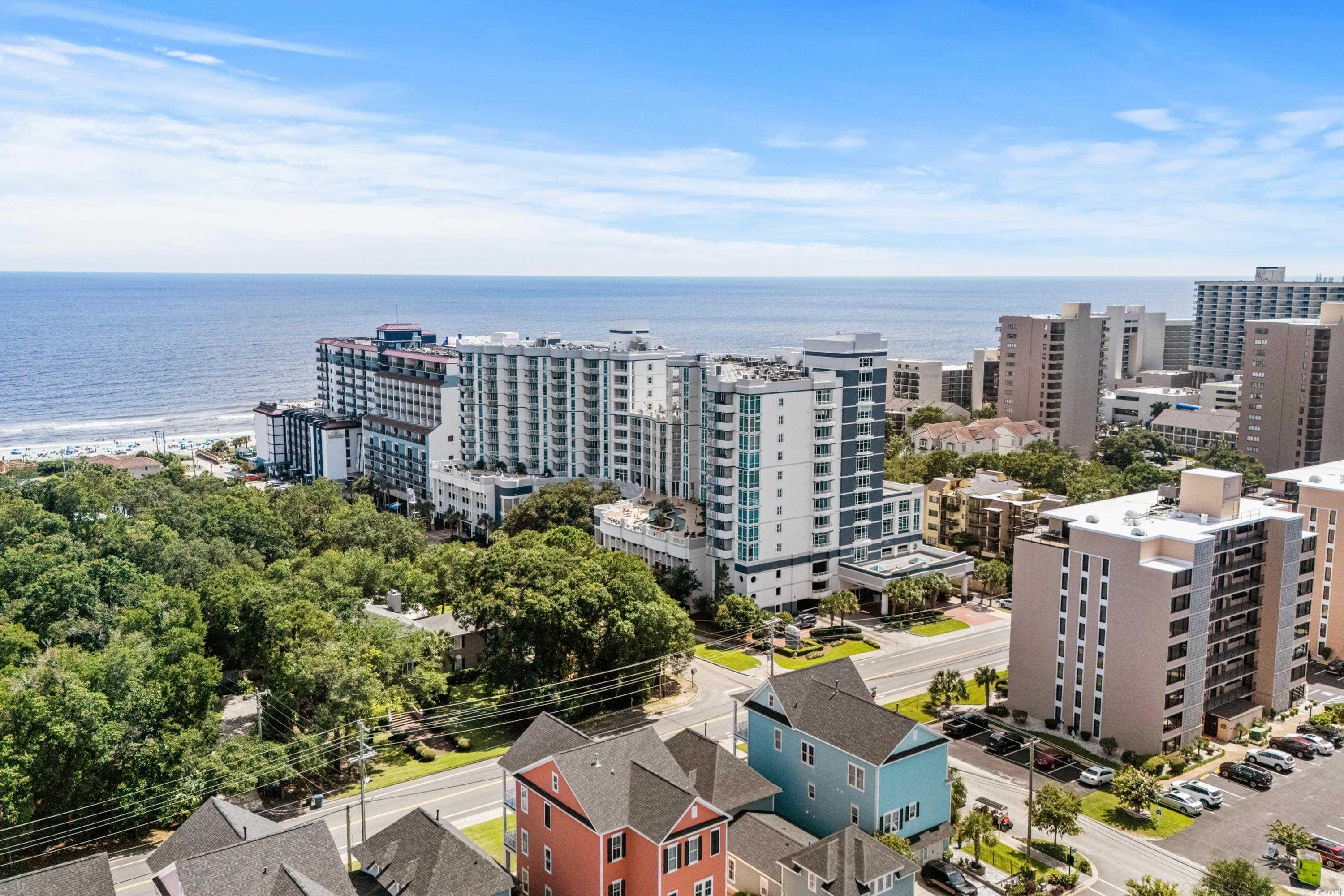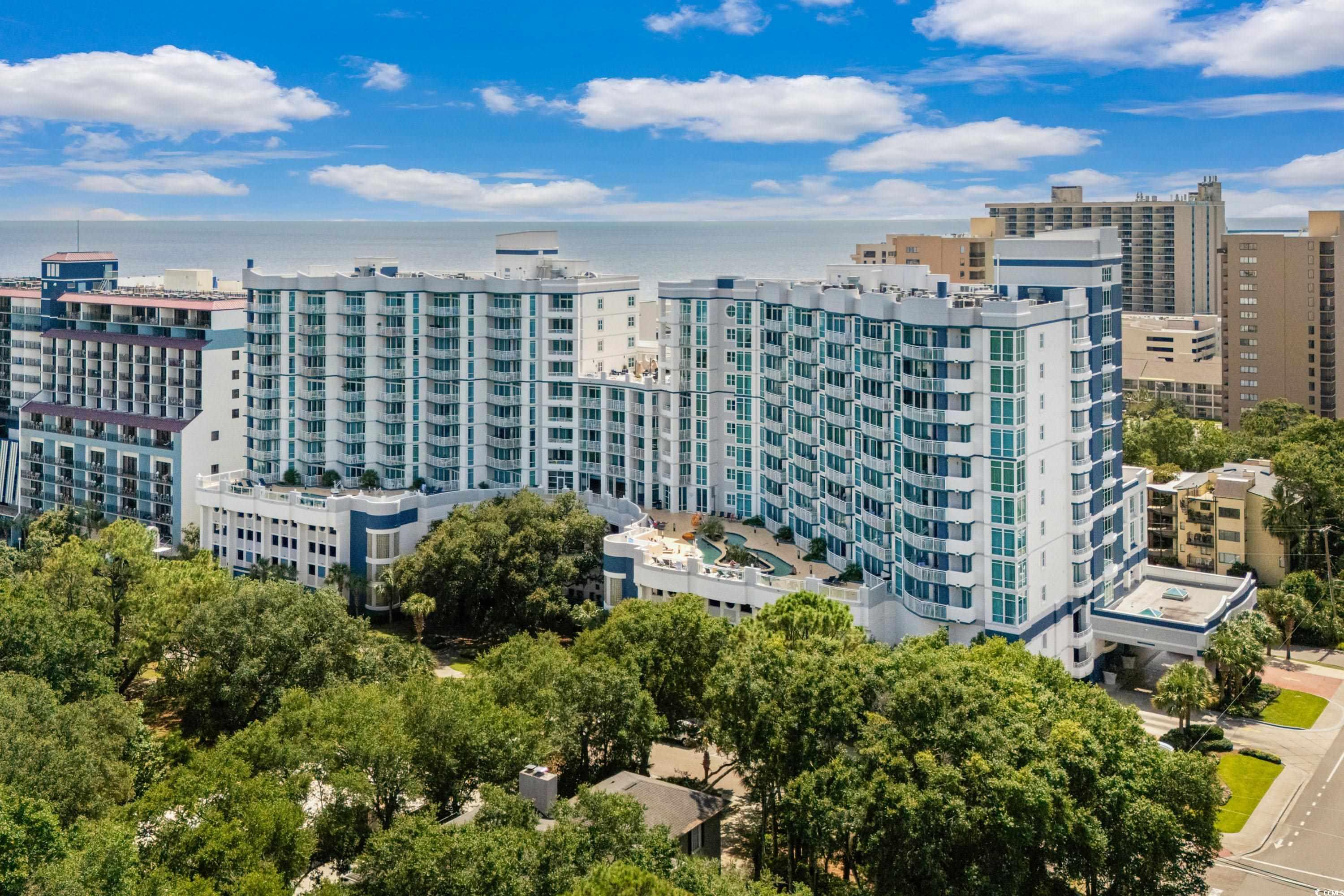 Stunning unit with unparalleled vistas! Nestled on the corner of the 6th floor at Horizon on 77th, this 2-bedroom, 2-bath residence offers both elegance and functionality. A thoughtfully designed living space opens to a balcony showcasing sweeping views of the Atlantic Ocean and the Forest Dunes section of Myrtle Beach, creating the perfect setting to enjoy sunrises, ocean breezes, and coastal living at its finest. Modern finishes throughout include tile flooring, sleek quartz countertops, stainless steel appliances, and a stylish accent wall. This condo is being offered fully furnished and turn-key ready. For added peace of mind, a brand-new HVAC system was installed in 2025. The Horizon at 77th was designed with convenience in mind, featuring climate-controlled walkways connecting to a four-level parking garage, gated entry, and security elevators. Residents and guests enjoy an array of resort-style amenities, including indoor and outdoor elevated pools, hot tub, a lazy river, a rooftop sundeck with fire pits, and fully equipped fitness center. Ownership is made easy with all-inclusive HOA fees that cover exterior insurance, electricity in the unit and water. This is an ideal option for a primary residence, a vacation retreat, or an investment property. Tucked away in a serene area of the Grand Strand, yet only moments from shopping, dining, golf, and entertainment. Experience the exceptional lifestyle offered at the Horizon on 77th—schedule your private showing today and step into your new coastal escape.