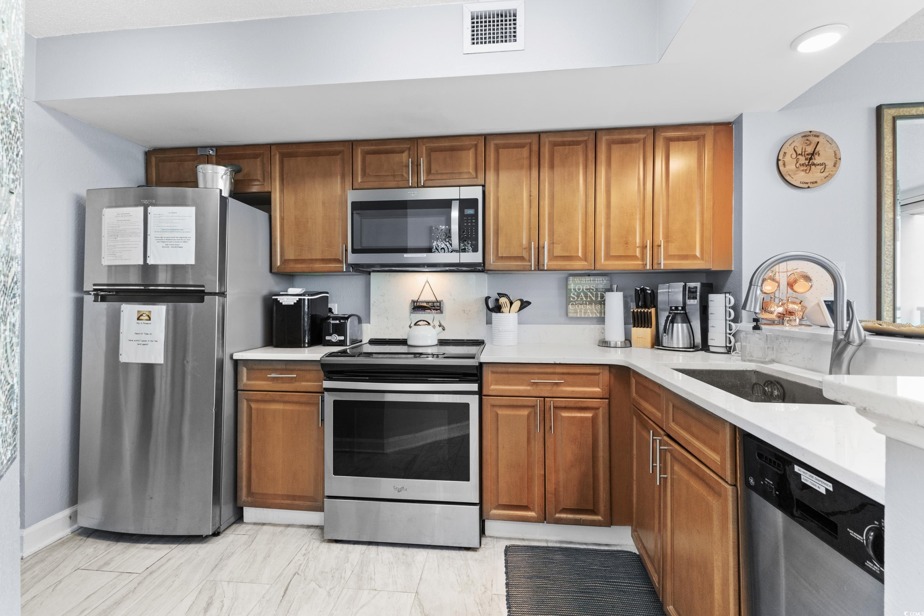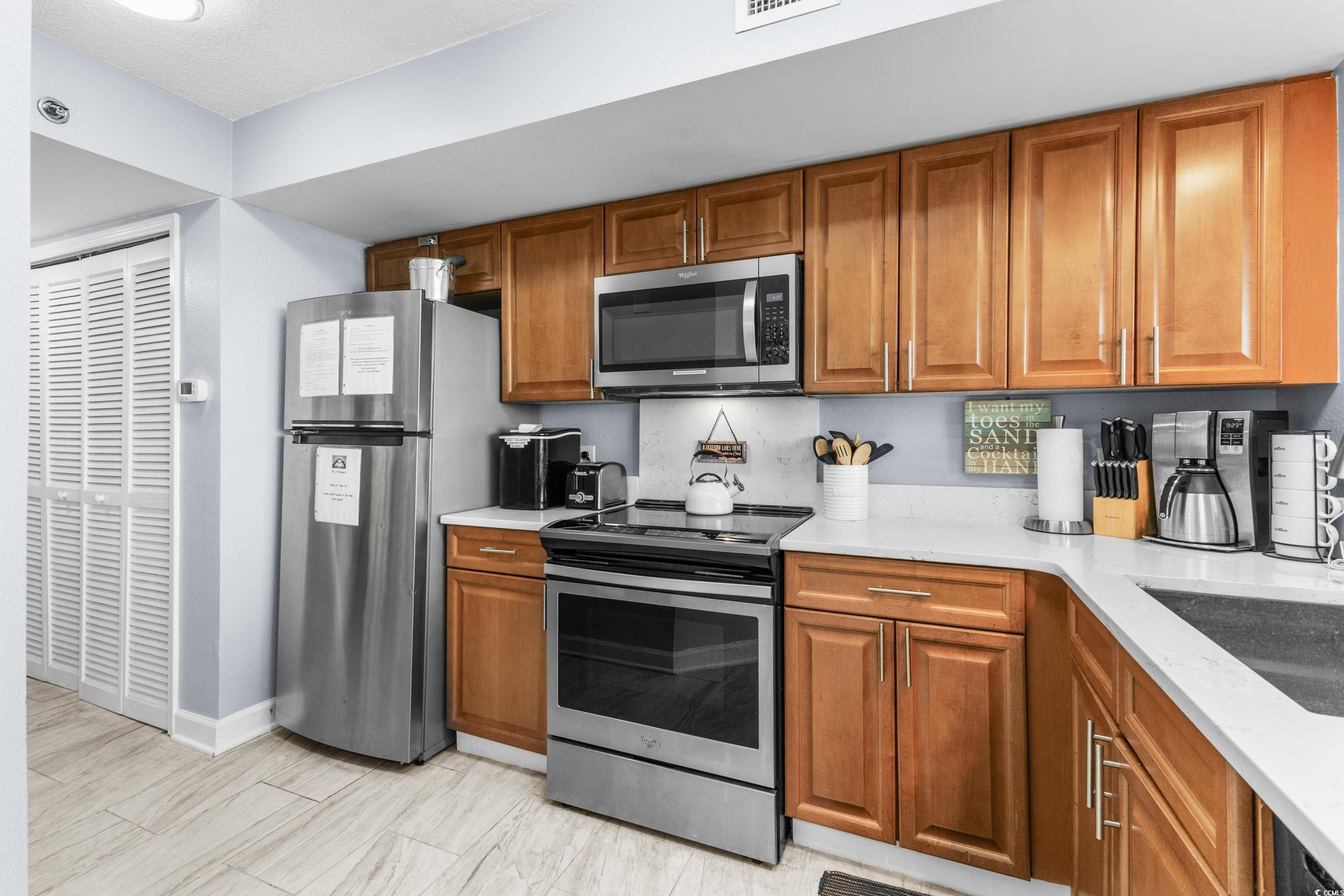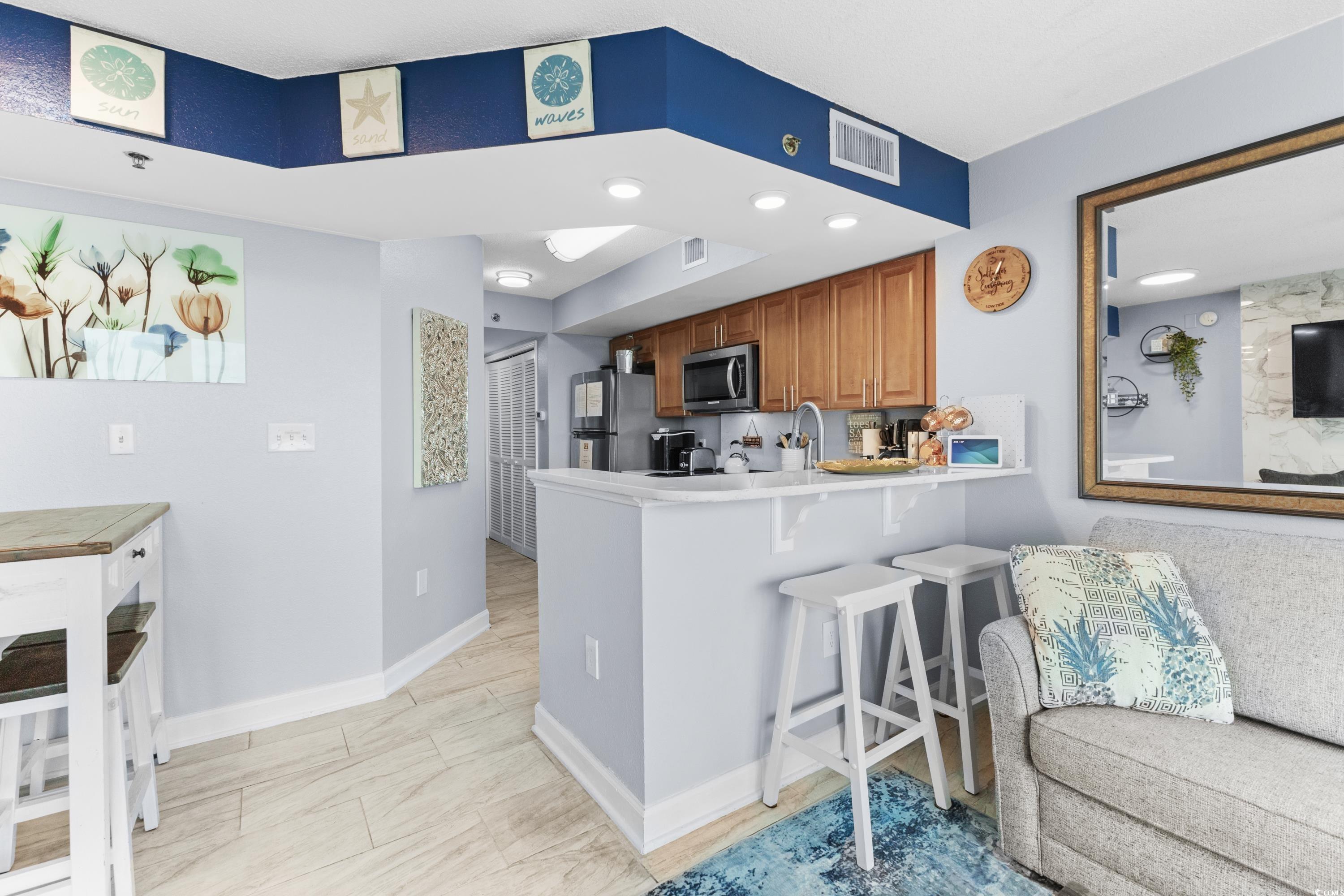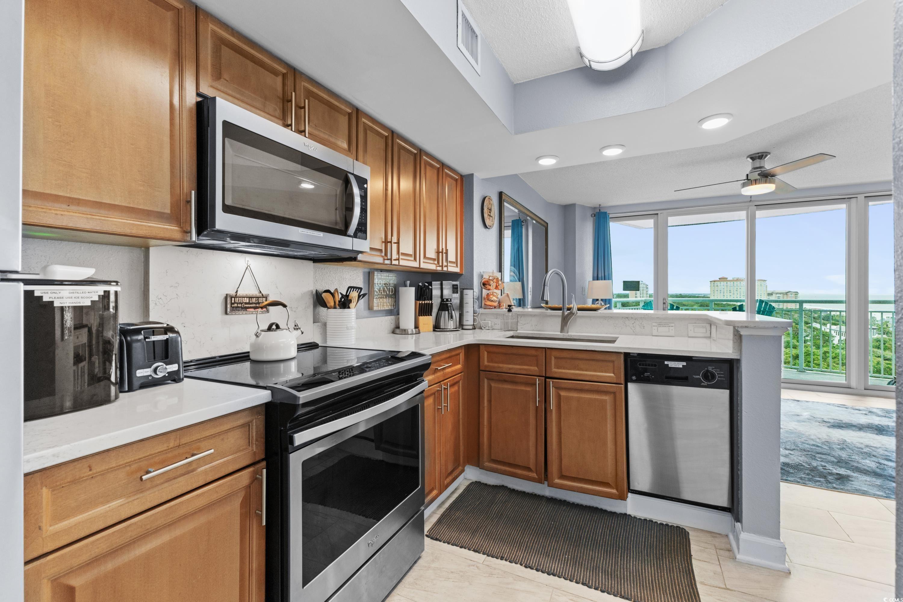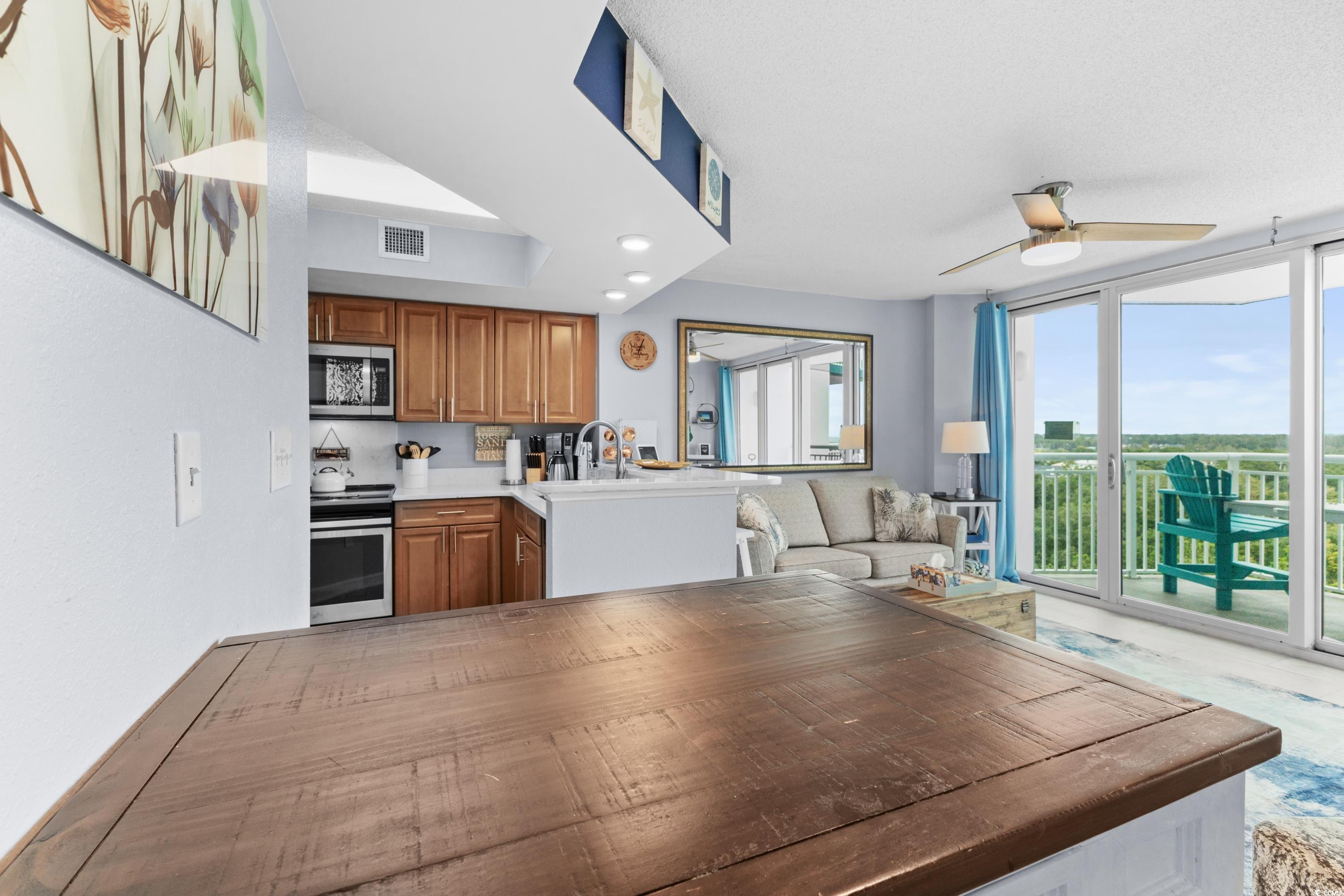 Stunning unit with unparalleled vistas! Nestled on the corner of the 6th floor at Horizon on 77th, this 2-bedroom, 2-bath residence offers both elegance and functionality. A thoughtfully designed living space opens to a balcony showcasing sweeping views of the Atlantic Ocean and the Forest Dunes section of Myrtle Beach, creating the perfect setting to enjoy sunrises, ocean breezes, and coastal living at its finest. Modern finishes throughout include tile flooring, sleek quartz countertops, stainless steel appliances, and a stylish accent wall. This condo is being offered fully furnished and turn-key ready. For added peace of mind, a brand-new HVAC system was installed in 2025. The Horizon at 77th was designed with convenience in mind, featuring climate-controlled walkways connecting to a four-level parking garage, gated entry, and security elevators. Residents and guests enjoy an array of resort-style amenities, including indoor and outdoor elevated pools, hot tub, a lazy river, a rooftop sundeck with fire pits, and fully equipped fitness center. Ownership is made easy with all-inclusive HOA fees that cover exterior insurance, electricity in the unit and water. This is an ideal option for a primary residence, a vacation retreat, or an investment property. Tucked away in a serene area of the Grand Strand, yet only moments from shopping, dining, golf, and entertainment. Experience the exceptional lifestyle offered at the Horizon on 77th—schedule your private showing today and step into your new coastal escape.