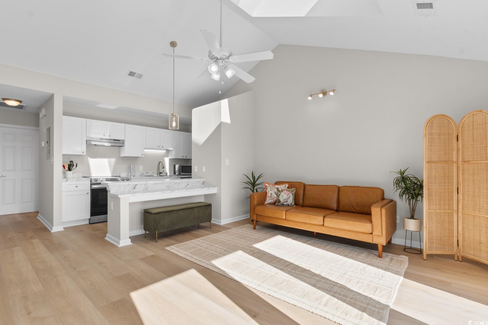 Welcome to a space that instantly feels warm, bright, and easy to live in. This top-floor efficiency condo in Plantation Golf Villas offers a rare sense of privacy---tucked just off Business 17 in Surfside Beach, but still close to everything that makes this area so loved. The condo was completely renovated in 2022, giving it a clean, modern feel from the moment you step inside. New electrical, updated plumbing fixtures, fresh flooring, appliances, cabinets, and more all come together to create a space that feels thoughtfully updated and move-in ready. Cathedral ceilings open up the entire living area, and the skylight floods the space with natural light throughout the day. The kitchen features stainless steel appliances and a pendant light above the breakfast bar---perfect for quick meals or slow mornings. Sit outside on your balcony overlooking a peaceful pond, it's the kind of spot where morning coffee feels like a small daily escape. Plantation Golf Villas puts you minutes from Surfside Beach, the Pier, Myrtle Beach attractions like the SkyWheel and Boardwalk, and all the restaurants, shops, and entertainment around Market Common. It's peaceful when you want quiet, and close to everything when you want to get out and explore. If you're looking for a fully updated coastal retreat that feels like your own private hideaway, this condo might be the perfect fit!