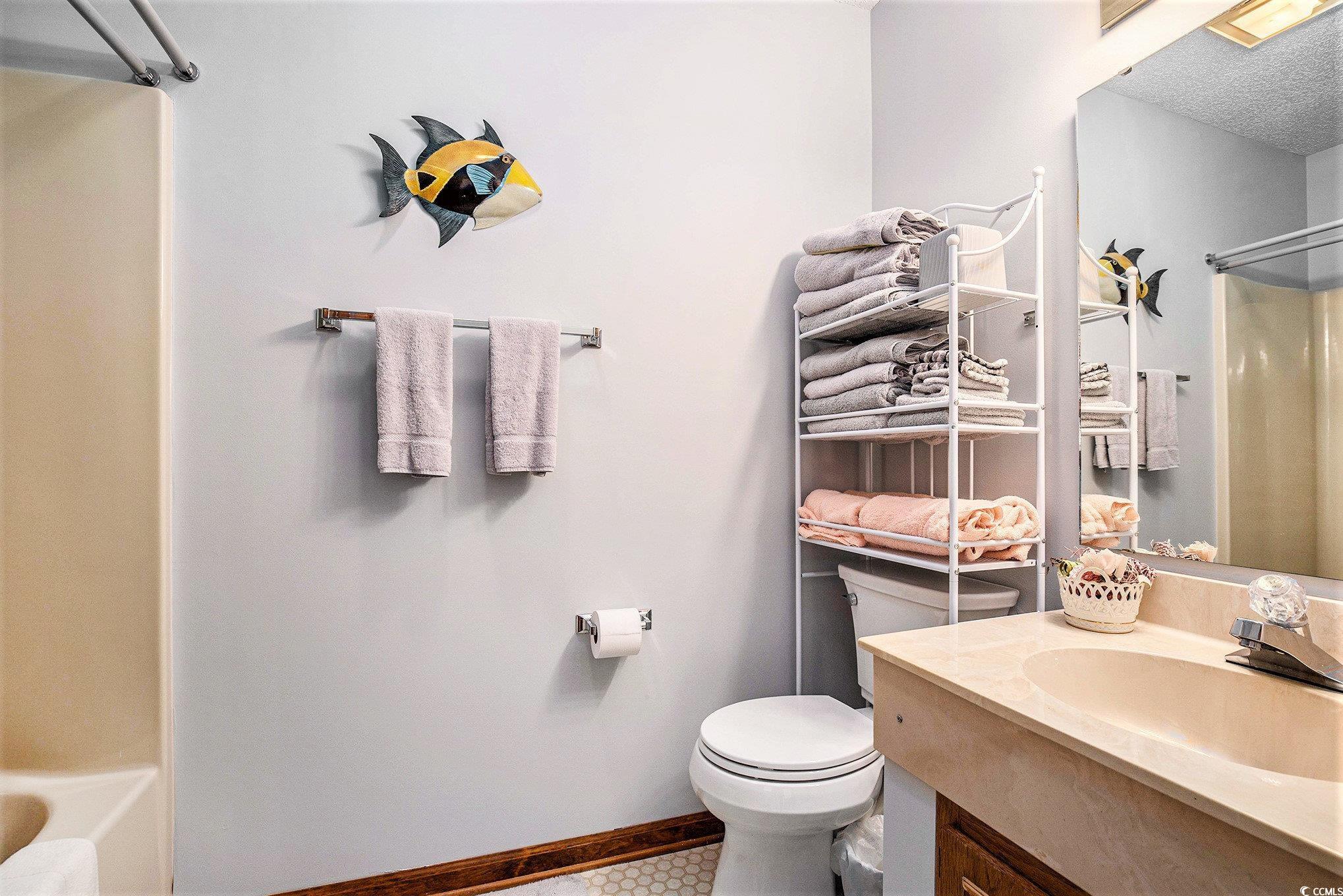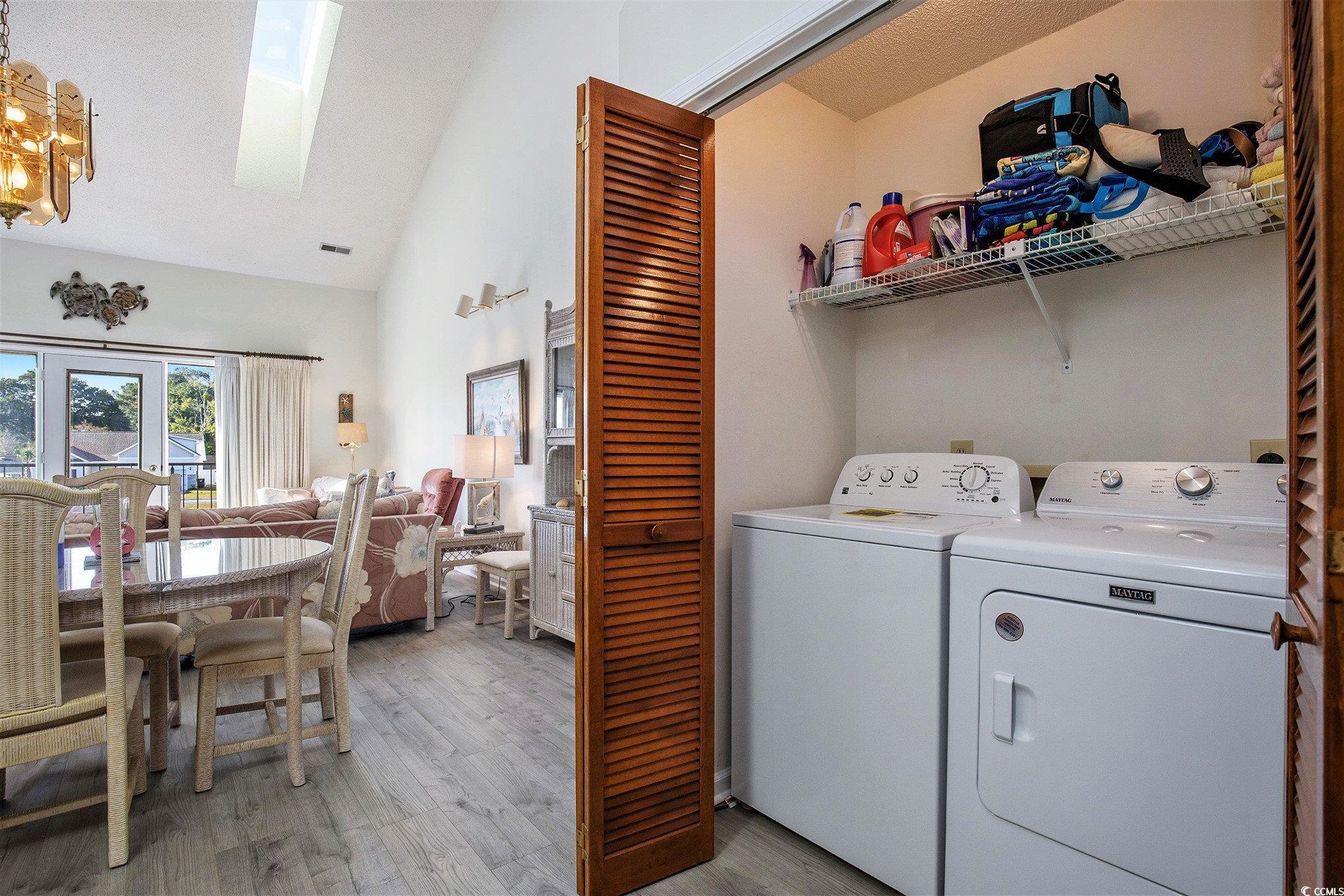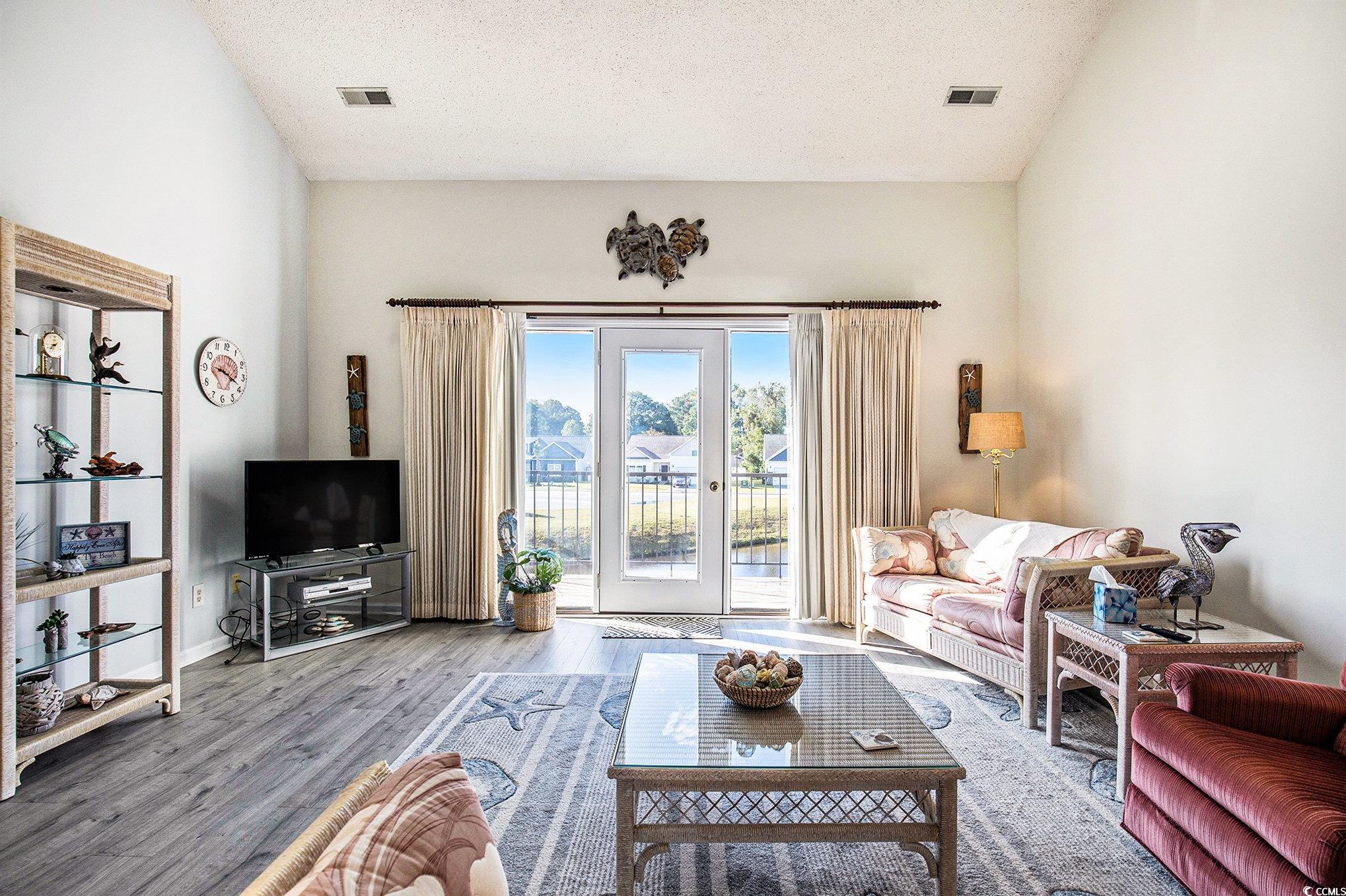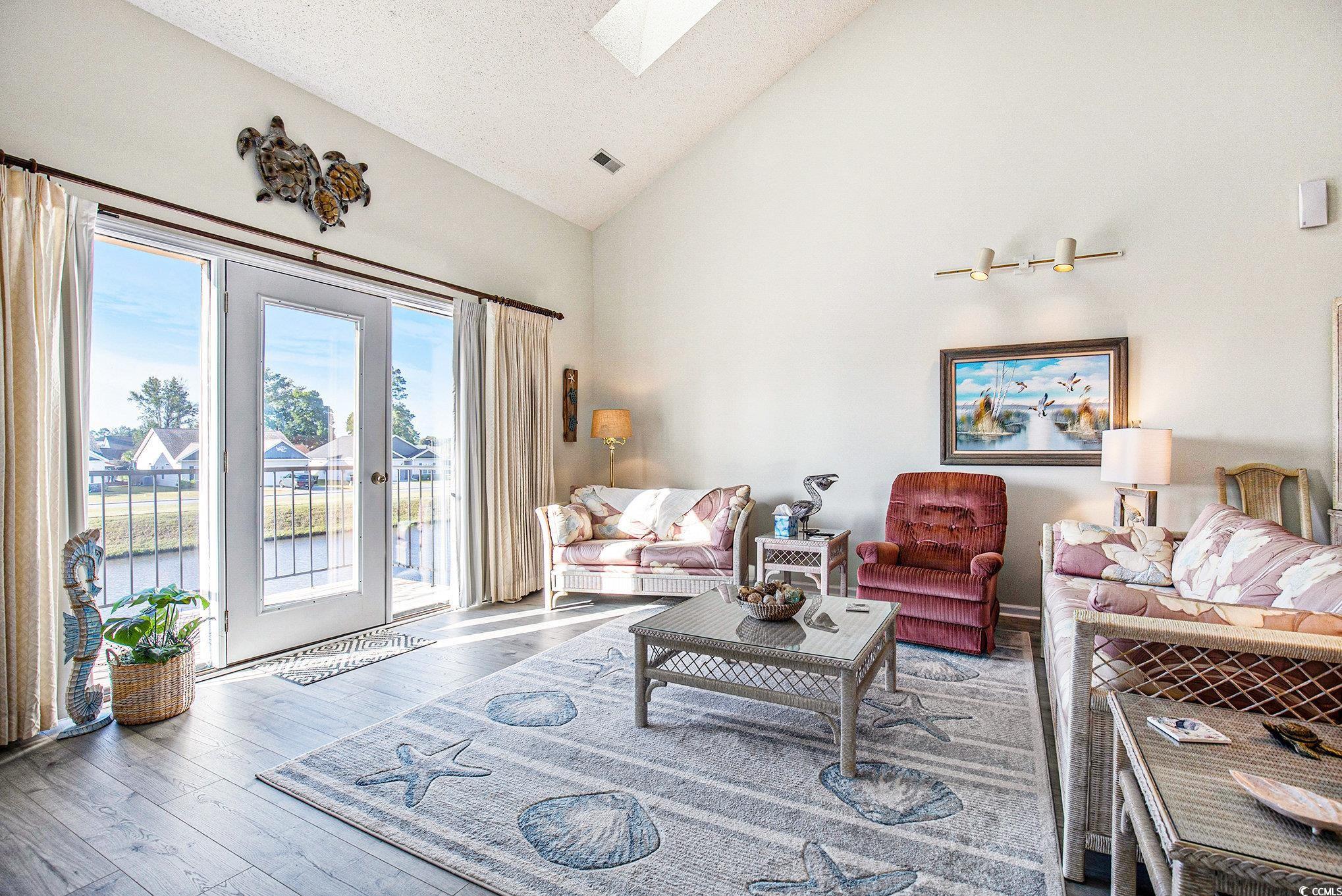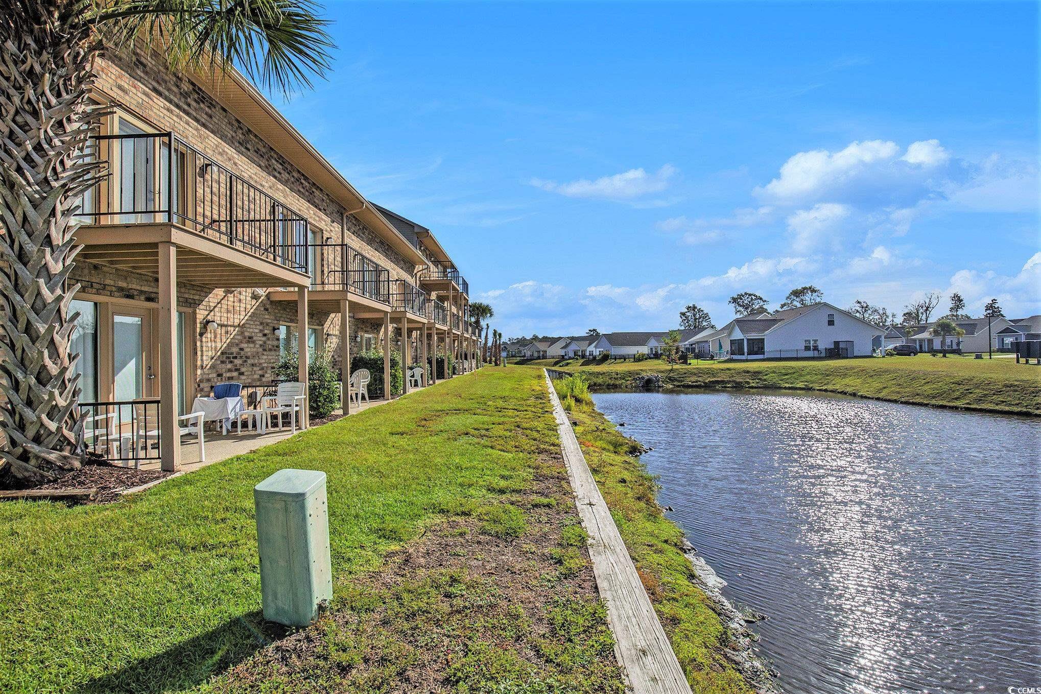 Welcome to this two-story condo offering comfort, convenience, and coastal living just minutes from the beach. Step inside the first-level entry to find a spacious bedroom on the left complete with a ceiling fan, located next to a full bathroom featuring a tub/shower combo and vanity. The kitchen includes a breakfast bar and opens seamlessly into the dining and living areas, where vaulted ceilings with skylights create an airy, light-filled space. From the living room, step out onto your private balcony and take in pond views. Upstairs, you'll find a generously sized second bedroom and another full bathroom with a tub/shower combo and vanity, offering ideal space for guests or family. Additional highlights include an attached storage room and recent updates with the water heater and HVAC replaced in 2019. This condo is being sold furnished (excluding certain personal items) and is perfect as a primary residence, vacation getaway, or investment property with short-term rental potential. Owners also have the option to access Grand Palms Resort amenities (including pools, spa, fitness center, and shuttle service to Surfside Beach) for an additional monthly fee. Schedule your showing today!!!