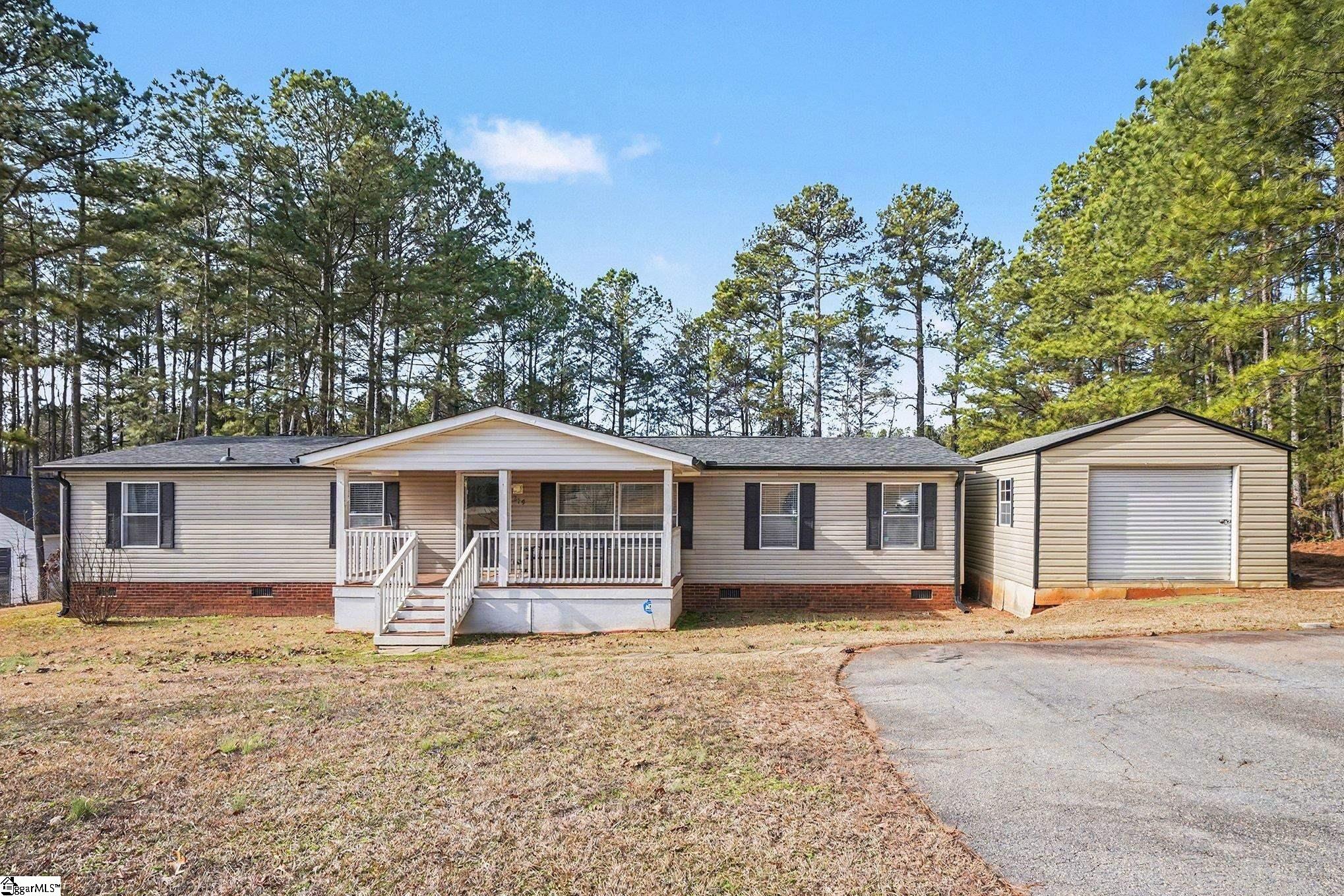 215 Wrentree Drive delivers space, updates, and a peaceful setting in a prime Easley location. With over 1,600 square feet, this well-maintained home features 3 bedrooms and 2 bathrooms and is zoned for Wren Schools, just 2 minutes from Hunt Meadows Elementary. The 0.64-acre lot is framed by mature trees on three sides, offering a natural backdrop. A concrete driveway leads to a covered front porch and into a spacious interior with a large living room and an impressive 21×12 family room anchored by a central fireplace flanked by windows. The open layout flows seamlessly into the dining area and kitchen. The kitchen is generously sized with a center island and seating, granite countertops, sleek black stainless stove, microwave, and dishwasher, and a refrigerator that conveys. White cabinetry, mosaic tile backsplash, and dark laminate flooring create a modern, cohesive look. A closet pantry and walk-in laundry room with built-in storage add everyday convenience. The primary suite is 16x13 and filled with natural light, featuring a bathroom with a step-in shower and a separate soaking tub. Two additional bedrooms are located on the opposite side of the home and share a full bathroom. Out back, the deck overlooks a level, wooded backyard, perfect for relaxing or entertaining. Additional highlights include underground utilities and a large storage shed with rolling door. A 2023 roof adds peace of mind. Tucked on a quiet, well-kept street just off Three and Twenty Road, this home combines comfort, functionality, and location in one standout property. Detitled with a permanent foundation!