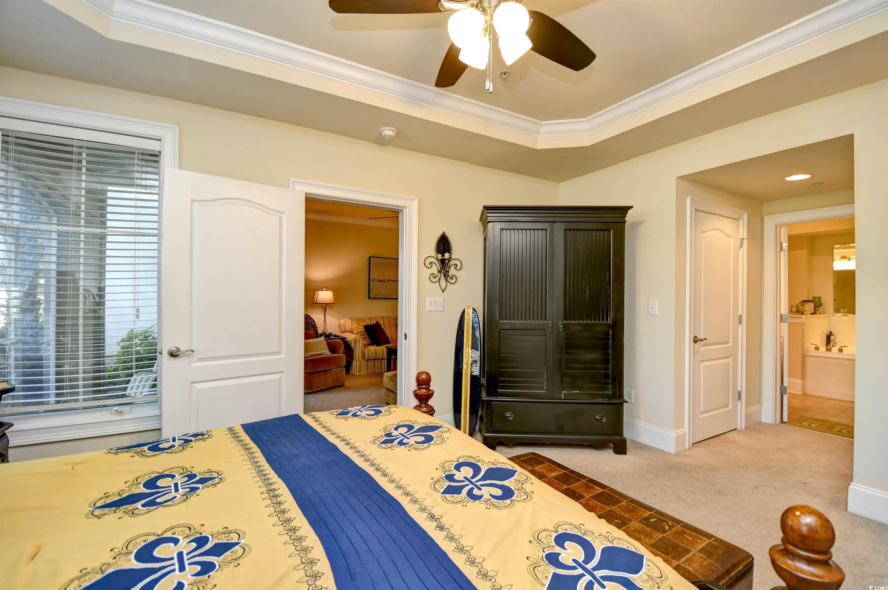 Don't miss the opportunity to own this two bedroom, two bathroom condo in the gated community of Edgewater at Barefoot Resort and Golf of North Myrtle Beach with TRANSFERABLE GOLF MEMBERSHIP! This property has never been rented and currently owned by a second owner who continues to care very well for it, just like the original owner did. This unit has an open and very spacious floor plan, allowing for easy living and entertaining. The screened porch offers a great outdoor living space. The kitchen is equipped with stainless steel appliances, ample counter space for meal prep, and plenty of cabinets for storage. A separate laundry room is conveniently located at the end of the kitchen. The master bedroom is a great size and features two walk-in closets, and private master bath with two sink vanities, a jetted bathtub, and a separate walk-in shower. Guest bedroom also includes a walk-in closet and easy access to the bathroom. Each owner has access to the enclosed parking garage, with assigned parking for a vehicle. In the parking garage you will also find a pull-down storage area that is perfect for all of your beach essentials. Edgewater's amenities include a large pool and a hot tub, clubhouse, fitness room, and walking paths along the Intracoastal Waterway. HOA dues are well-managed and cover essential amenities, including basic cable, internet, water, sewer, trash, pest control, building insurance, and landscaping. Additionally, residents enjoy exclusive access to the newly rebuilt Barefoot Beach Cabana with gated parking, a 15,000 sq. ft. community pool along the Intracoastal Waterway, and a seasonal beach shuttle. Situated just minutes from the beach and a short drive from Barefoot Landing, with its vibrant array of restaurants, shops, entertainment, and a marina on the Intracoastal Waterway, Barefoot Resort offers an unparalleled lifestyle. The resort also features four championship golf courses, two clubhouses with restaurants, bars, and pro shops, a driving range, and a sports bar. Whether you're seeking a primary residence, a second home, or an investment property, this beautiful condo is a must-see!