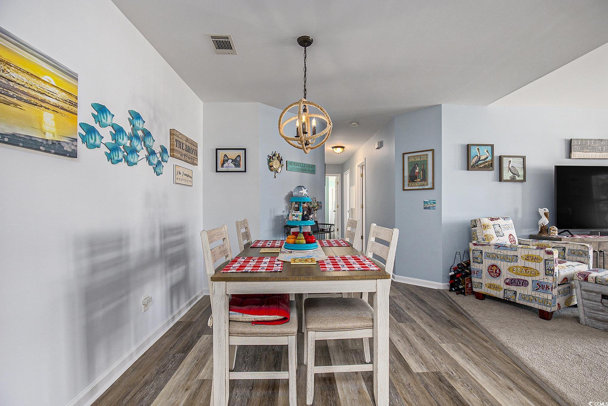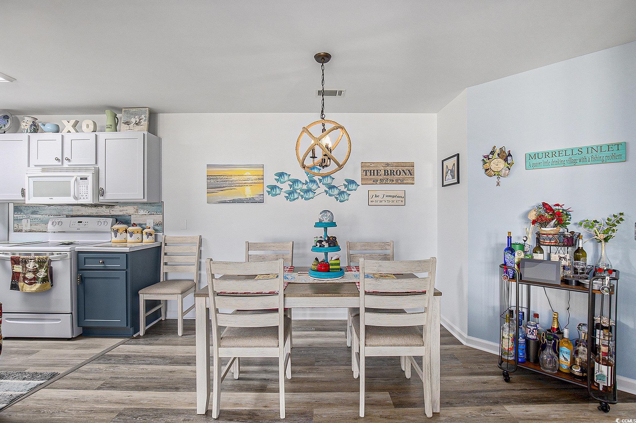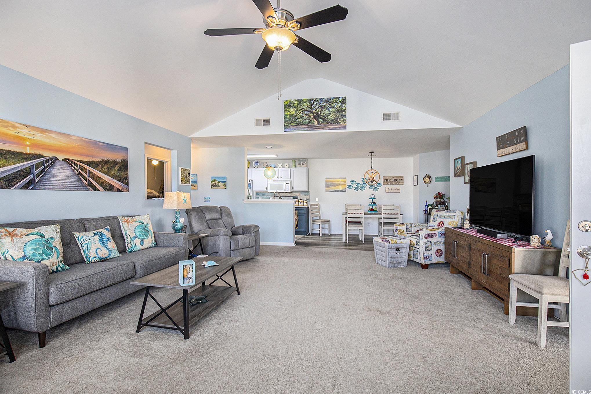 Welcome to this beautifully updated 3-bedroom, 2-bathroom home in the desirable Sterling Pointe community of Murrells Inlet. Step into a spacious, light-filled living room featuring vaulted ceilings, a ceiling fan, and a stunning pond view. The dining area and kitchen have durable LVP flooring, with the kitchen offering a breakfast bar. The primary suite, located at the back of the home for added privacy, includes two large closets, a linen closet, and a ceiling fan. The primary bathroom offers dual sinks, a large vanity, a tub, shower, and tile flooring. Two additional bedrooms, both with ceiling fans, provide ample space for family or guests, and a full guest bath with tub/shower combo also features tile flooring. The enclosed patio, accessible from the living room and one guest bedroom, offers new windows, shades, and a relaxing pond view—perfect for morning coffee. Additional highlights include a storage closet, storage room, laundry room, and numerous updates: fresh paint (2023), new porch windows, shades, and rug (2025), and new LVP in the dining and living areas (2025). Sterling Pointe residents enjoy a clubhouse and community pool, with medical offices, Tidelands Hospital, and the famed Murrells Inlet Marsh Walk just minutes away.