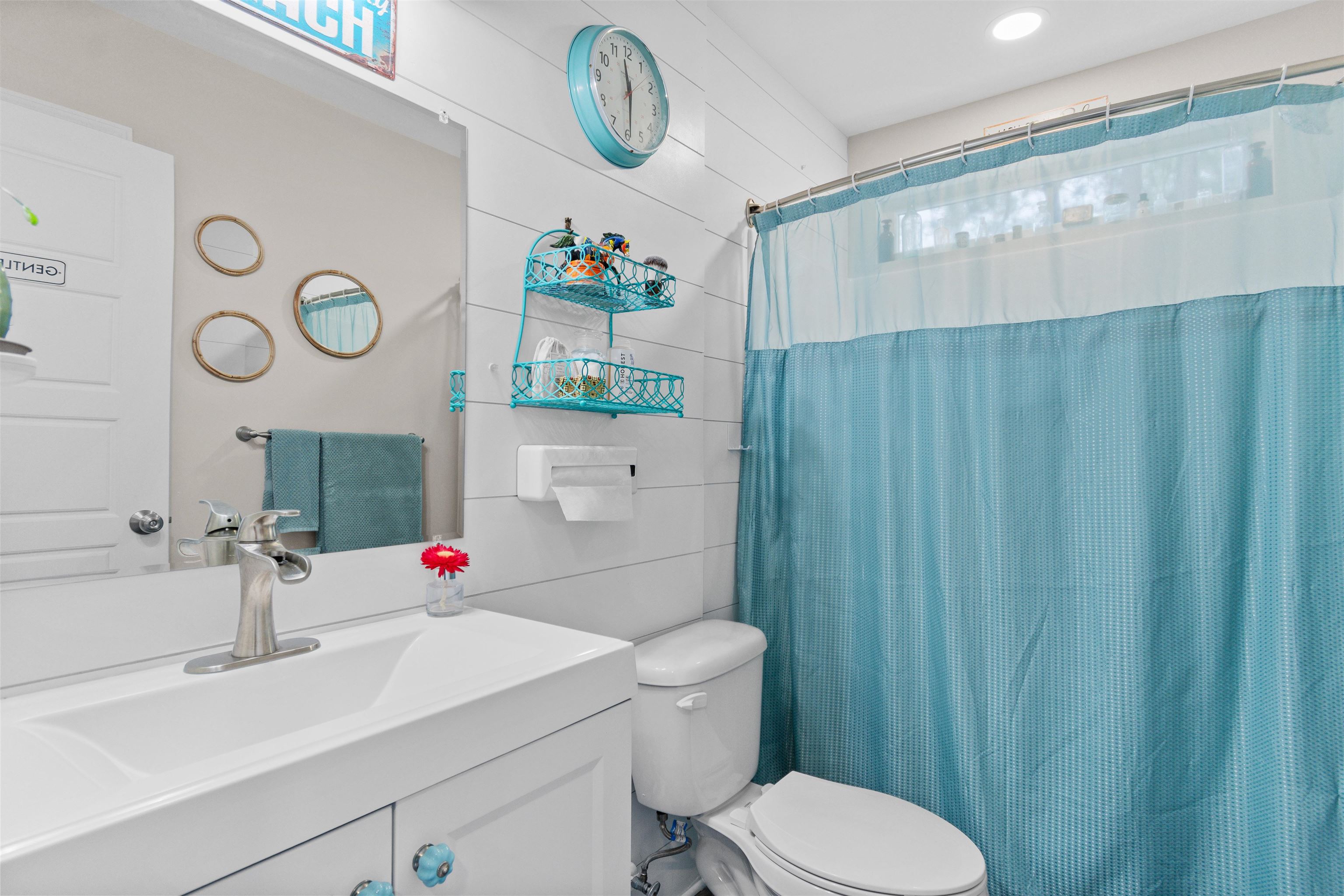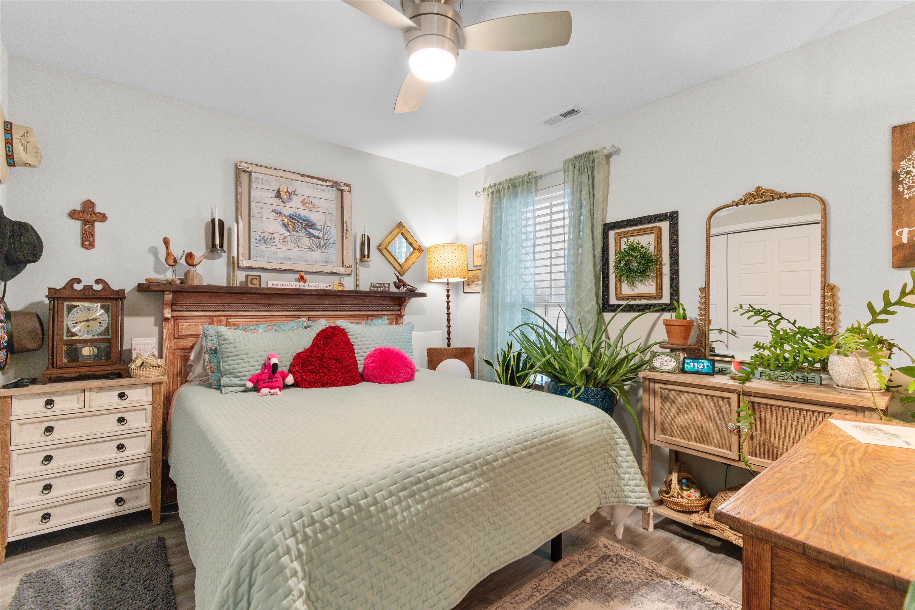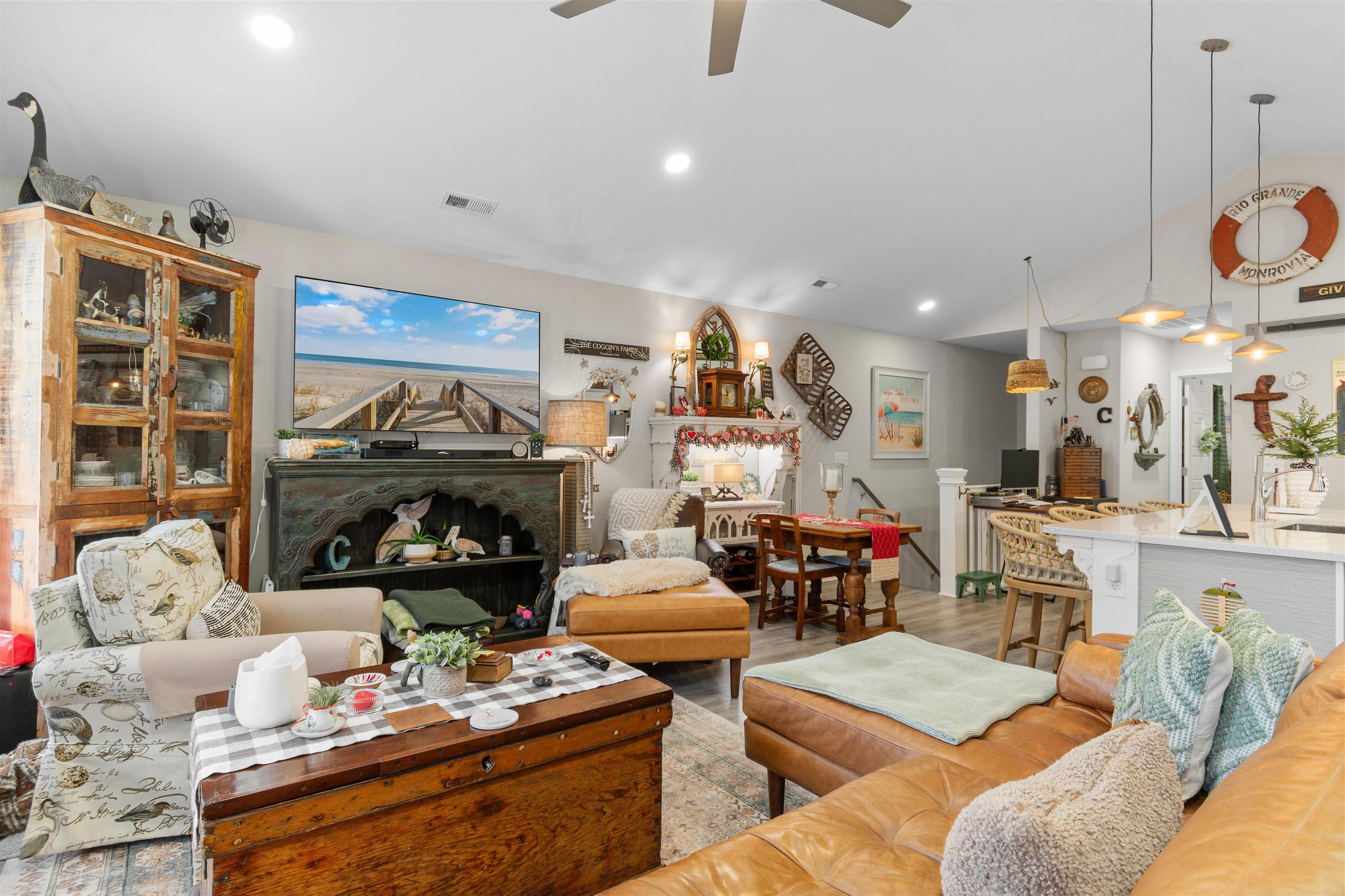 Built in 2020, this well-maintained raised beach home offers 3 bedrooms and 2.5 bathrooms in a prime Murrells Inlet location, just a golf cart ride to the beach and one mile from the Garden City Pier. The first floor includes two bedrooms and a full bathroom, while the upper level features the primary suite with en suite bath, along with the main living areas, dining space, and a convenient half bath. The living space is bright and welcoming, highlighted by vaulted ceilings in the great room, kitchen, and primary bedroom. The open layout features laminate flooring throughout the main living areas with tile flooring in wet areas. The kitchen includes white cabinetry, quartz countertops, a subway tile backsplash, a farmhouse sink, stainless steel appliances, a built-in ice maker, and a large center island. Shiplap accents throughout the home, plantation shutters on the second level, and a barn door to the walk-in laundry room add warmth and coastal character. Enjoy outdoor living on the private backyard Trex deck, with access from the side door or side pathway. Parking under the home provides flexible space, with additional off-street parking beside and in front of the home. Community amenities include a pool, and the HOA includes exterior insurance. Located in desirable Murrells Inlet, close to beaches, dining, and coastal attractions, this move-in-ready home offers a well-balanced blend of comfort, style, and coastal lifestyle.