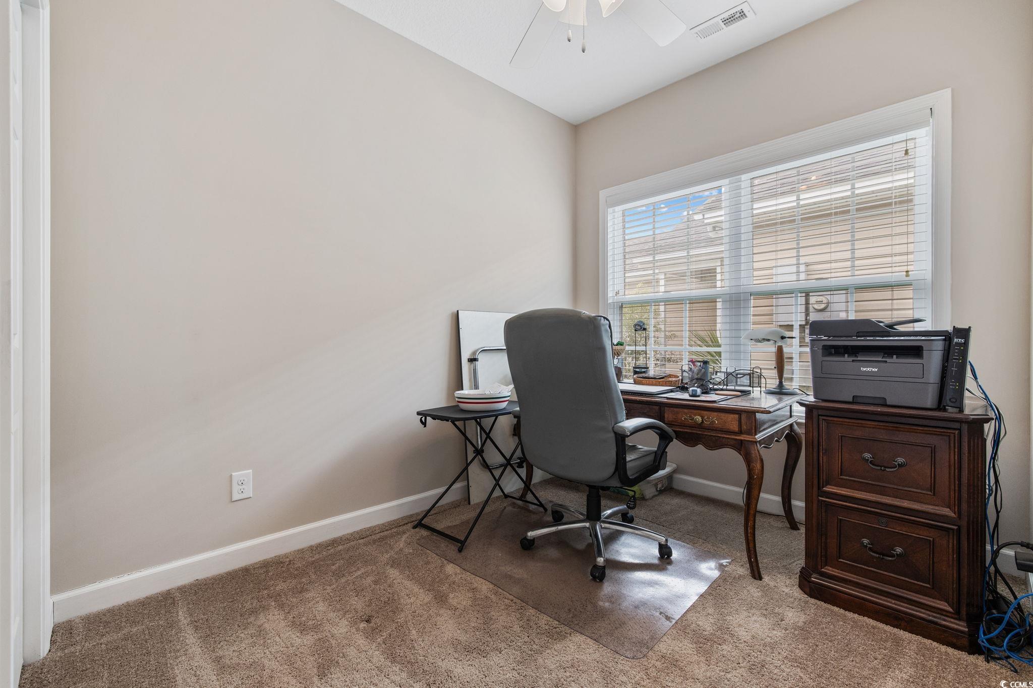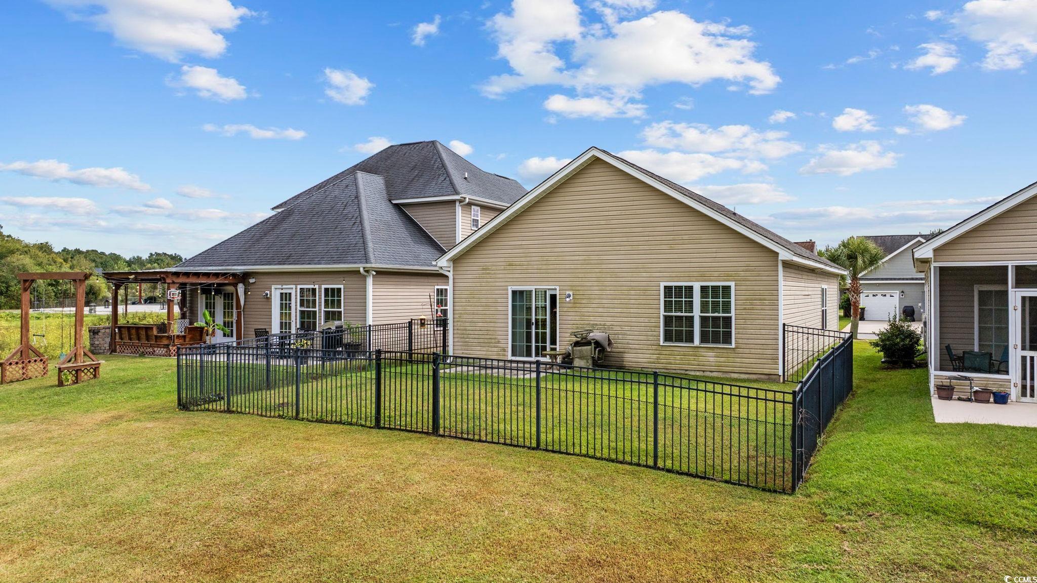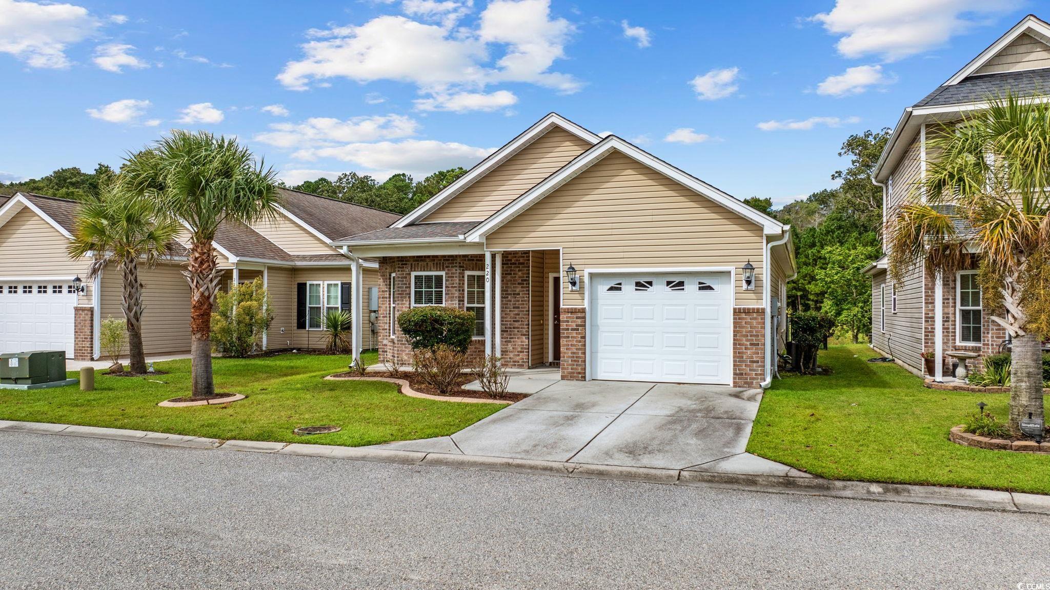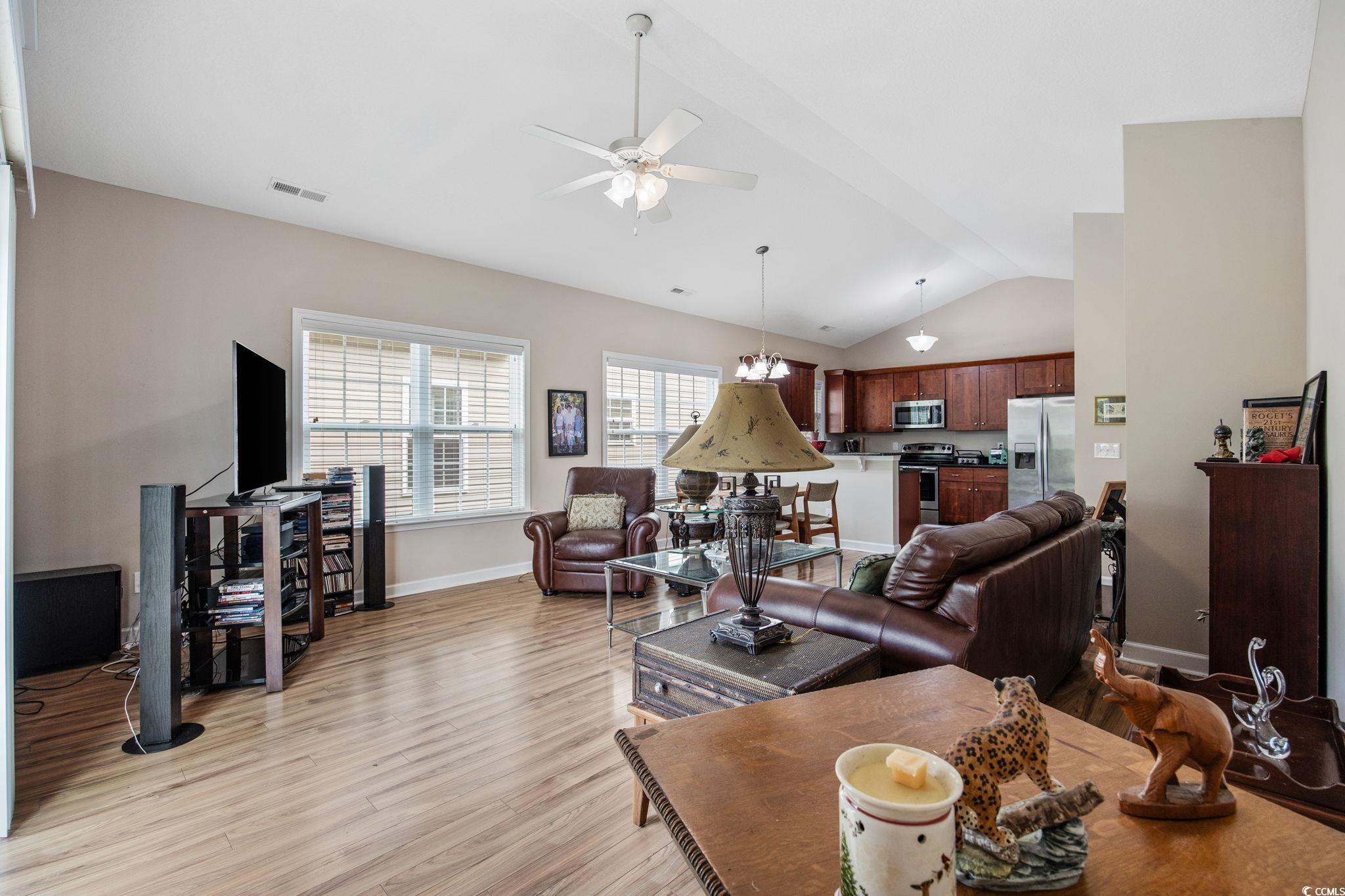 Welcome to this charming 3-bedroom, 2-bath home located in the desirable Palm Cove community! Step inside to find a bright and open floor plan featuring vaulted ceilings in the living room and kitchen, LVP flooring in the main areas, and tile in the kitchen and hallway. The kitchen boasts granite countertops, stainless steel appliances, and plenty of cabinet space. The spacious master suite offers a tray ceiling and peaceful pond view. Enjoy relaxing or entertaining on the outdoor patio overlooking the fenced-in backyard. Additional features include ceiling fans in every bedroom and the living room, laundry hookups in the 1-car garage, and carpeted bedrooms for comfort. Conveniently located just off Hwy 17 Bypass, south of the Farrow Parkway entrance to Market Common, this home offers easy access to shopping, dining, and the beach.