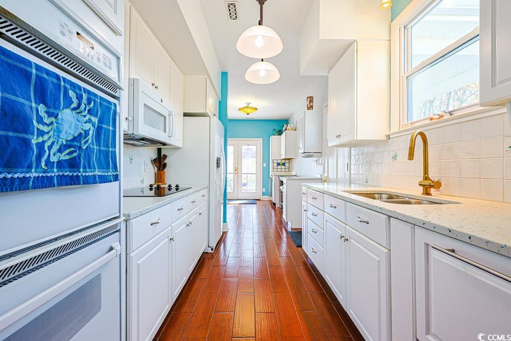 This stunning one-of-a-kind 4 bedroom, 3 bath Victorian-style home is perfectly positioned between Coastal Carolina University, the Hackler Golf Course, and Conway Medical Center, all within the established and highly sought-after Coastal Heights community—with NO HOA restrictions. Lovingly maintained and extensively updated by the current owners over the past 21 years, this home is truly move-in ready. Situated on an extra-large lot, the property offers ample space to build your dream garage or swimming pool, plus an oversized driveway with room for an RV, boat, or golf cart. The fully fenced backyard is a private oasis featuring mature landscaping, fruit-bearing trees, perennial flowers, and serene outdoor living spaces. Enjoy peaceful sunrises from the expansive back deck or relax under the pergola beside the outdoor fireplace. Inside, the home is filled with warmth and character, offering a cozy living room with a fireplace, open staircase, and a formal dining room highlighted by a beautiful stained-glass door leading to the kitchen. The kitchen is a showstopper with quartz countertops, a double drawer dishwasher, double oven, upgraded cabinetry, and a walk-in pantry complete with additional storage and a beverage cooler. The main level also includes a spacious bedroom and an elegant bathroom with a classic clawfoot tub. Upstairs, the primary suite features a jetted tub, separate shower, and an attached bonus room ideal for a home office, nursery, or sitting area. Two additional bedrooms and a full bathroom complete the second floor. A detached, heated, cooled, and insulated she-shed / flex space offers two rooms filled with natural light and currently houses a sauna. This versatile space is wired with a 50-amp box and 220 circuit, making it ideal for a studio, craft room, private office, or guest retreat. Recent updates include Hardie Plank siding, new windows, a new roof (2020), updated HVAC systems, new decking, electrical upgrades, fresh interior and exterior paint, luxury vinyl plank flooring, quartz countertops, plantation shutters, fencing additions, and much more. This exceptional property blends timeless Victorian charm with modern updates and the freedom of no HOA, just minutes from the beach, Grand Strand attractions, shopping, dining, and medical facilities. Whether used as a primary residence or investment property, this home also allows short-term rentals.