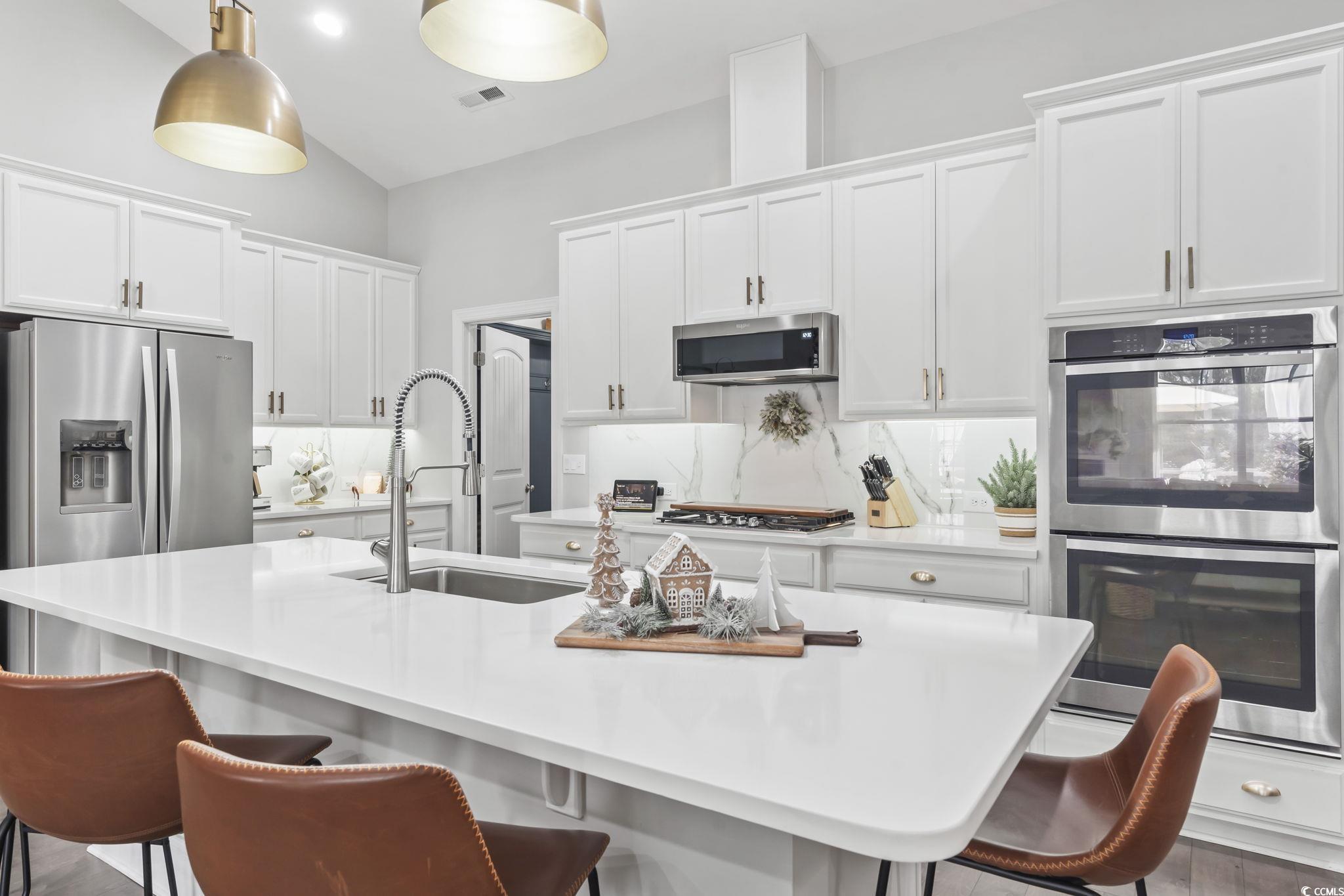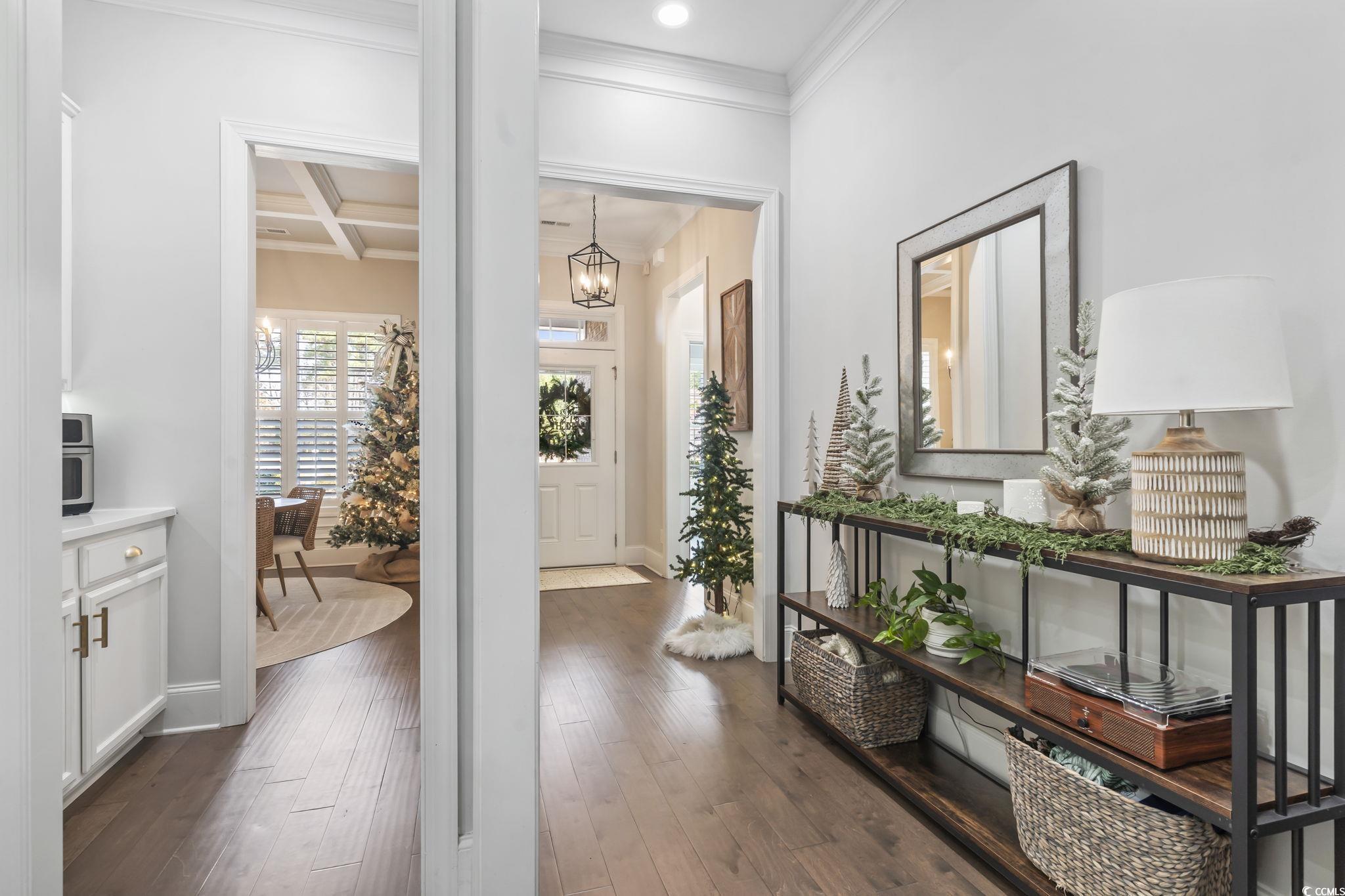 Looking for the perfect home in Wild Wing Plantation? Look no further! This stunning property delivers exceptional curb appeal from the moment you pull into the driveway. Mature landscaping, an irrigation system, custom paver-lined beds, walkway, and driveway, plus beautifully designed landscape and pathway lighting create a breathtaking first impression—day or night. The extended driveway has also been professionally sealed for UV protection and longevity. Step inside and be wowed by the grand entryway, 10’ ceilings, and wide-plank flooring that carries through the main living areas. To your right, the freshly painted formal dining room features elegant wainscoting, a coffered ceiling, and double front windows with custom shutters. (All front-facing windows—garage included—feature the same custom shutter upgrade.) The heart of the home boasts an impressive open floor plan with cathedral ceilings, filling the space with natural light. The split-bedroom design offers privacy for guests and family, with two spacious guest bedrooms plus an additional front room that can serve as a home office or fourth bedroom. The gourmet kitchen is a true showstopper—complete with stainless steel appliances, natural gas cooktop, double oven, huge walk-in pantry, and an oversized island with seating for six. Recent upgrades include brand-new quartz countertops, new deep sink and faucet, porcelain tile backsplash, and updated the white cabinetry with gold hardware. The living room is warm and inviting with a gas fireplace and double windows and doors that brighten the entire space. Retreat to the incredible master suite, featuring freshly painted tray ceilings, new board and batten accent wall and a luxurious ensuite.The ensuite features granite counters, dual sinks, walk-in tile shower, and a custom walk-through closet that connects directly to the laundry room—an amazing convenience you'll love. The oversized 2-car garage provides ample storage with shelving above the door, floored attic space, additional outlets, finished floor and an EV charger. Outdoor living is where this home truly shines. Enjoy a relaxing covered front porch, or unwind on the tiled, screened-in back porch with custom shades. Step down to a 20x20 custom paver patio overlooking the serene lake—perfect for entertaining or simply taking in the view. The fully fenced backyard allows easy access for kayaking right from your property, and motorized boats can be launched from the community storage area. Located in the private, amenity-rich community of Wild Wing Plantation, residents enjoy tennis and pickleball courts, a resort-style pool with waterslide, playground, basketball court, and access to a beautiful golf course. All of this just minutes from the Grand Strand’s premier dining, shopping, golf, entertainment, and, of course, the beach. Don’t miss this one—homes like this don’t last long! (All measurements and square footage are approximate and not guaranteed.)